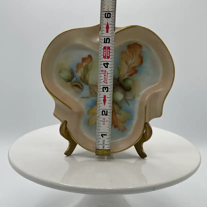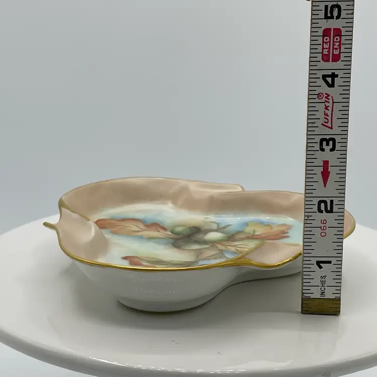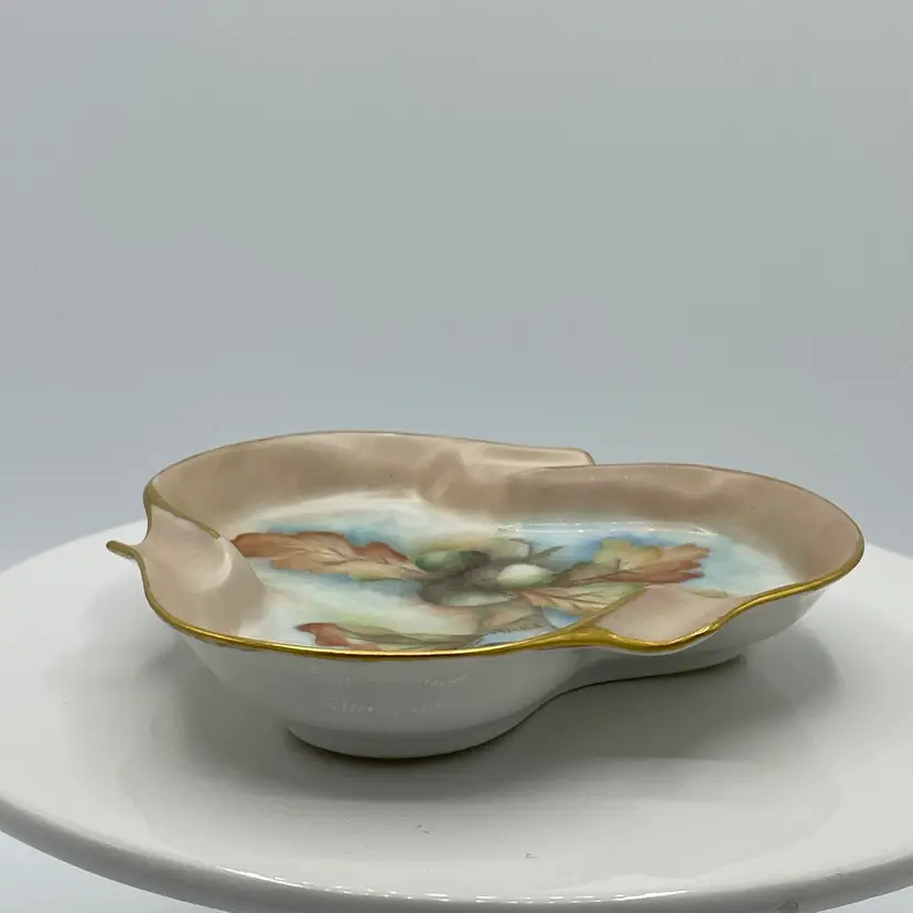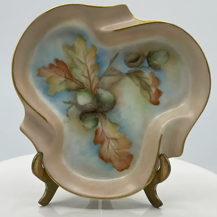 Acorn and leaves w/ gold edging. Artist signed