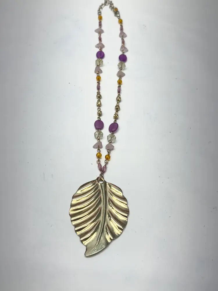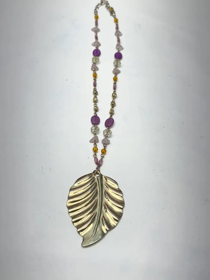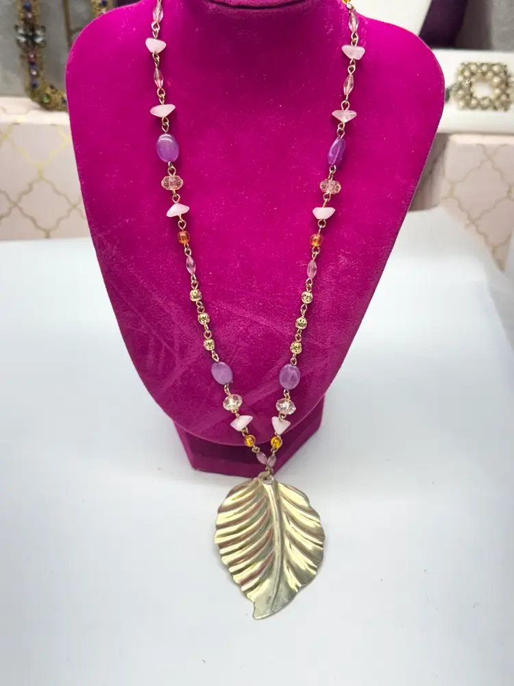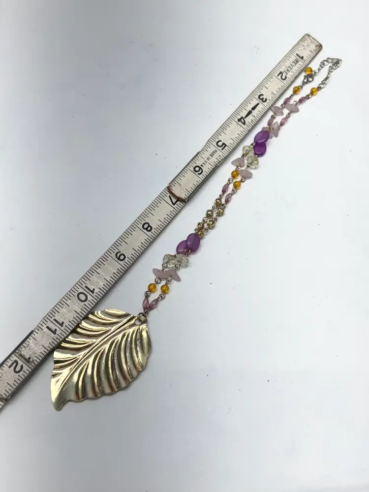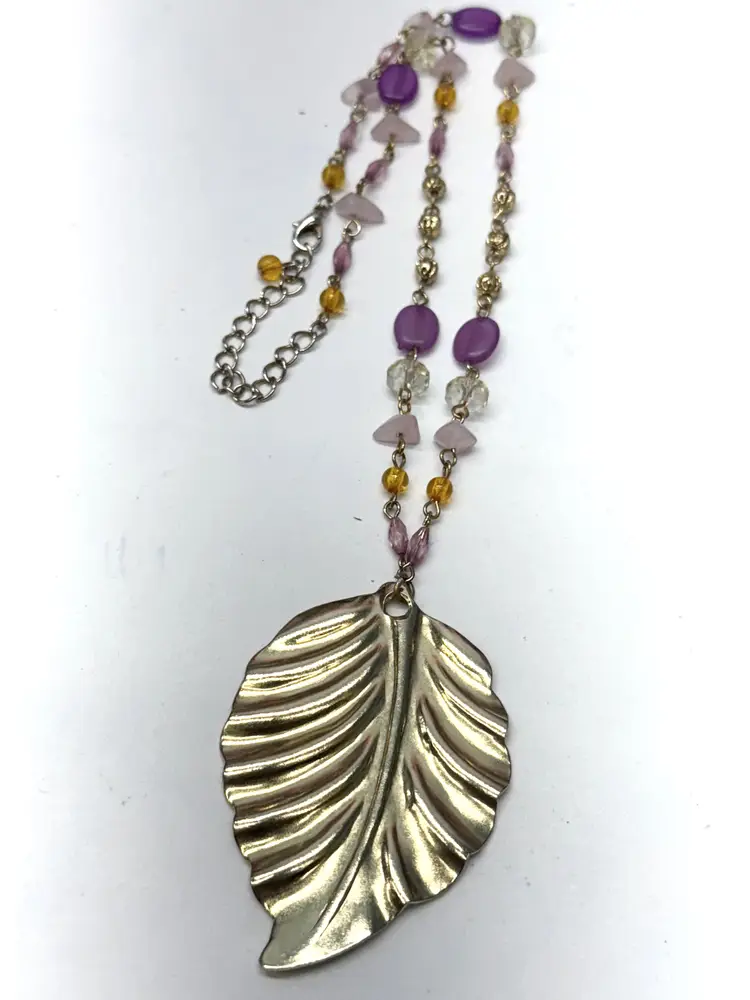 Vintage acrylic crystal chain beaded leaf pendant necklace. Pendant necklace with acrylic crystals. Extension chain at end. Vintage necklace. Gold tone leaf pendant. MN53GH.