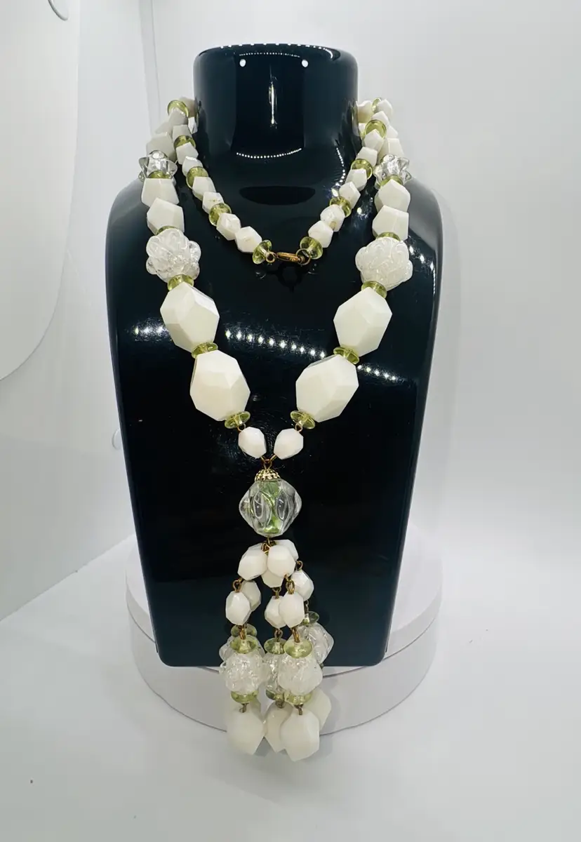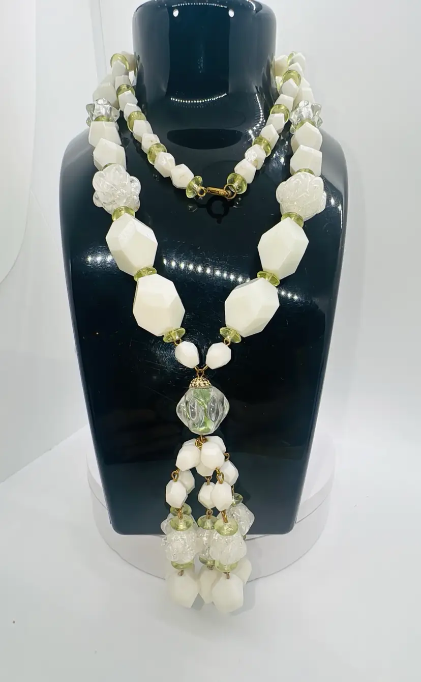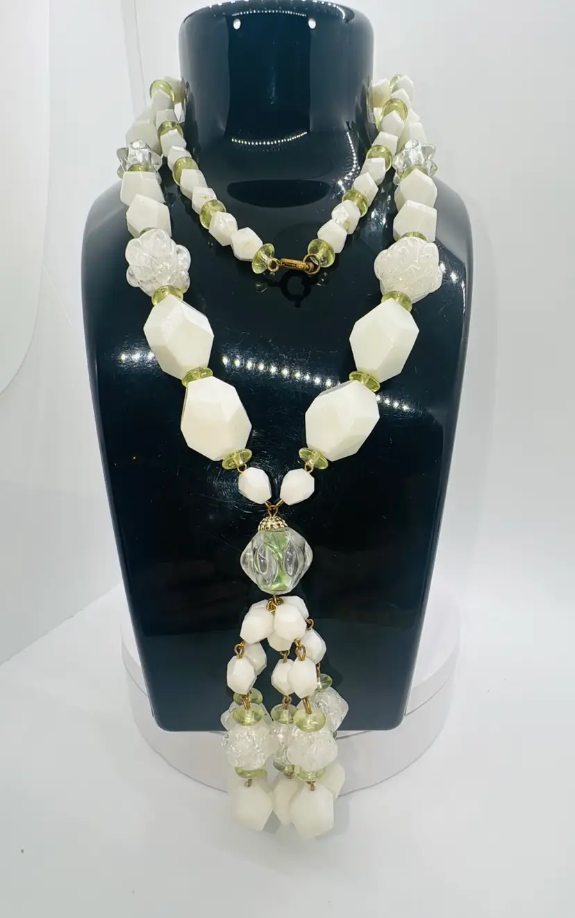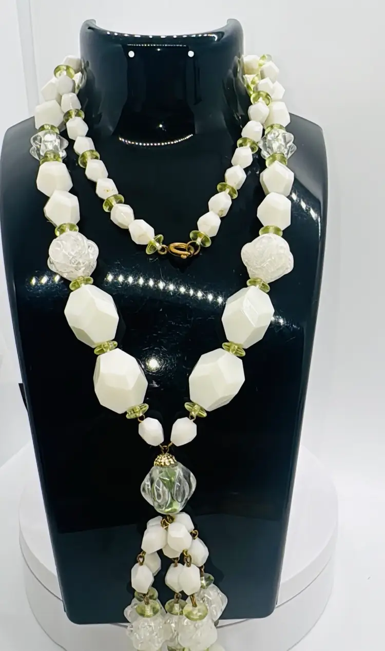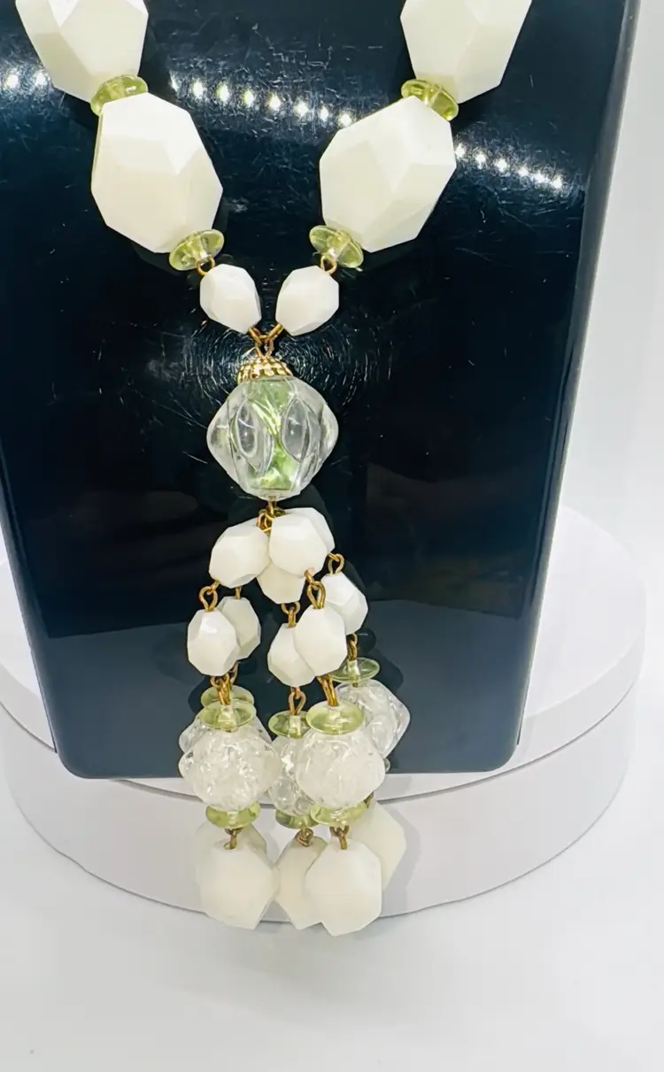 White and clear acrylic beads. Needs a clean or wipe down. The largest clear acrylic bead has a greenish center bead. Lightweight. The necklace is 24 inches end to end not counting tassel. Spring ring clasp. 12