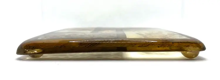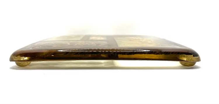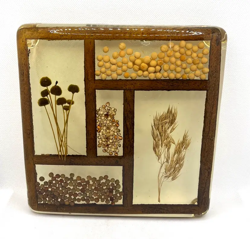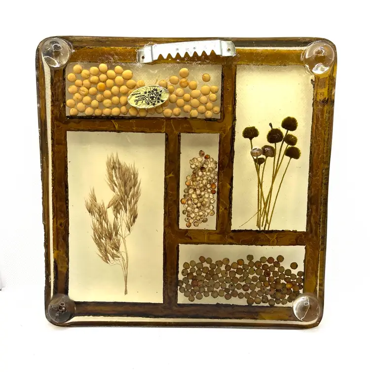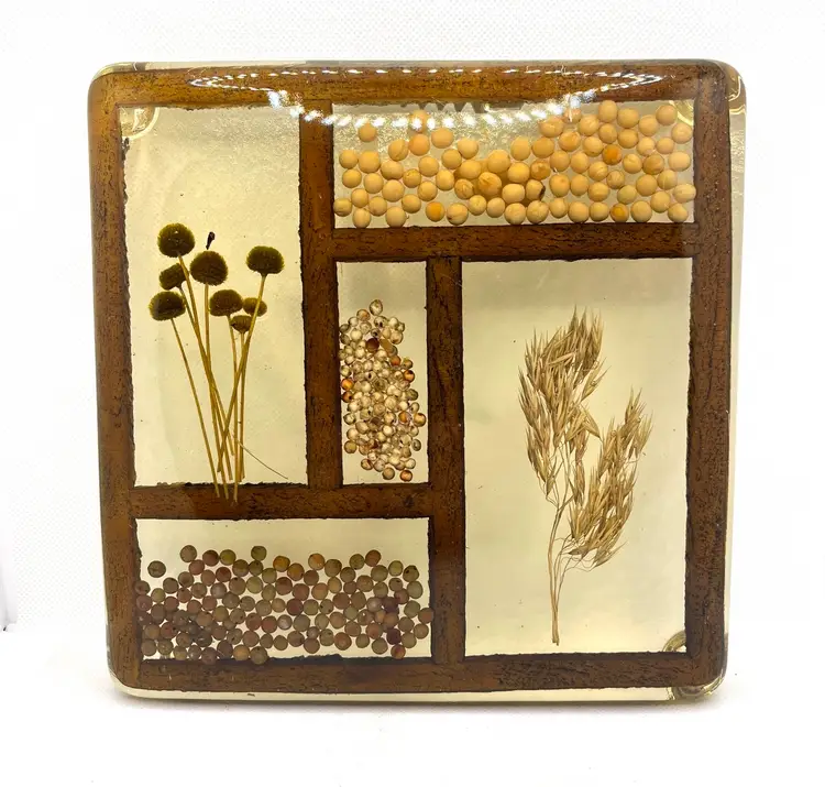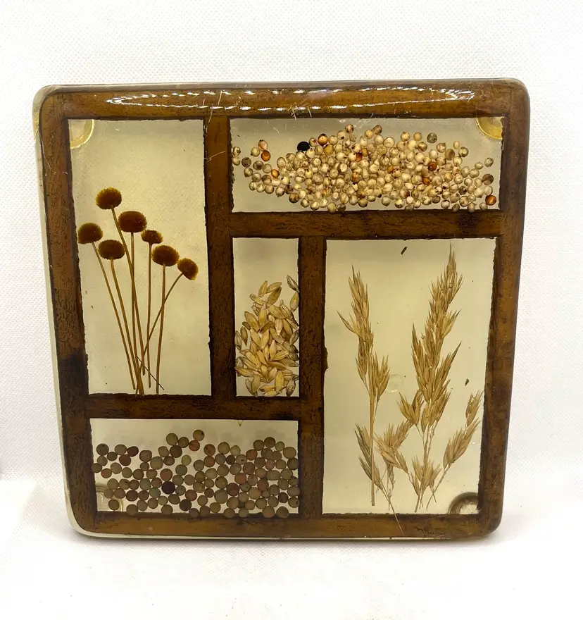 Vintage Colorflo Acrylic Lucite Dried Flowers Seeds Grains Wheat Footed Counter Trivet Spoon Rest. Approximately 8” x 8” square with vintage wear and patina. No chips or breaks.