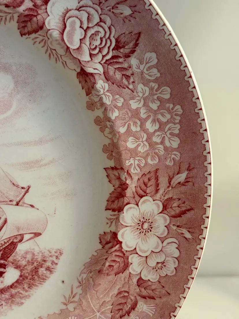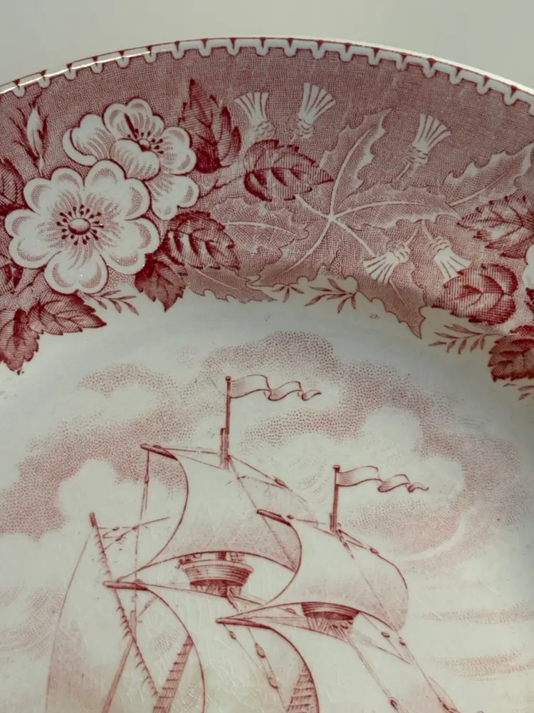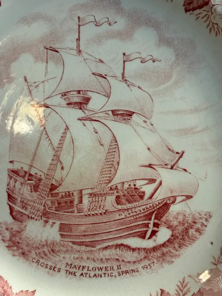 Pattern/Design: Features a red/pink transferware print of the Mayflower II ship in the center, surrounded by a detailed floral rim.