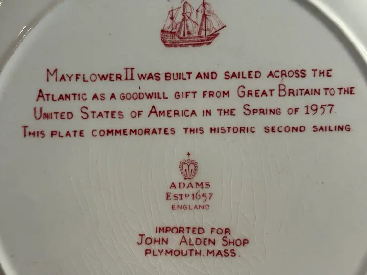 This vintage collectible is an Adams Staffordshire "Mayflower II" commemorative plate, registered in 1957 to celebrate the ship's historic journey from Great Britain to the United States.