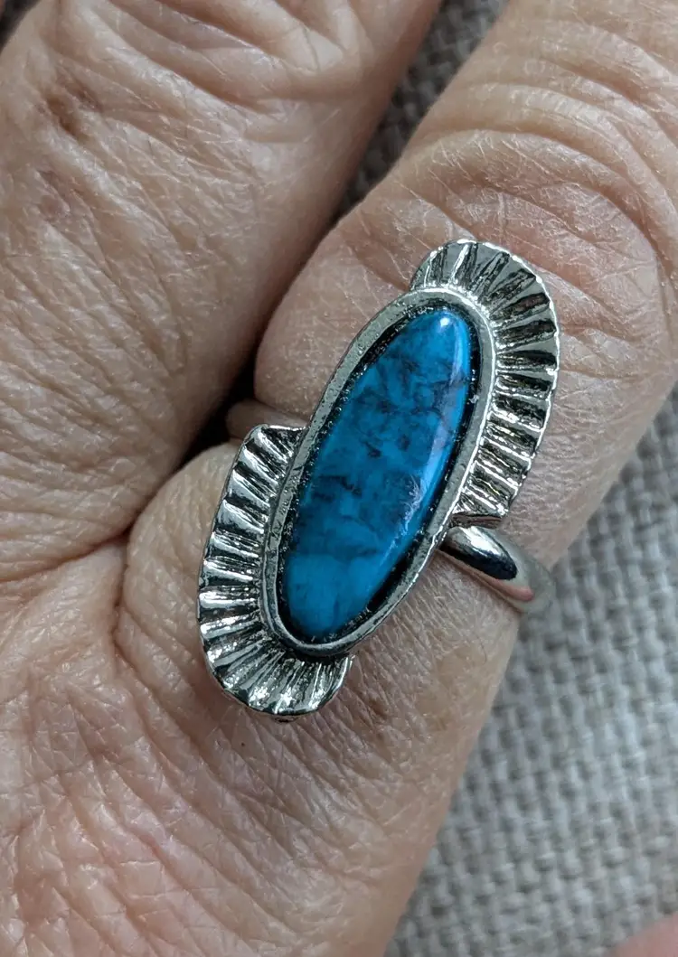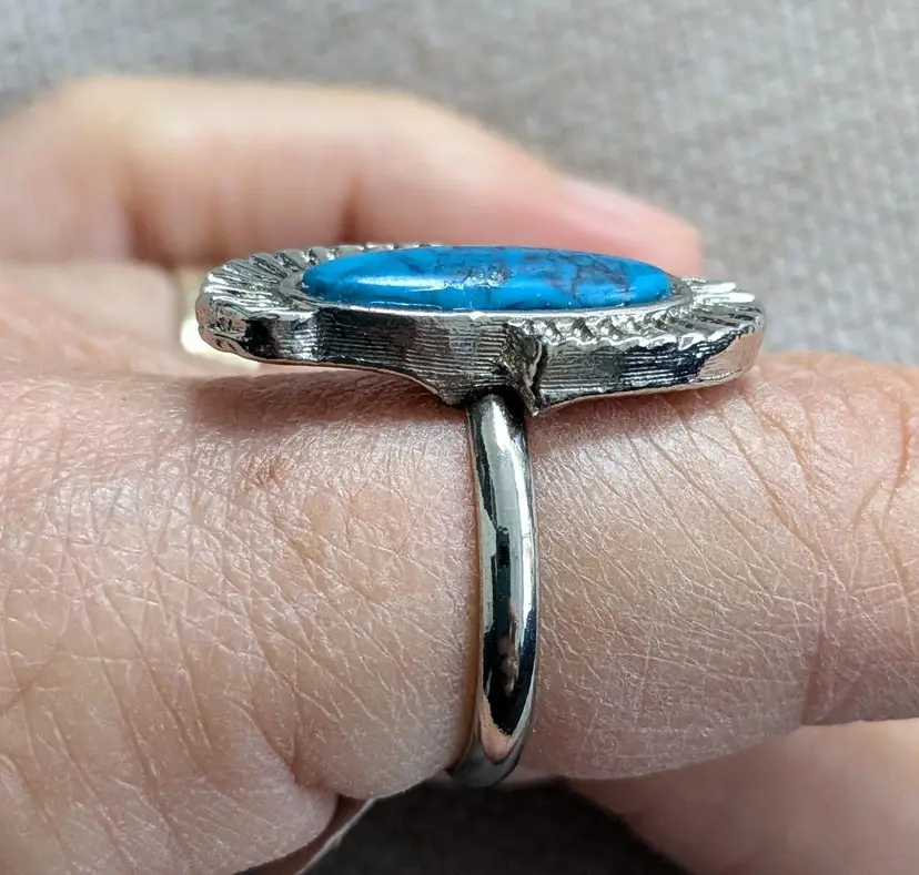 The face of the ring is 1 inch long. Adjustable currently a size 7.5. Unmarked