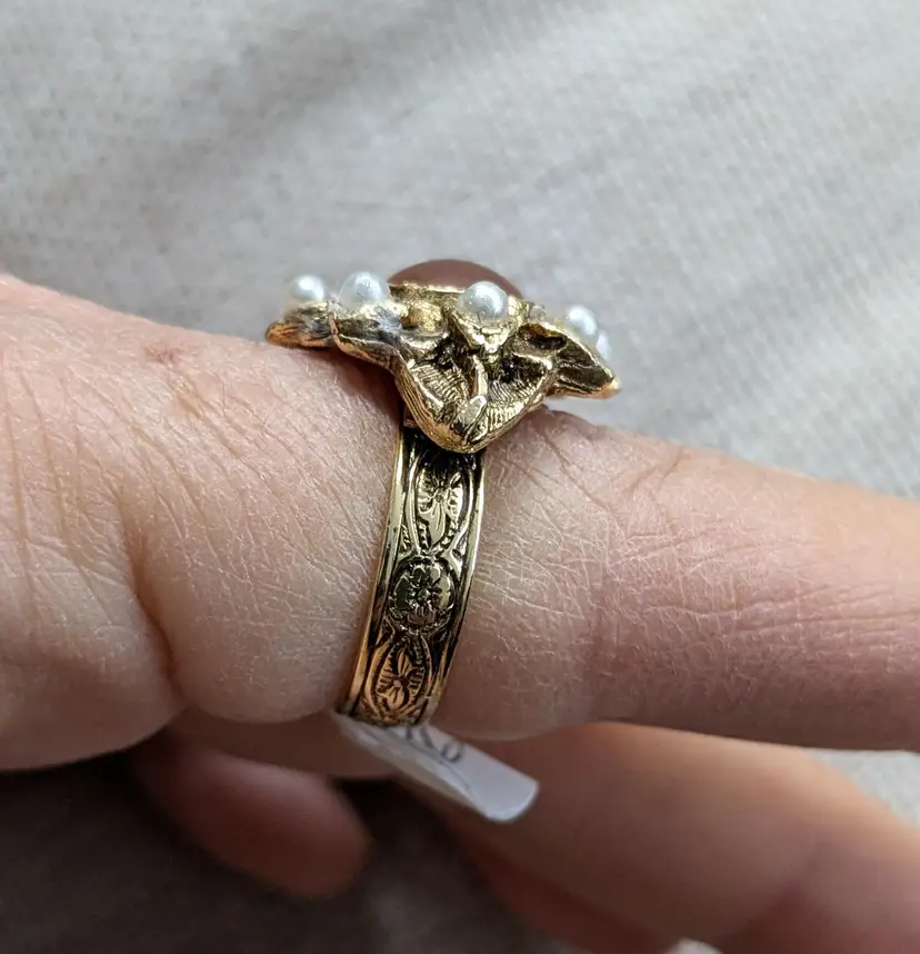 The face of the ring is 3/4" across. Decorative band. Unmarked. Adjustable, currently a size 6.5.