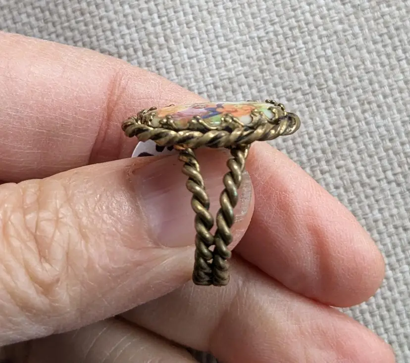 The face of the ring is 7/8" long. Cabachon is prong-set. Band is braided. Adjustable, currently a size 6. Marked W Germany.