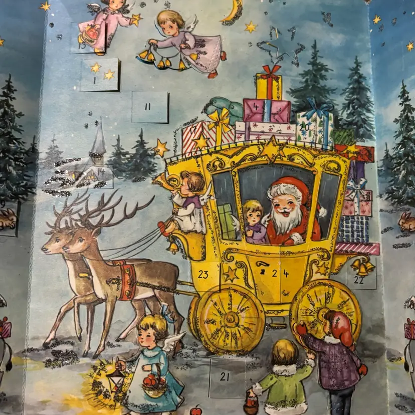 The colours! The details! Oh my! Vintage, made in west Germany advent calendar. Each number flap opens to reveal a delightful picture. In over all good vintage condition ~ 7.75x10.75”