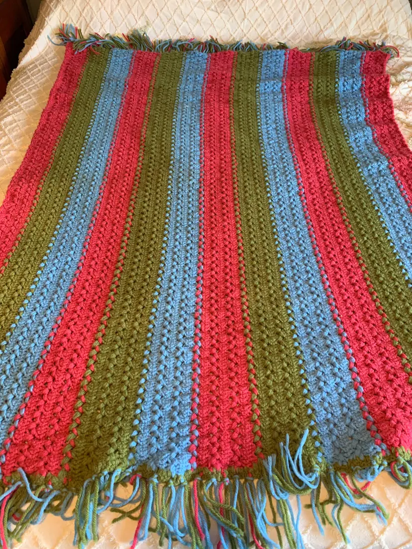 Vintage Afghan green, blue and pink. VGVC. No issues found. 58 inches x 40 inches.
