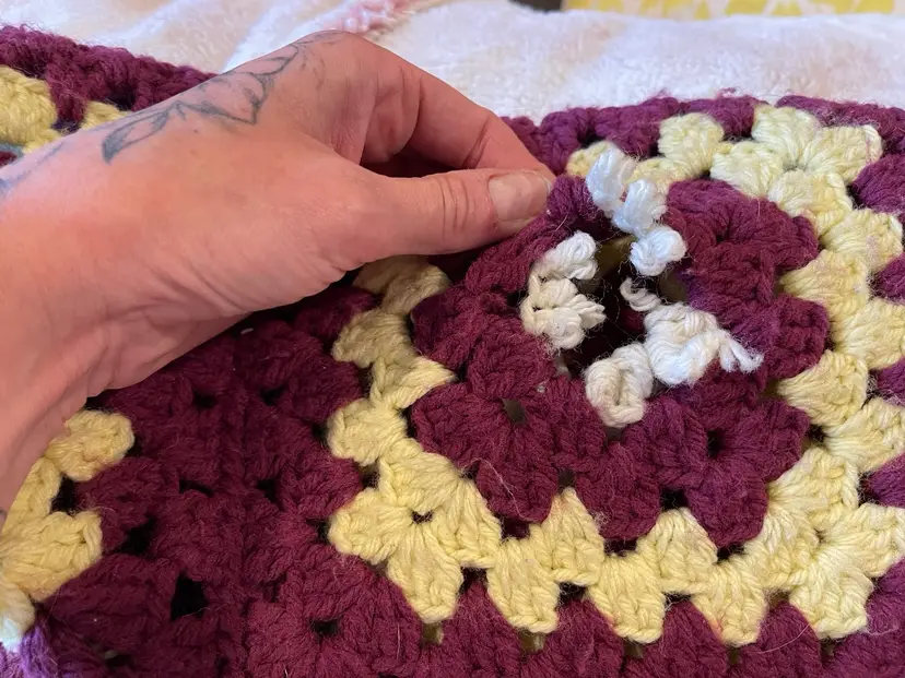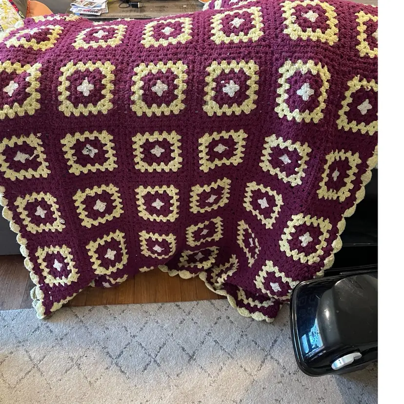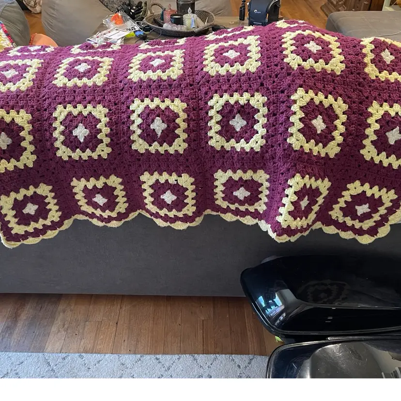 Vintage Purple and yellow afghan GVC, one area is broken as pictured 56 x 46
