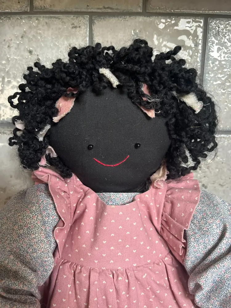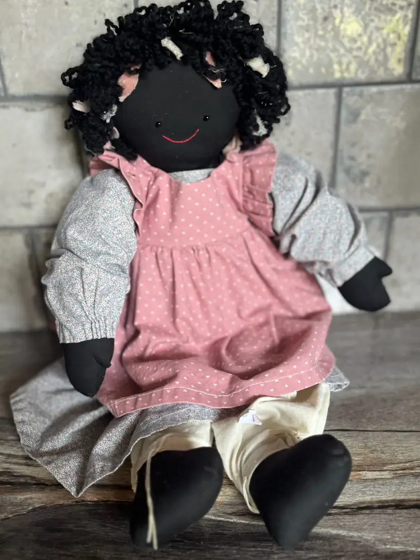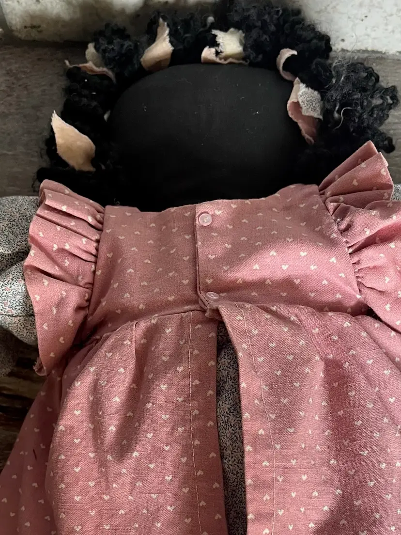A darling hand crafted vintage African American rag doll. She is approximately 14 inches tall. Very good condition. All buttons are there. No tears in any of her clothing. I have not washed her.