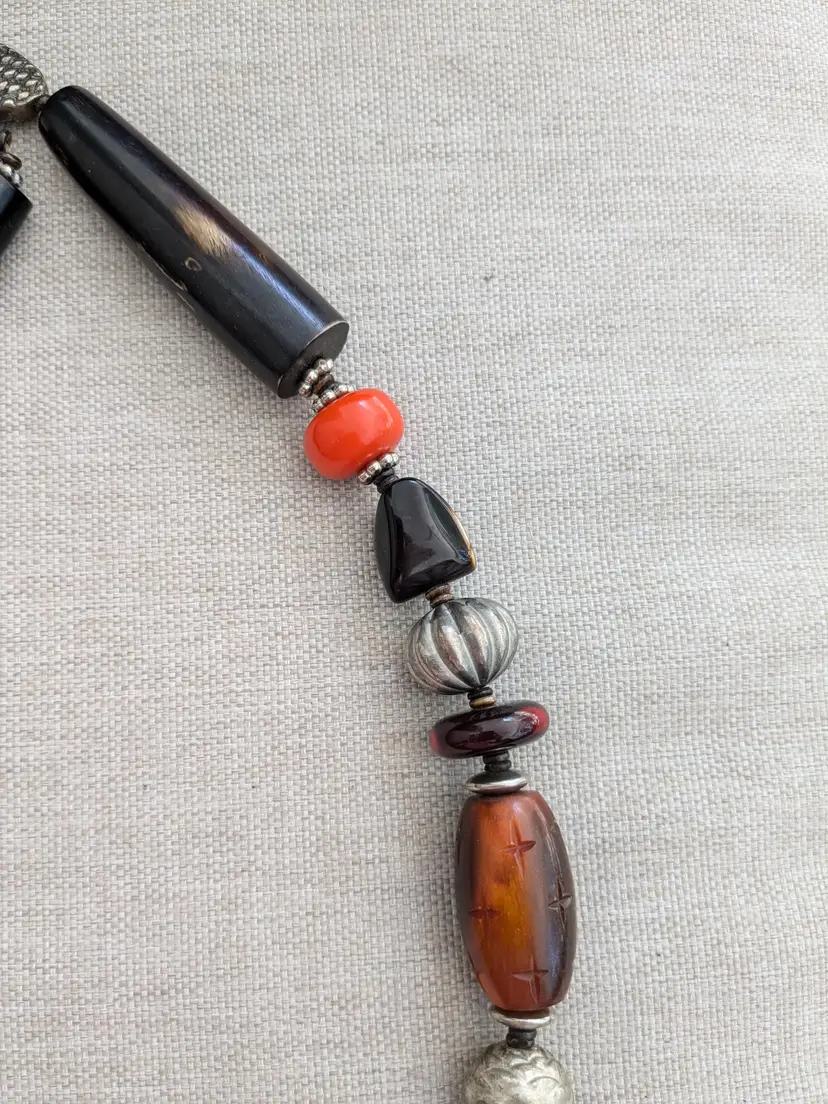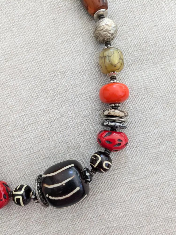 A bountiful array of materials form the beads in this necklace. Deep browns, oranges, reds and silver tones. Unmarked