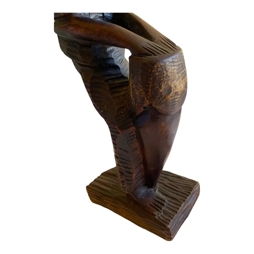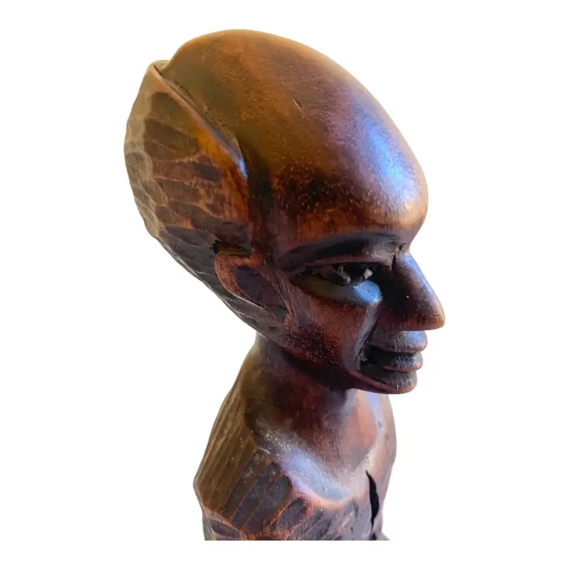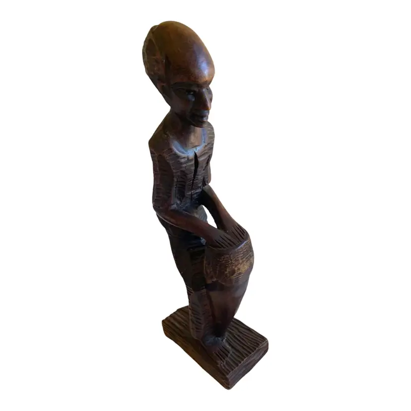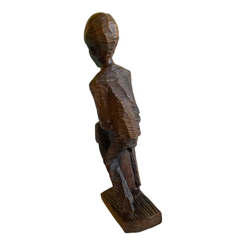 This vintage African wood statue depicts a man playing a drum and is a perfect example of hand-carved folk art. Measuring 12.5 inches in height, 4 inches in width, and 2.5 inches in length, this sculpture is made of high-quality wood and is an original piece. The unique craftsmanship of this statue is evident in the intricate details of the man's clothing and the drum he is holding.