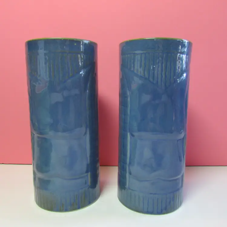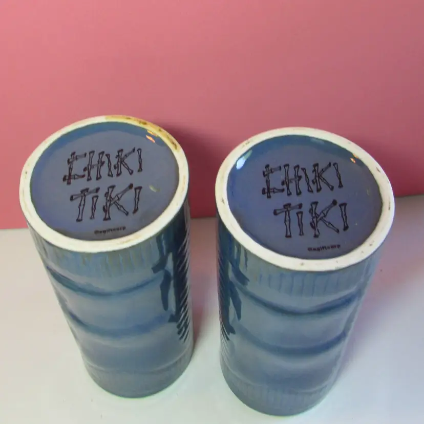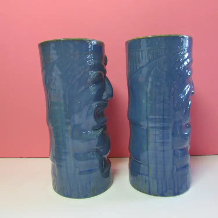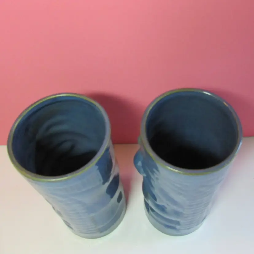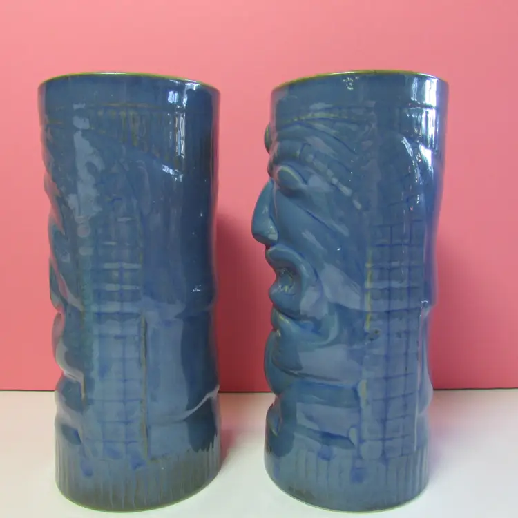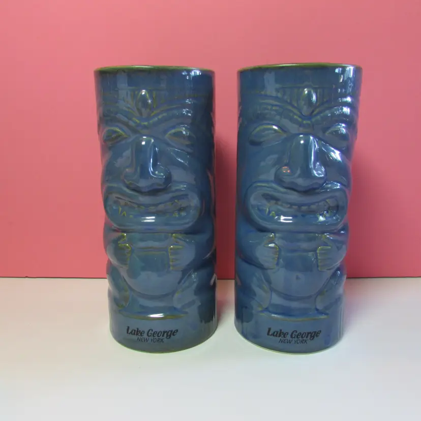 These fun cups have some wear, but still a great set to use and display. Each is about 6 1/4" x 3" x 2 3/4". This is shipped from a smoke free home. Thanks for looking!