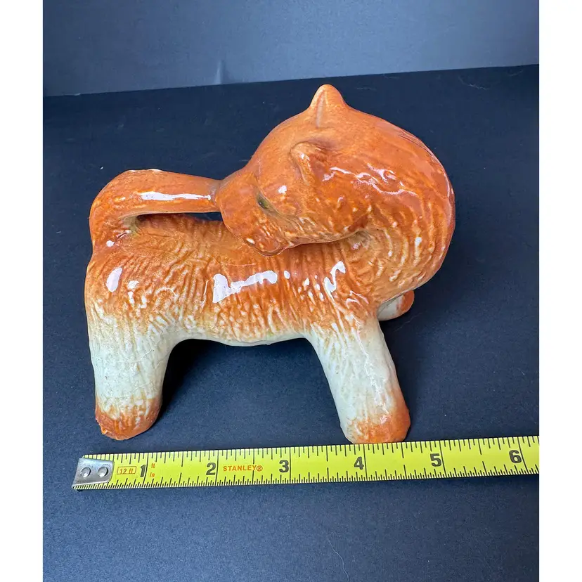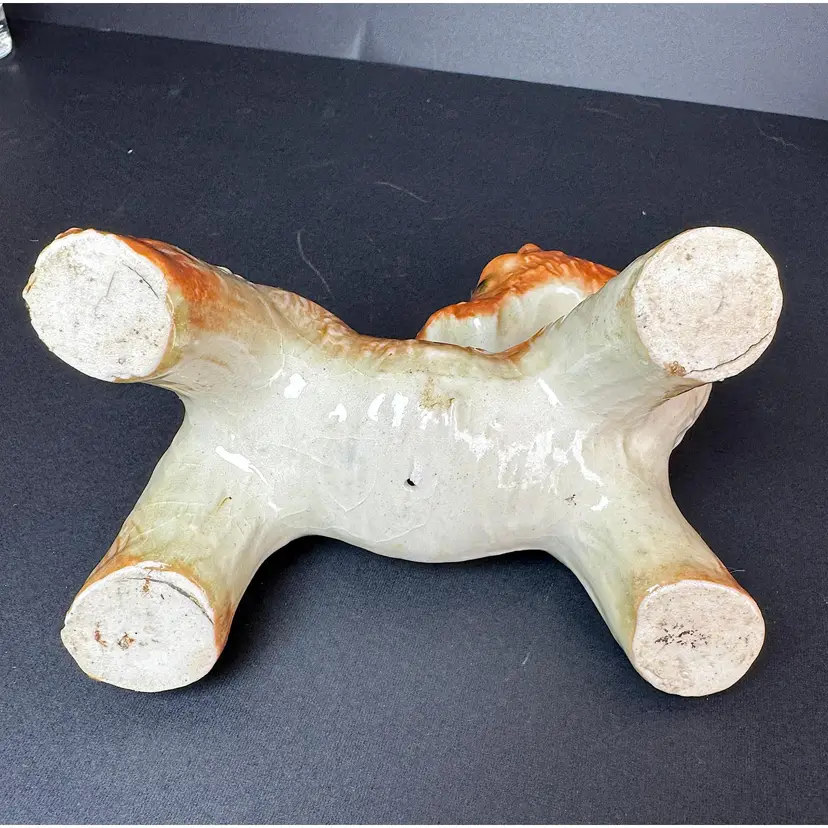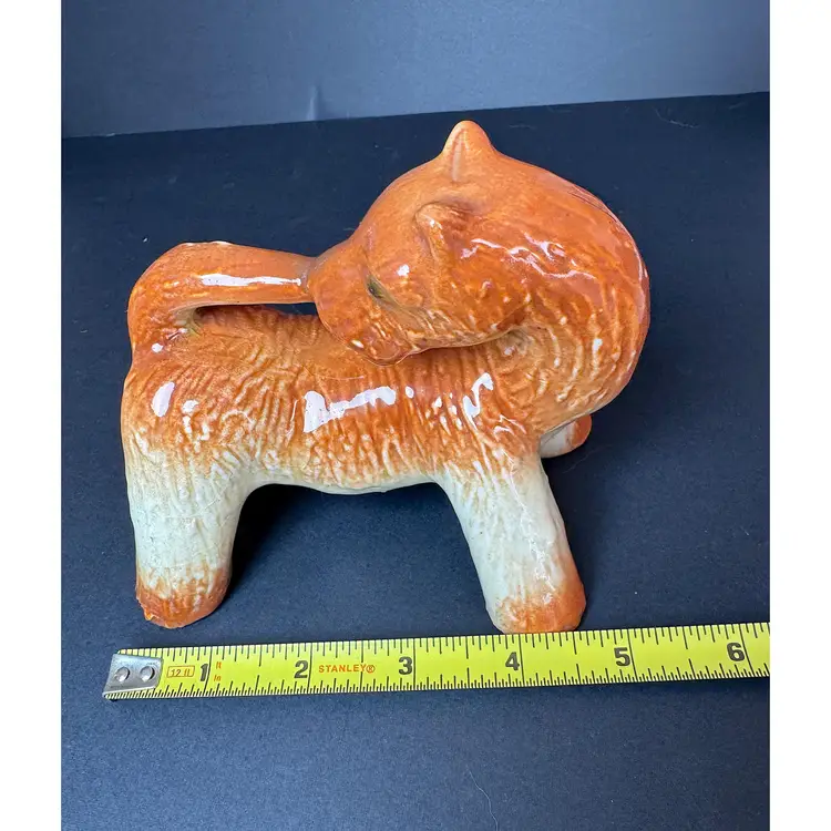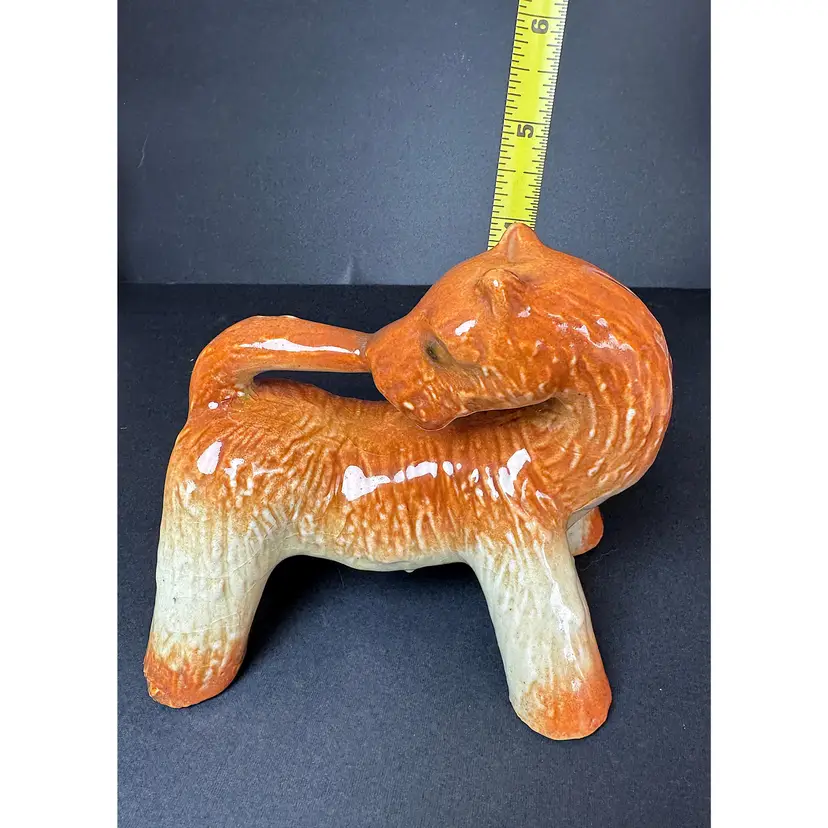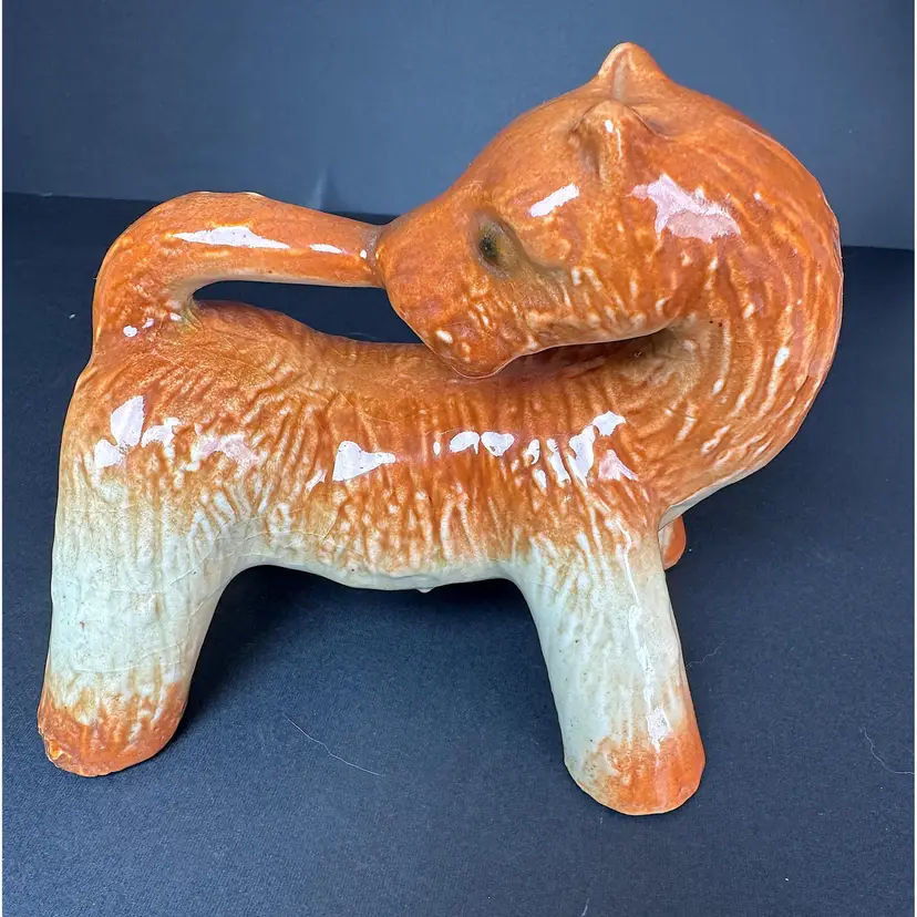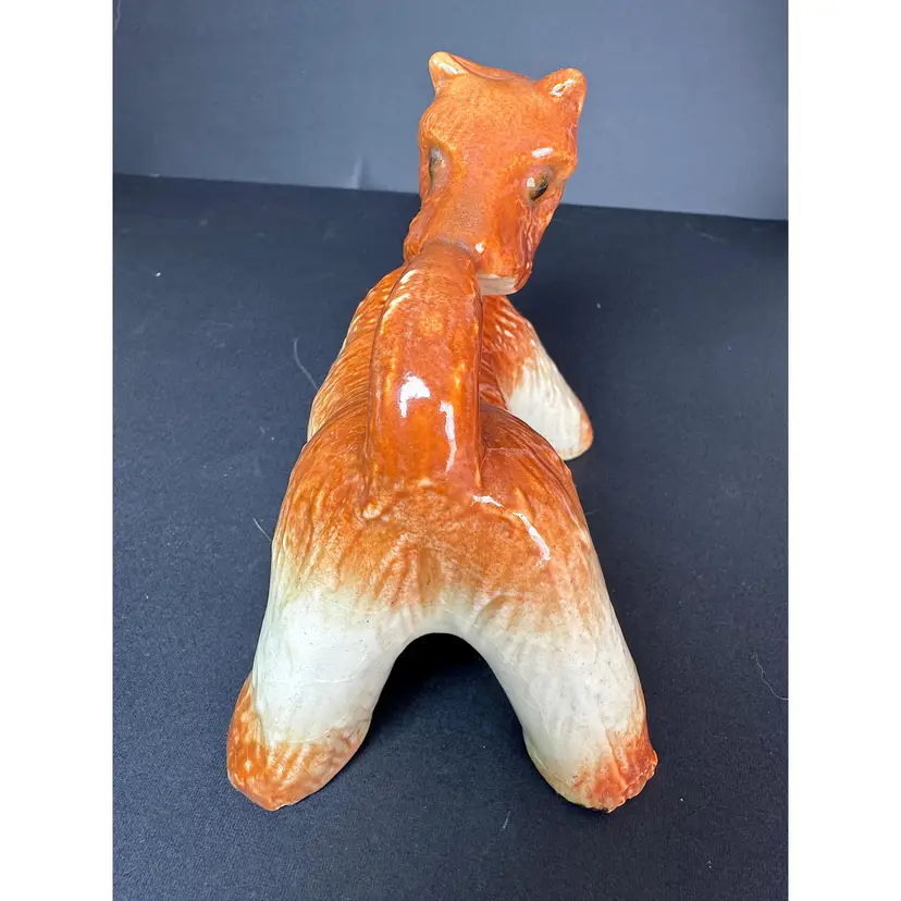 This adorable Airedale terrier figurine is biting his tail! Possibly made in Japan, he is orange and cream. A must have addition to dog lovers!