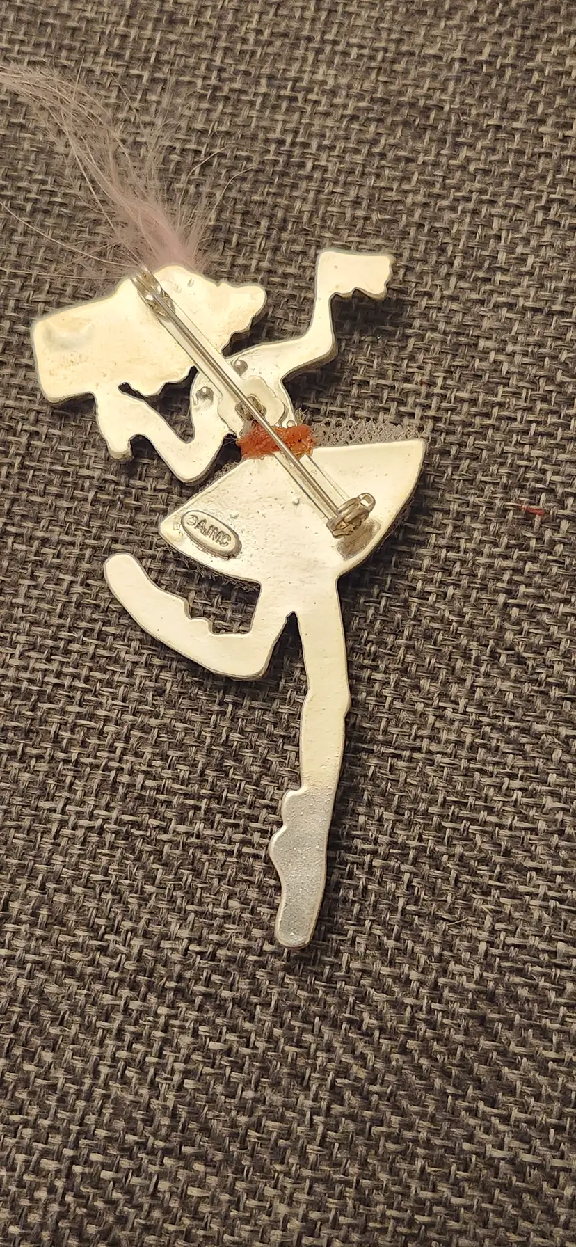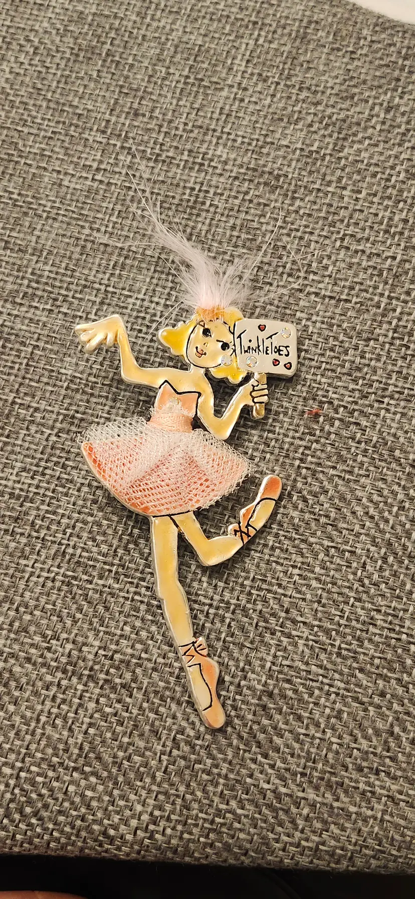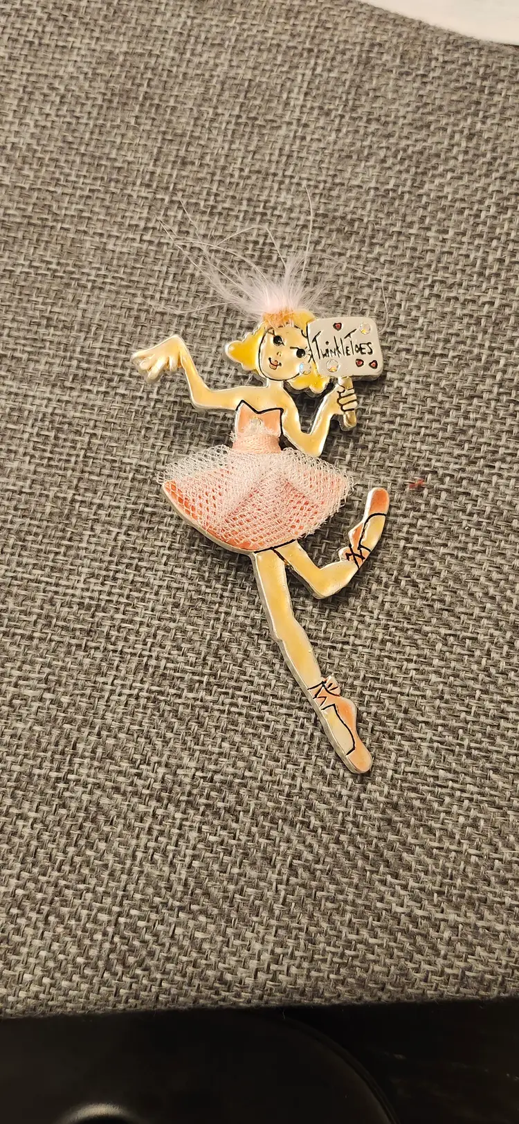 • This is an enameled brooch depicting a ballerina dancer. • The brooch features a pink enameled tutu and a sign held by tne ballerina that reads "TwinkleToes".