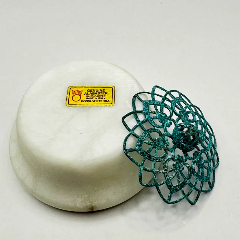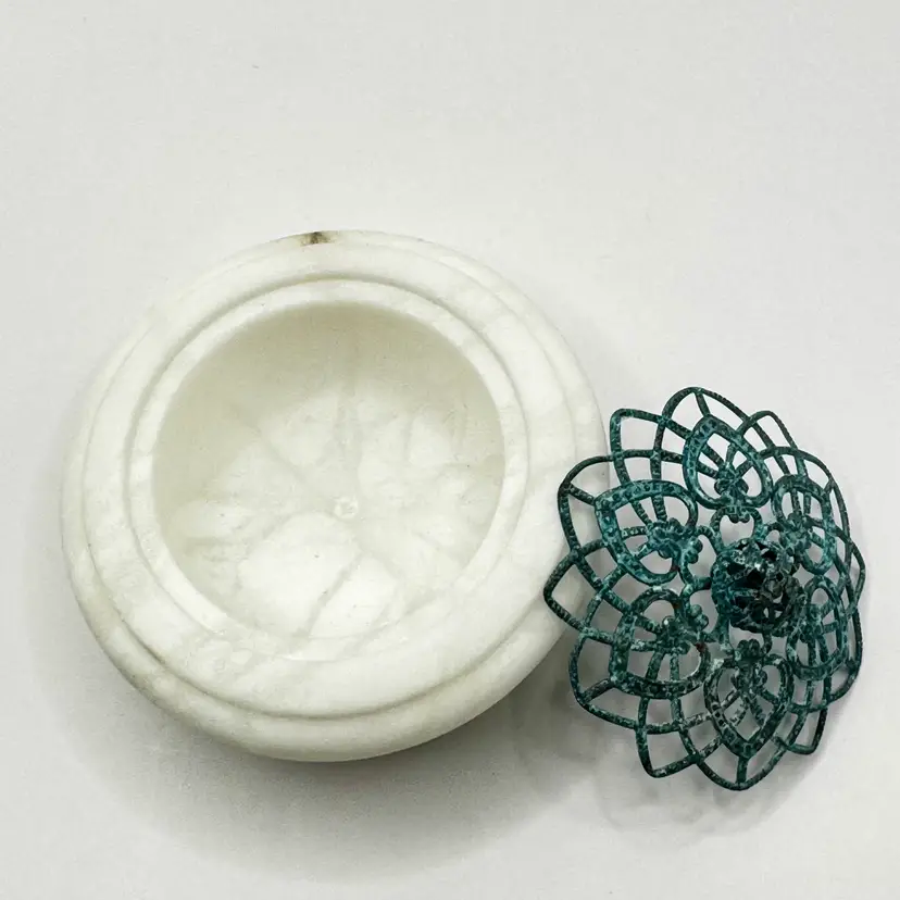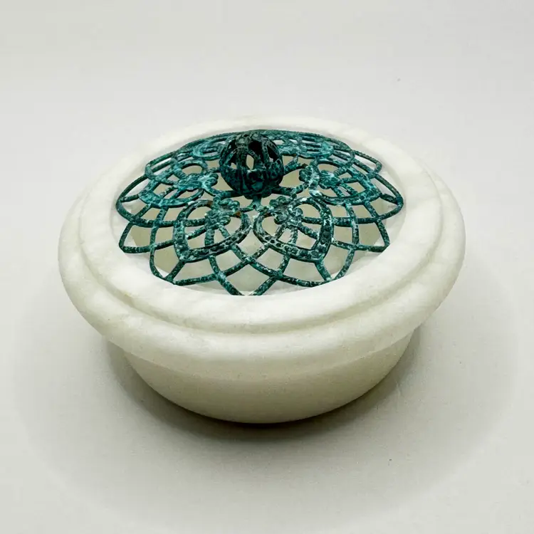 Gorgeous trinket box, metal filigree lid. No chips or cracks. Measures 3.25” Weights 2oz