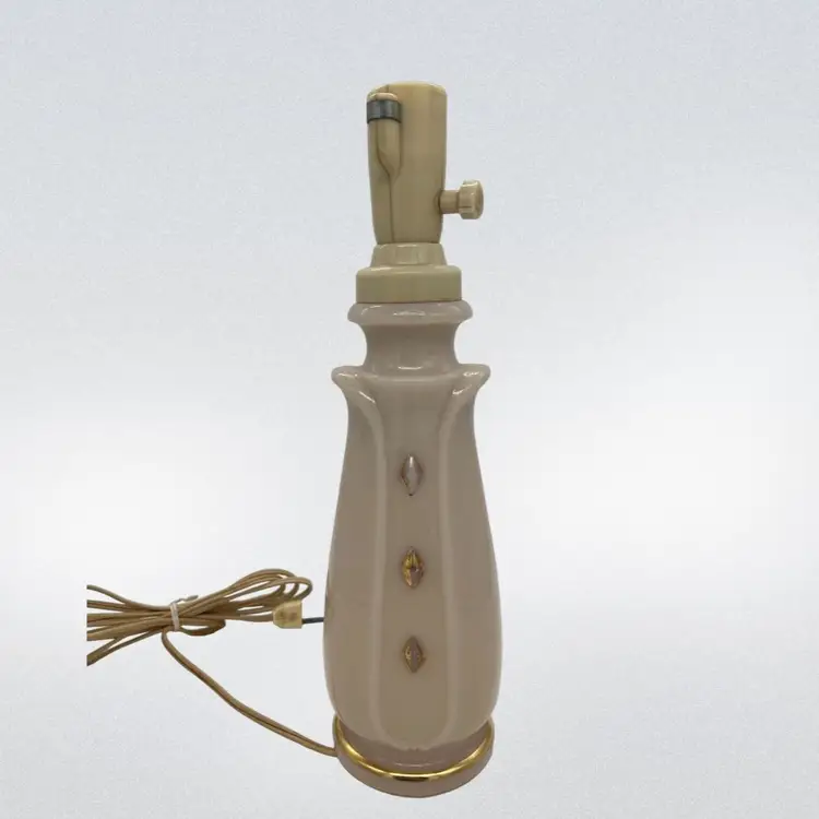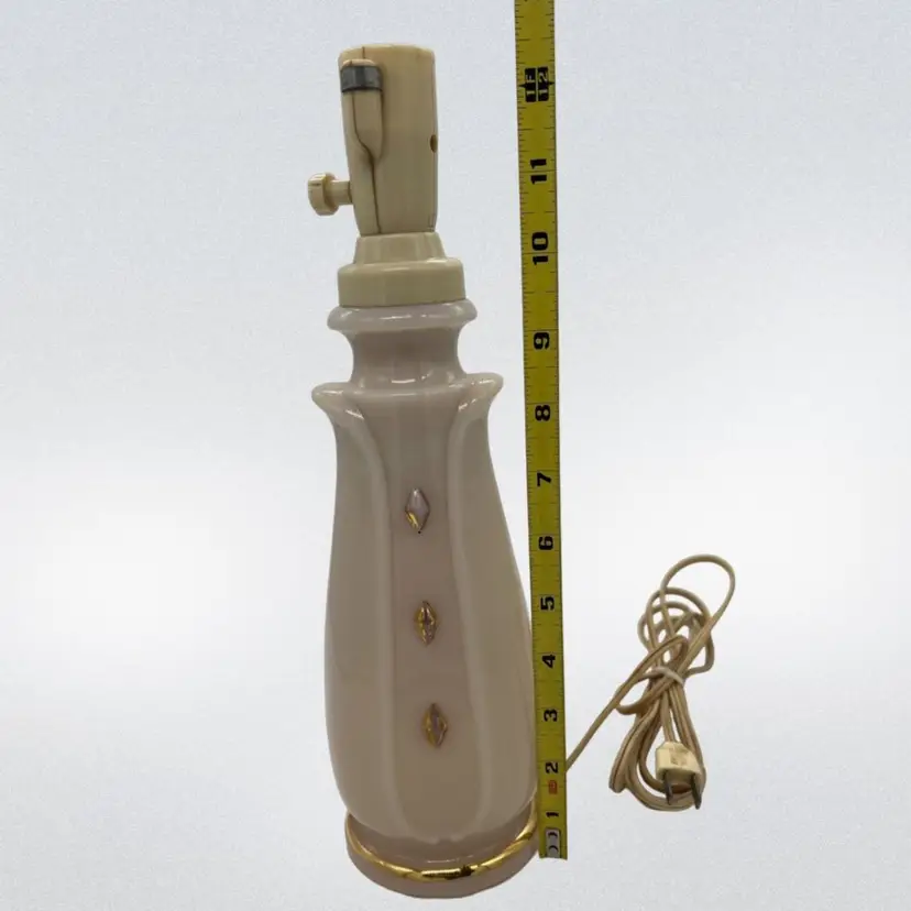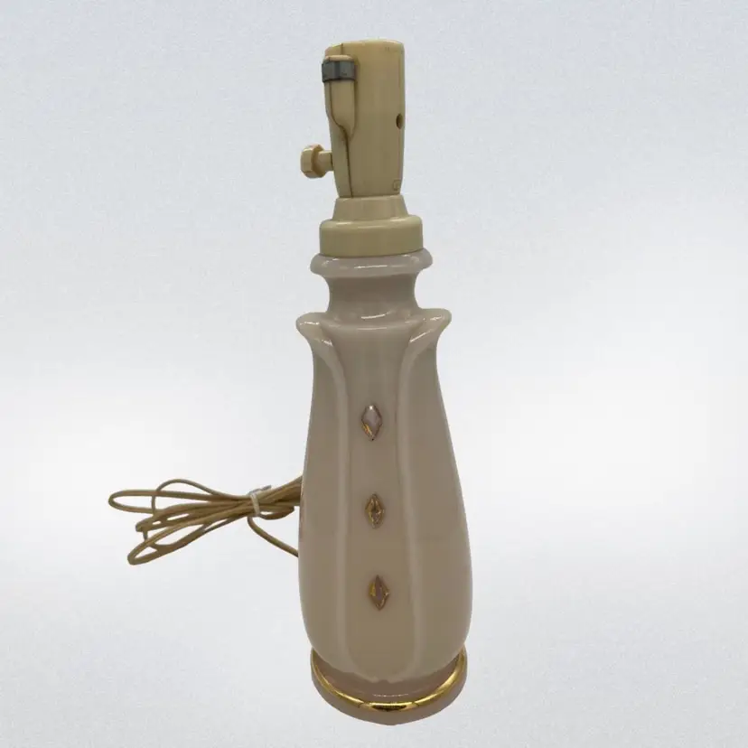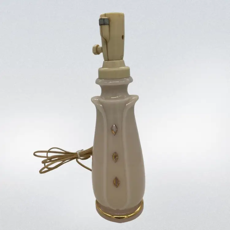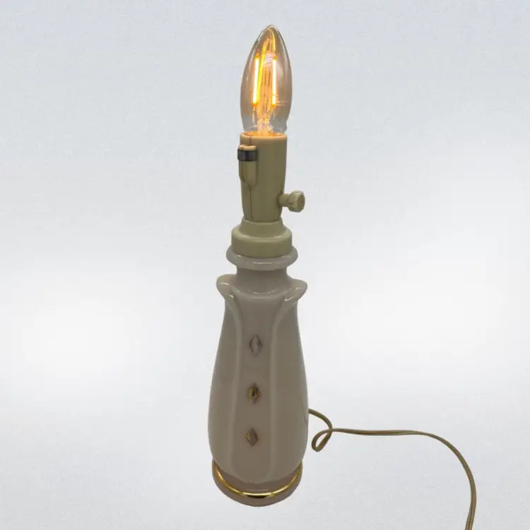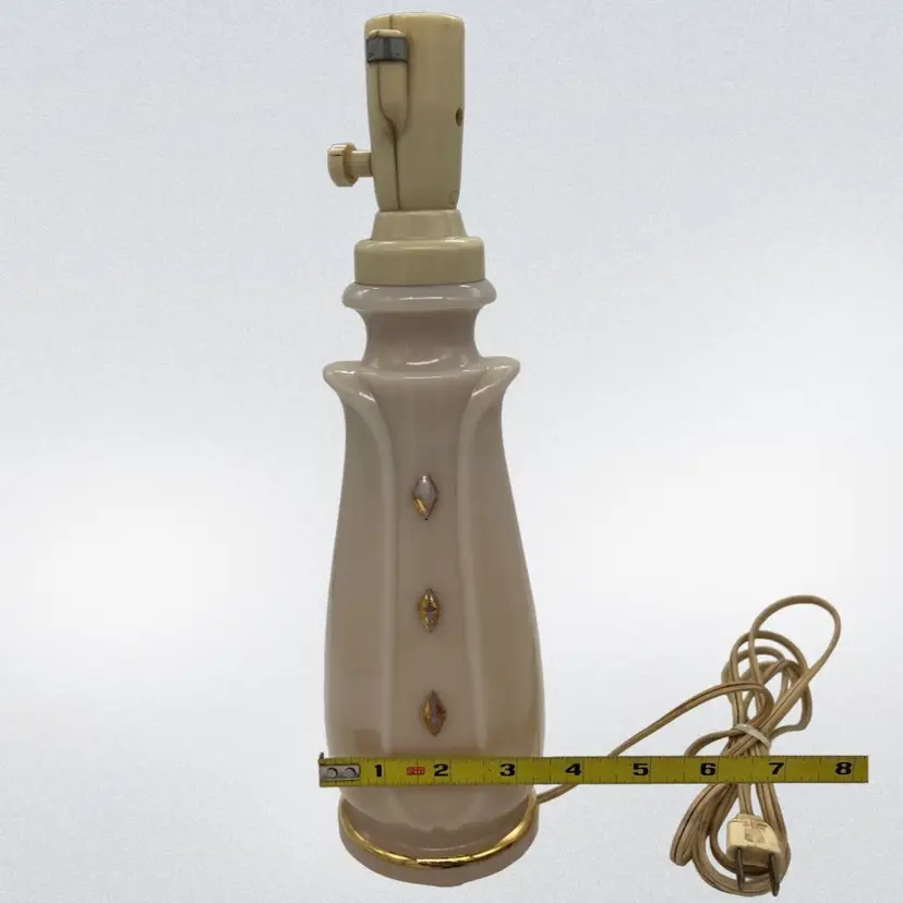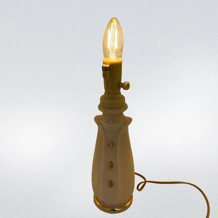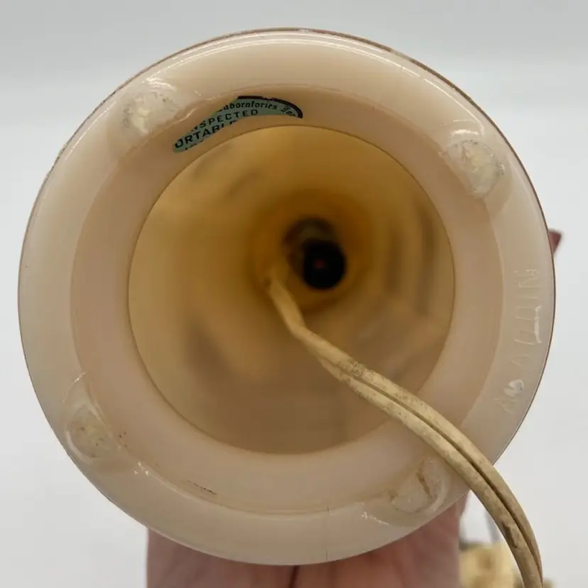 I believe this piece to be the new formula alacite that does not glow under uv light. It is in great working condition, although I do recommend rewiring before using. The gold is wearing as pictured. There are no chips or cracks. It measures about 12 1/2” tall and about 3 1/2” wide.