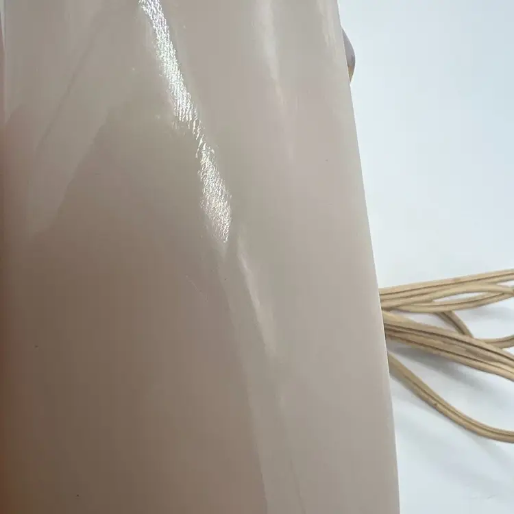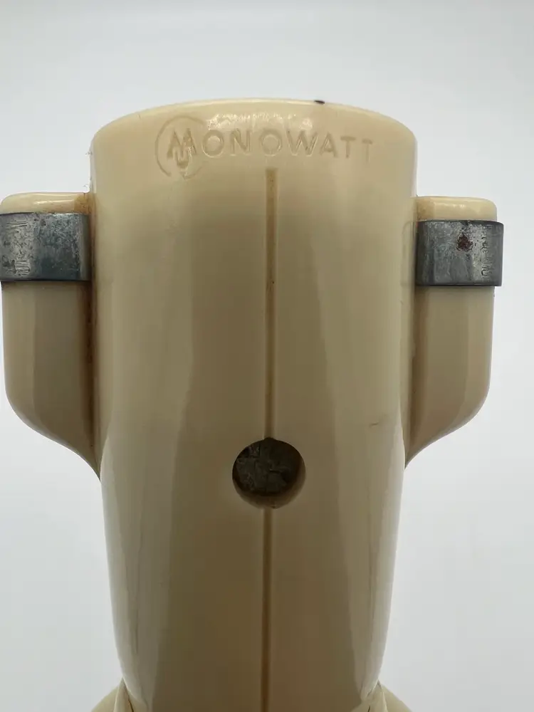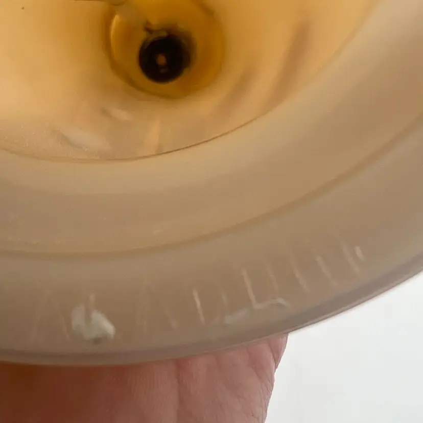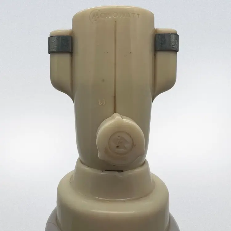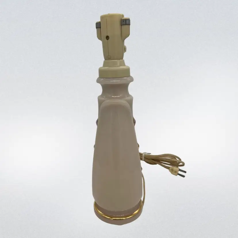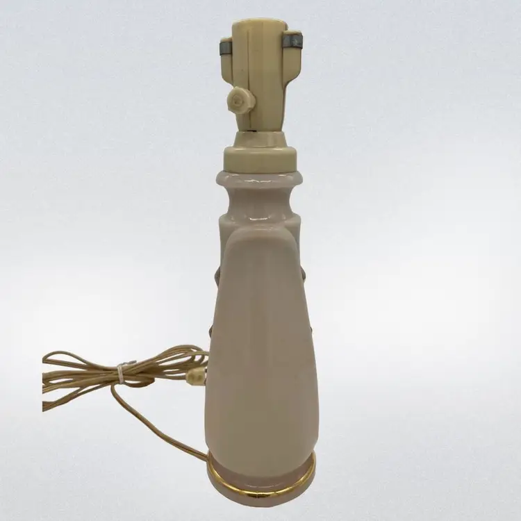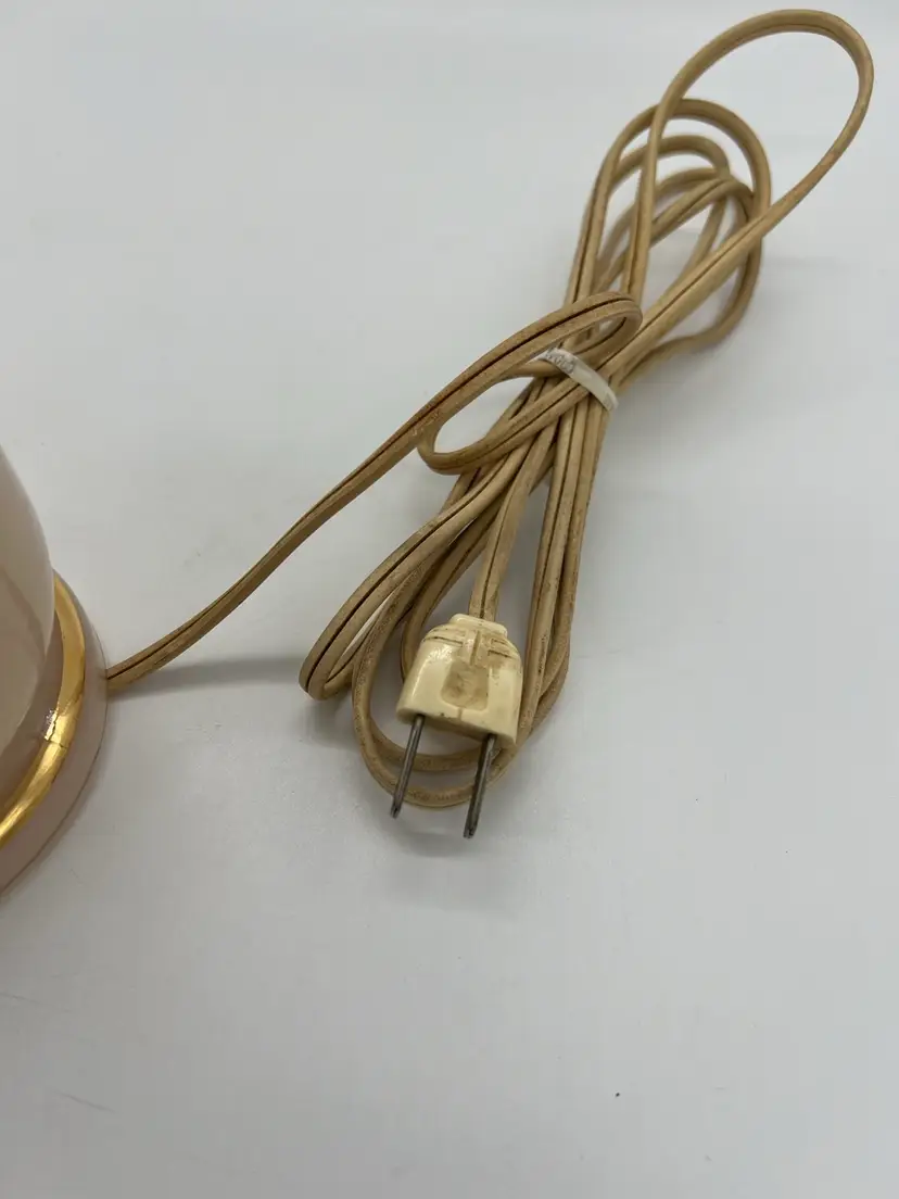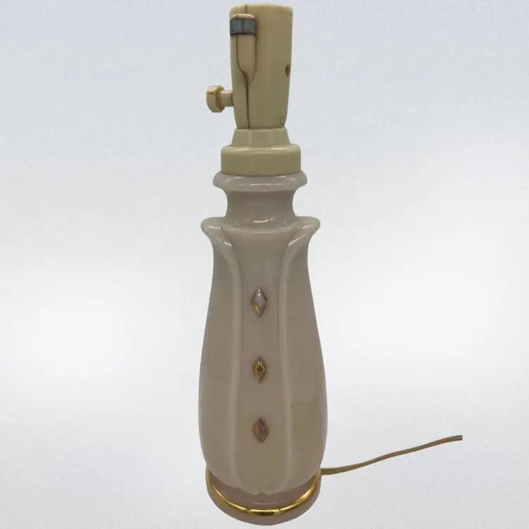 I believe this piece to be the new formula alacite that does not glow under uv light. It is in great working condition, although I do recommend rewiring before using. The gold is wearing as pictured. There are no chips or cracks. It measures about 12 1/2” tall and about 3 1/2” wide.