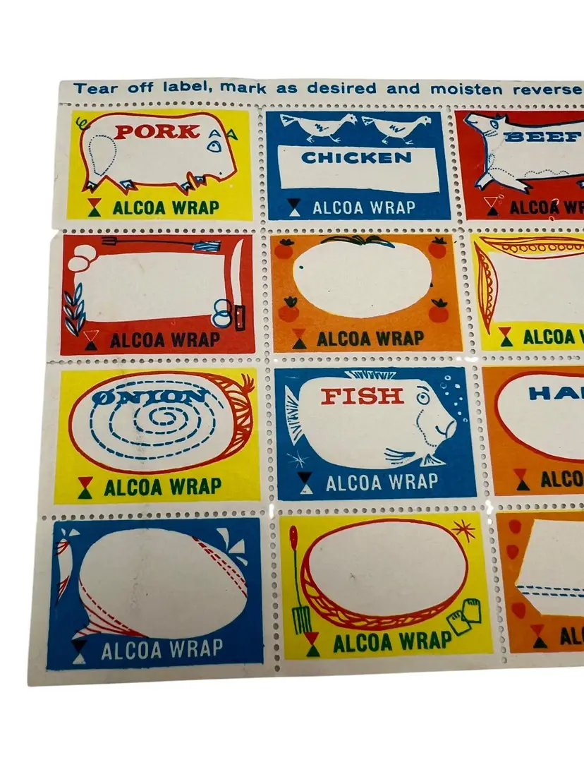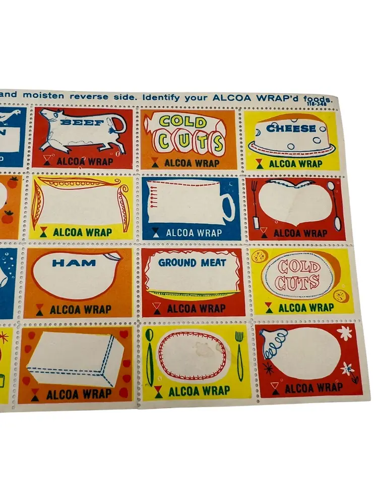 This set of 20 vintage Alcoa Wrap labels is a charming addition to any retro kitchen decor. Each gummed label offers a way to organize and identify stored food items. This appears to be a complete set. From Alcoa - The Aluminum Company of America.