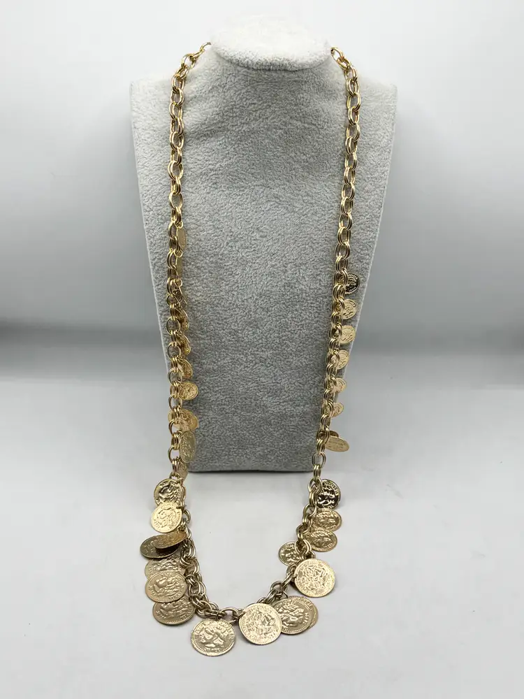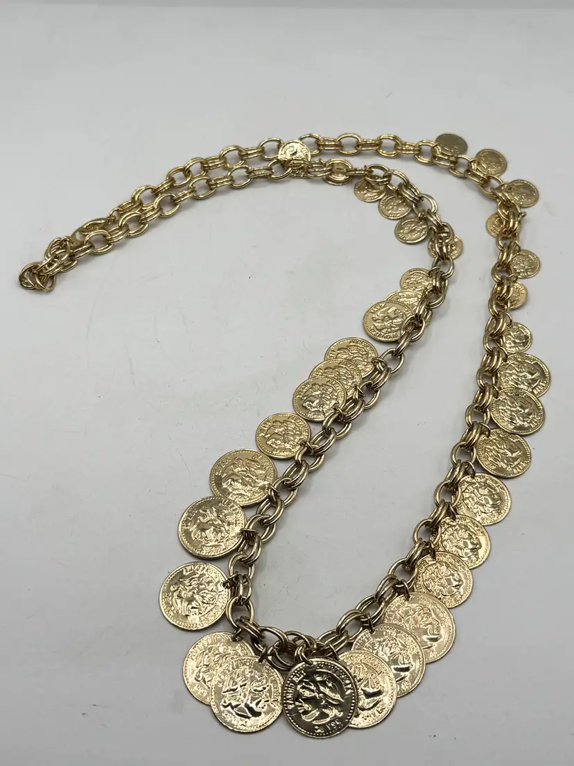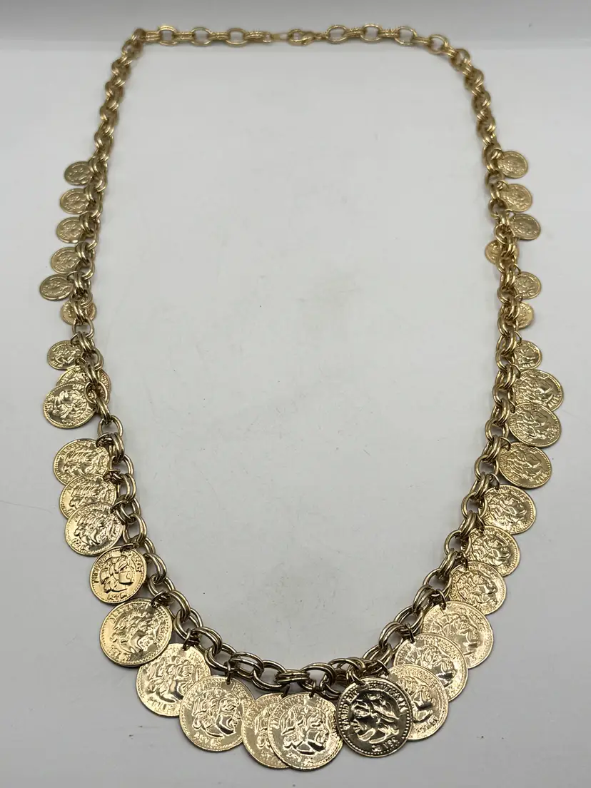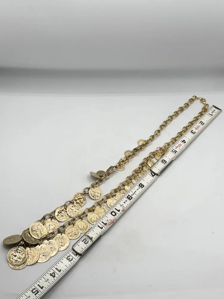 Vintage Alexander the Great gold coin charm necklace. Gold tone chain with hanging coins that read Alexander the Great. Vintage necklace. MN56H.