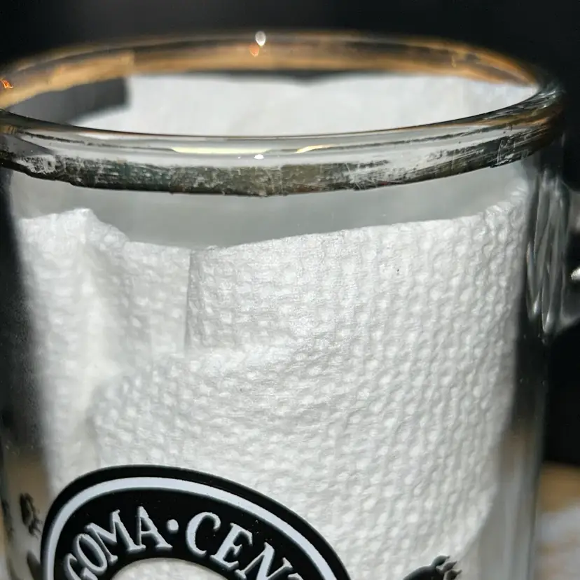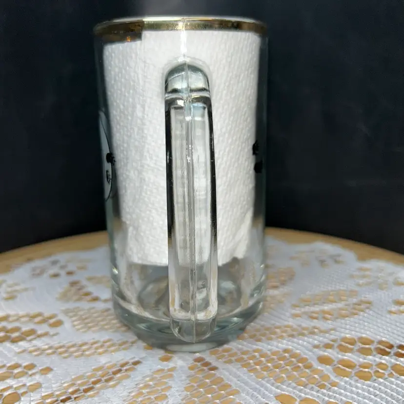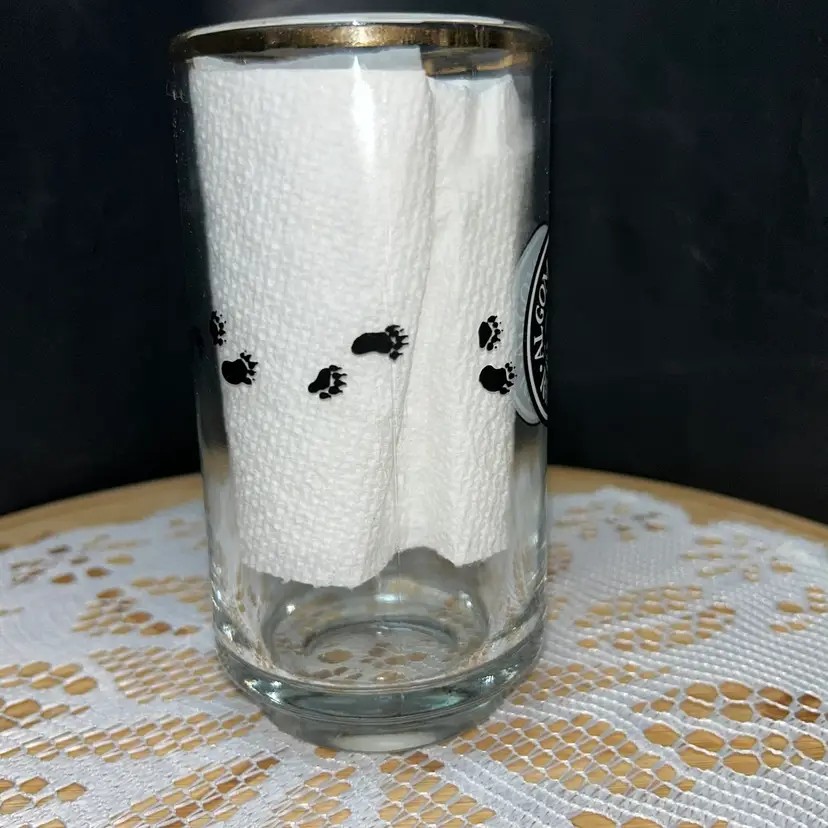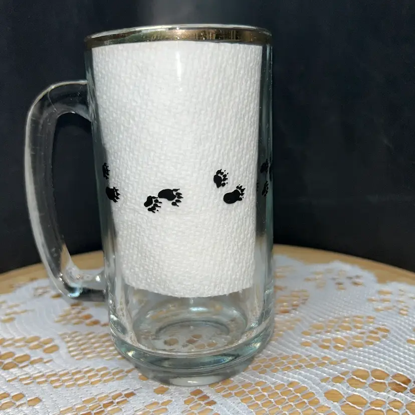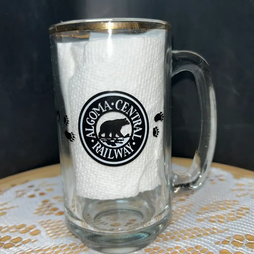 5.5” tall, 2.75” diameter across top. This mug has black and white circular logo with a bear and the text "Algoma Central Railway". Small bear paw prints are also featured on the side of the mug. The mug has a heavy base and can be used for coffee or beer. It is a Canadian train travel souvenir item. Very good condition, the gold around the top is worn. Mug has no chips or cracks.