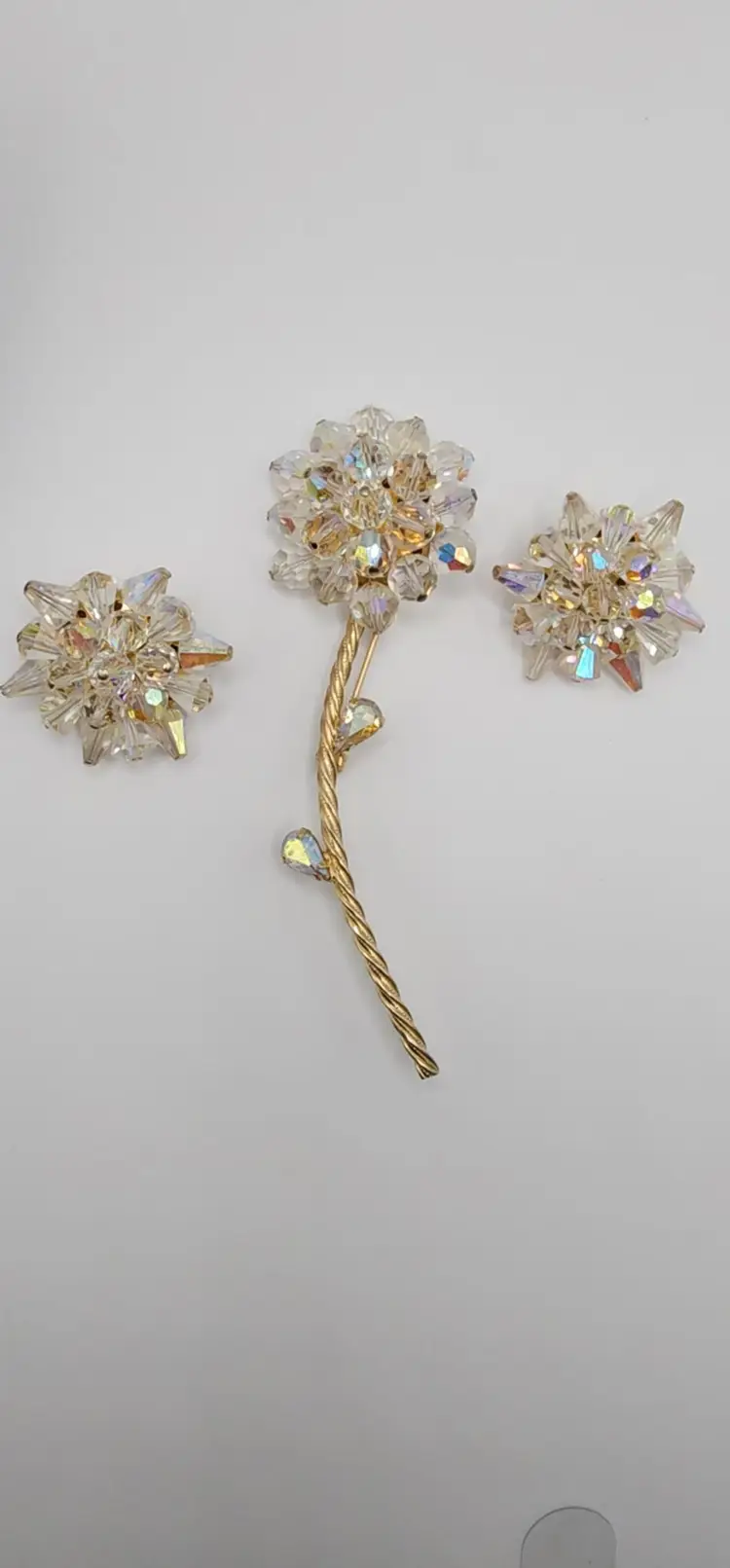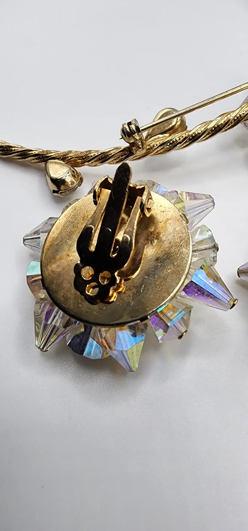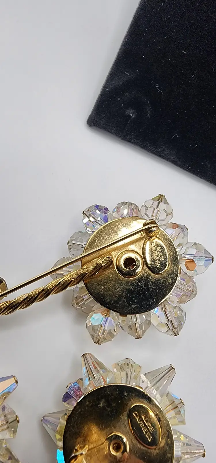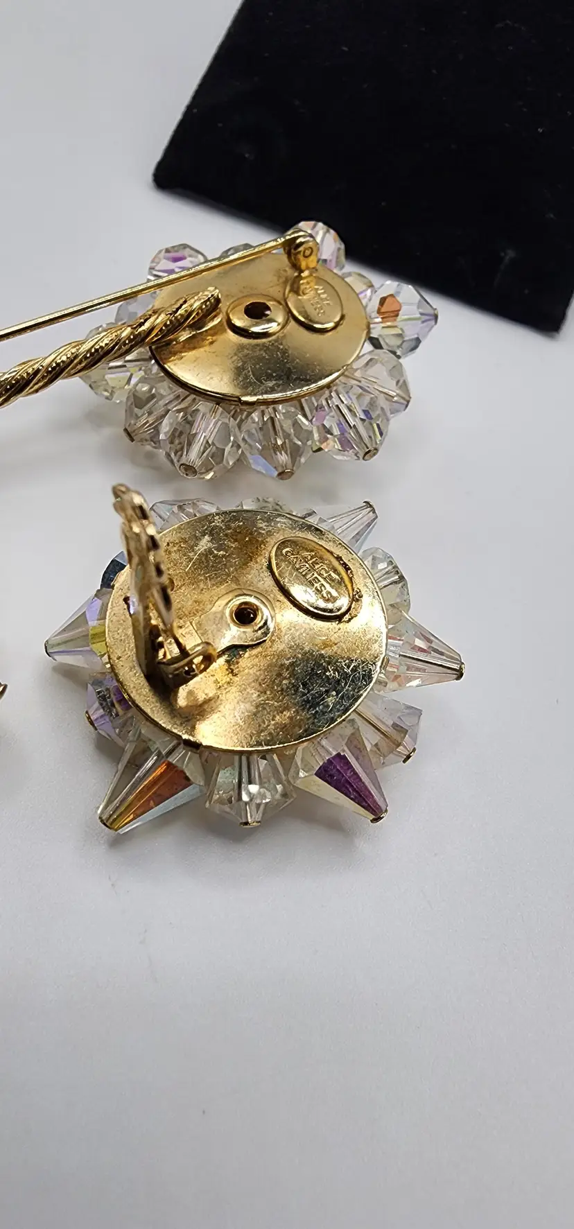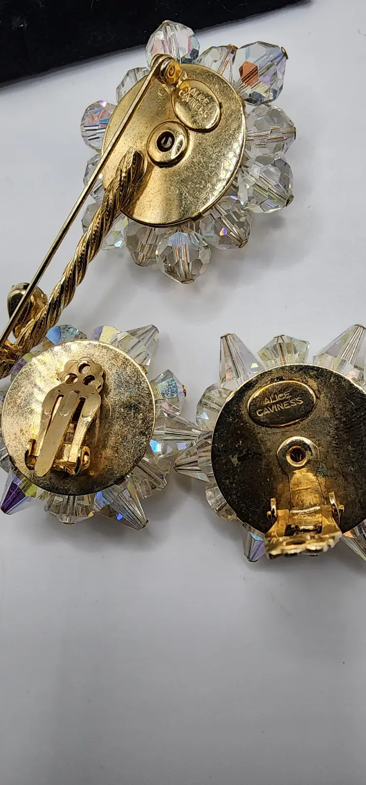 Absolutely stunning Alice Caviness brooch and clip earrings. Floral Cluster aurora borealis beads gold tone brooch with matching earrings. The sparkle is gorgeous, pics don't do it justice. They need to be polished on the back, I ran out if cloths. Otherwise they are in great condition. Please let me know if you have any questions.