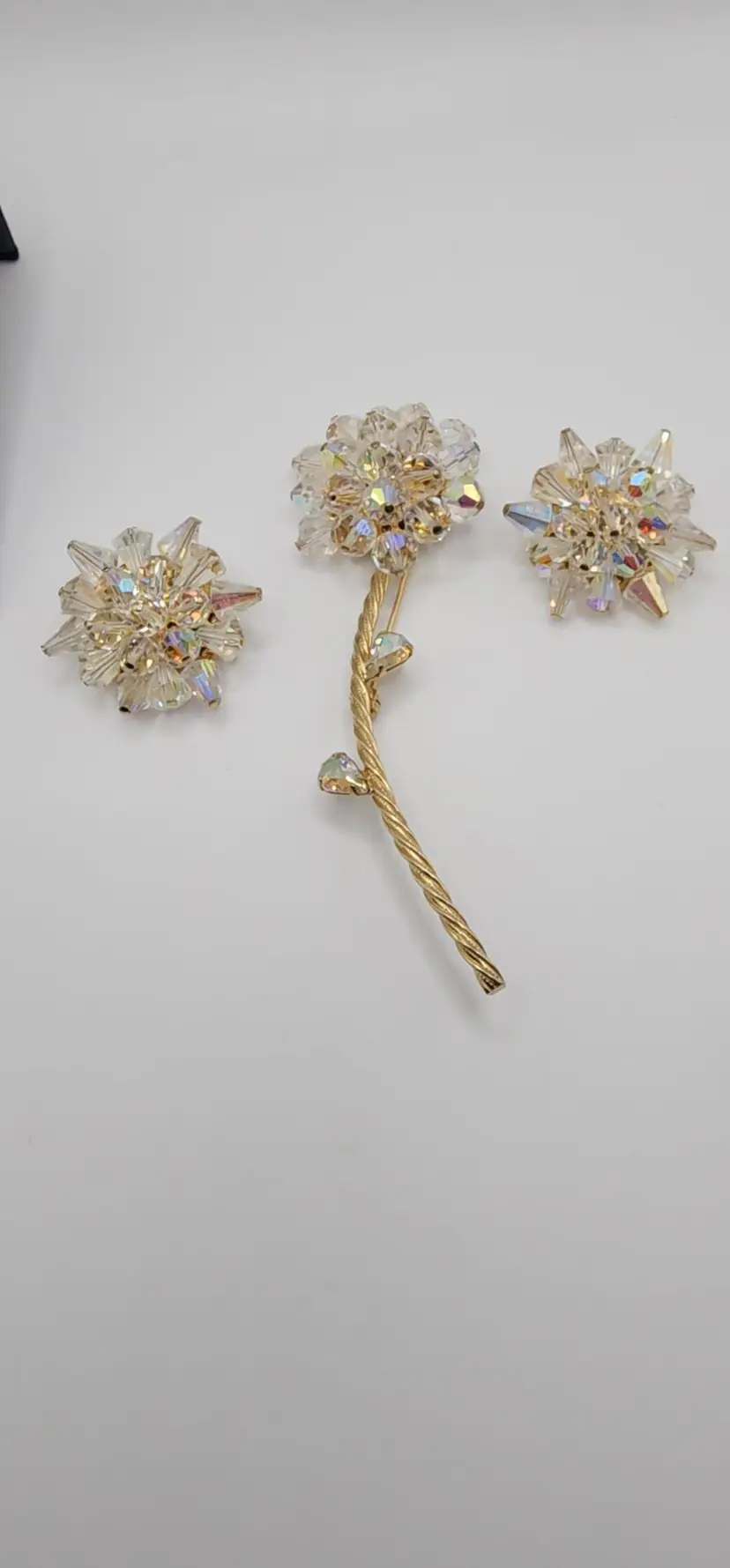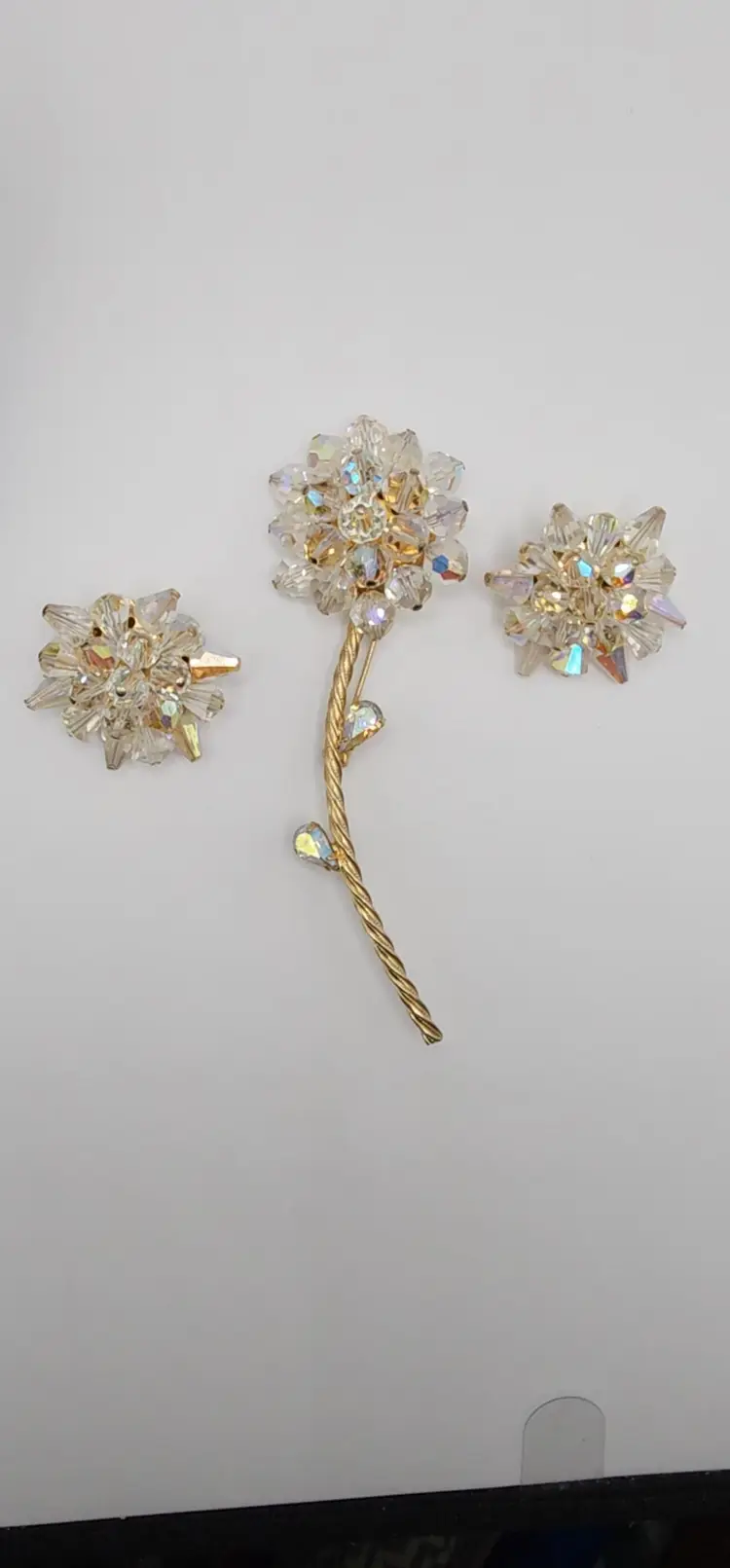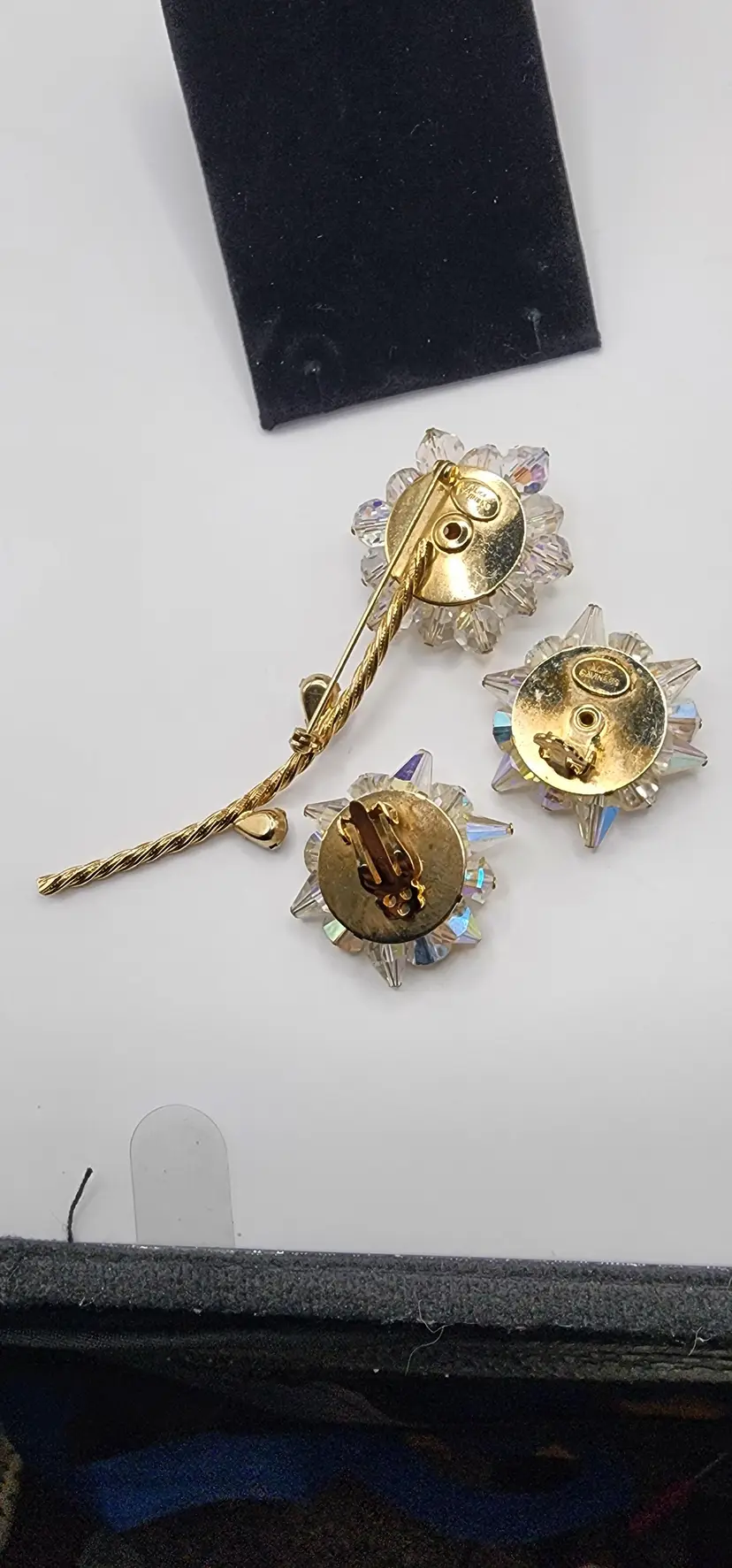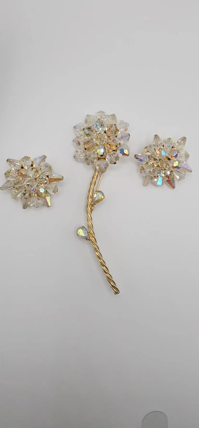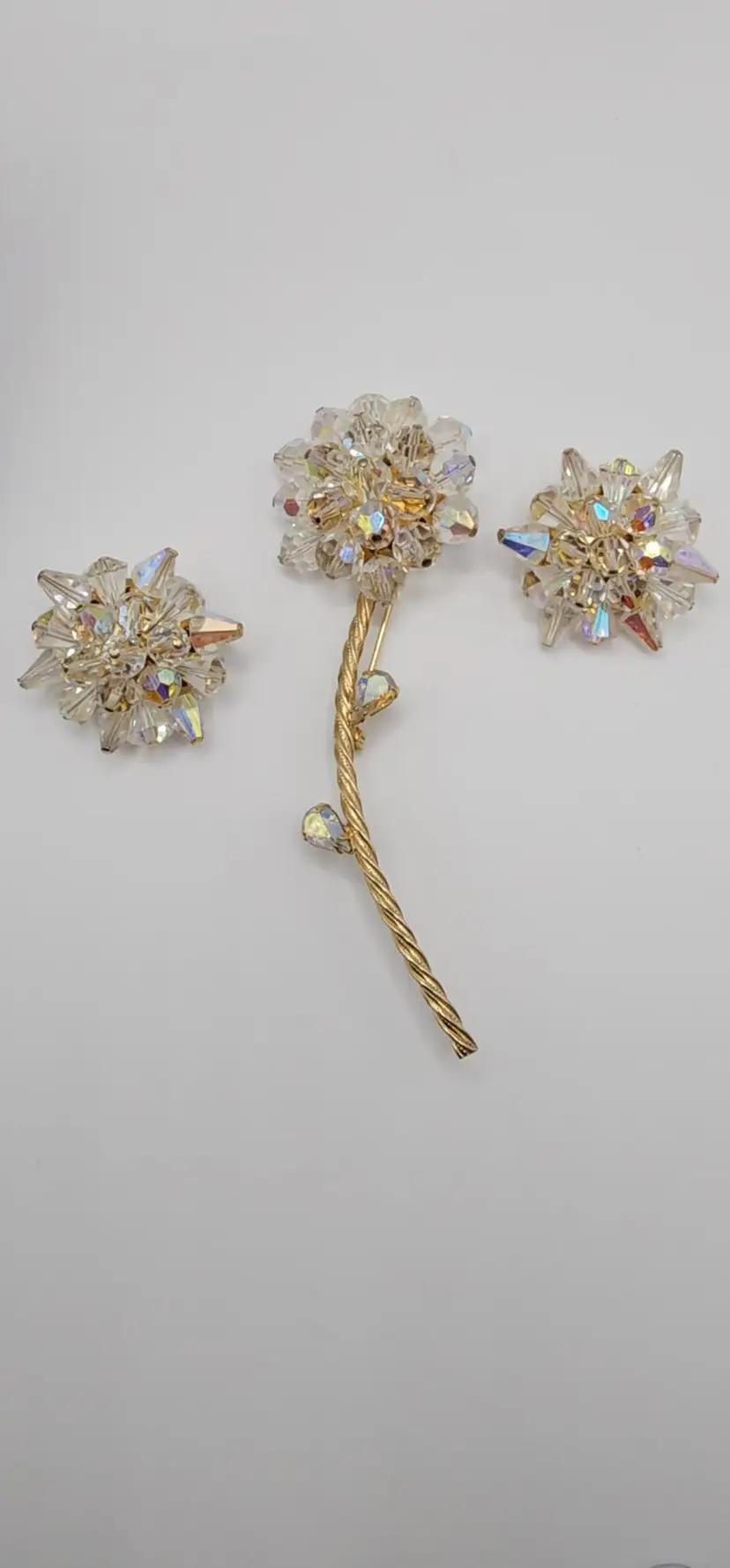 Absolutely stunning Alice Caviness brooch and clip earrings. Floral Cluster aurora borealis beads gold tone brooch with matching earrings. The sparkle is gorgeous, pics don't do it justice. They need to be polished on the back, I ran out if cloths. Otherwise they are in great condition. Please let me know if you have any questions.