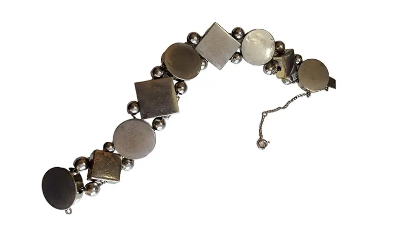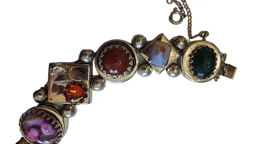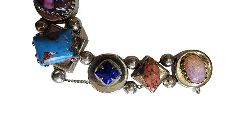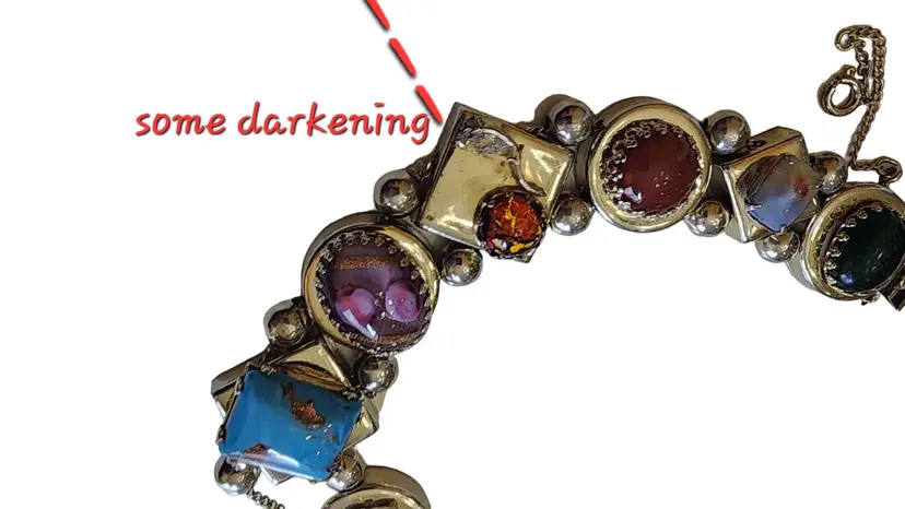 Size: 8" long Color: Multicolor Condition: Good vintage; Some wear to the back and Some darkening to the edge of gold-tone square Signed: None Details: Well made!