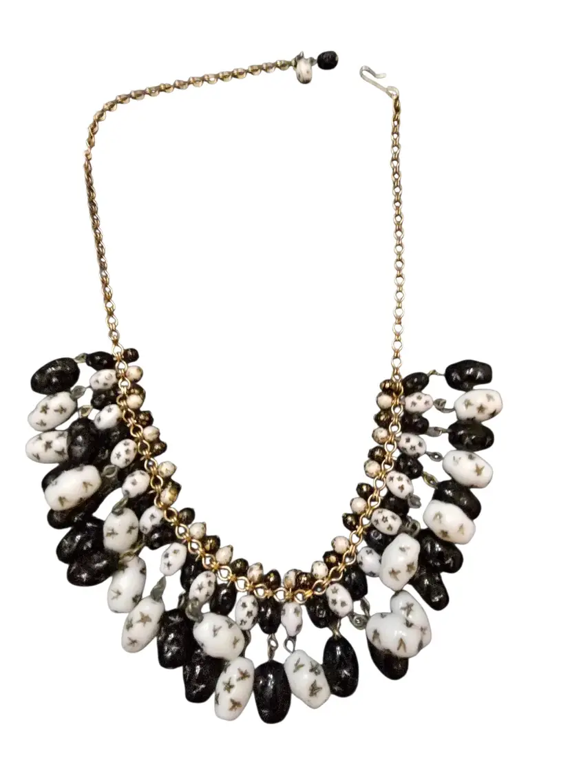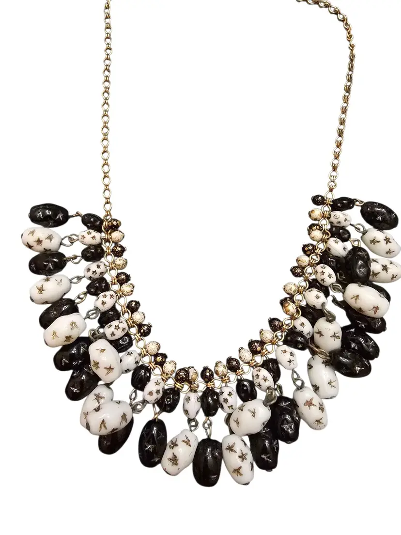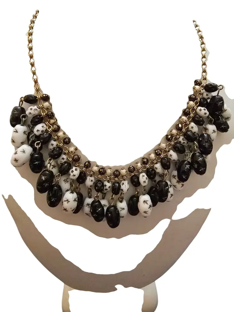 Details: • Molded glass beads with star patterns • Two-tone black and white design • Gold-tone chain with J-hook Clasp • Dangling bib-style construction