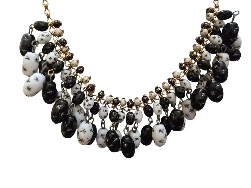 Vintage All Molded Glass Black & White Star Dangling Bib Necklace (A8702)