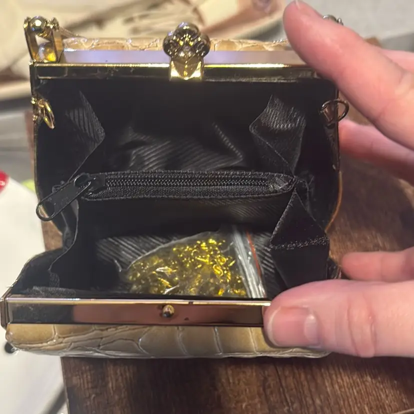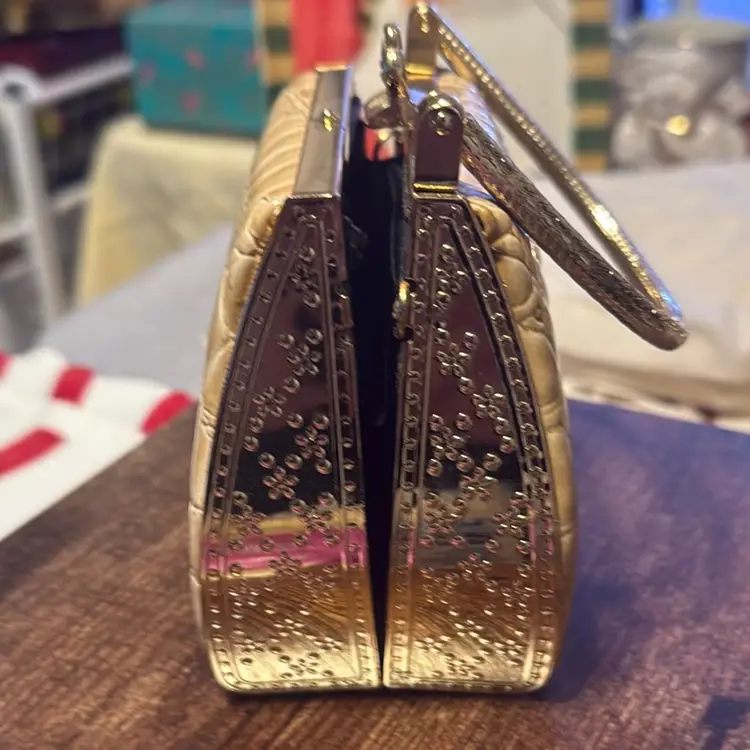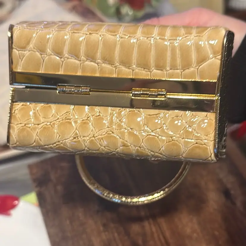 This particular style of handbag, with its structured frame and decorative handle, is reminiscent of designs popular in the mid-20th century, particularly from the 1950s and 1960s. The use of embossed or genuine reptile skin, such as alligator or crocodile, was a hallmark of luxury accessories during this period, signifying opulence and sophistication.