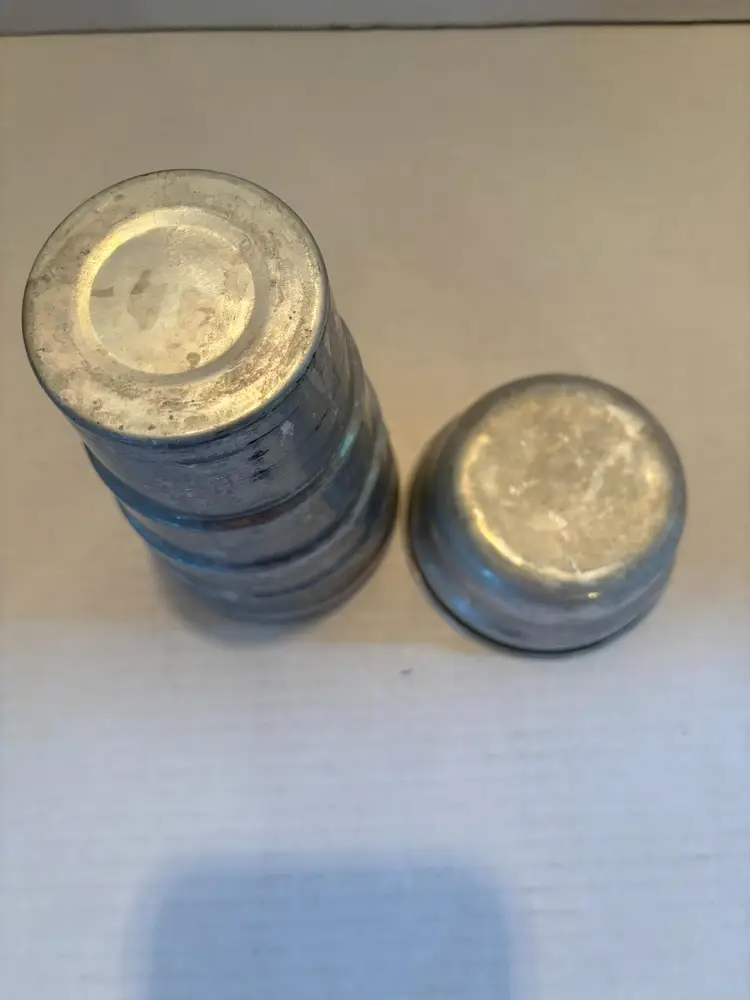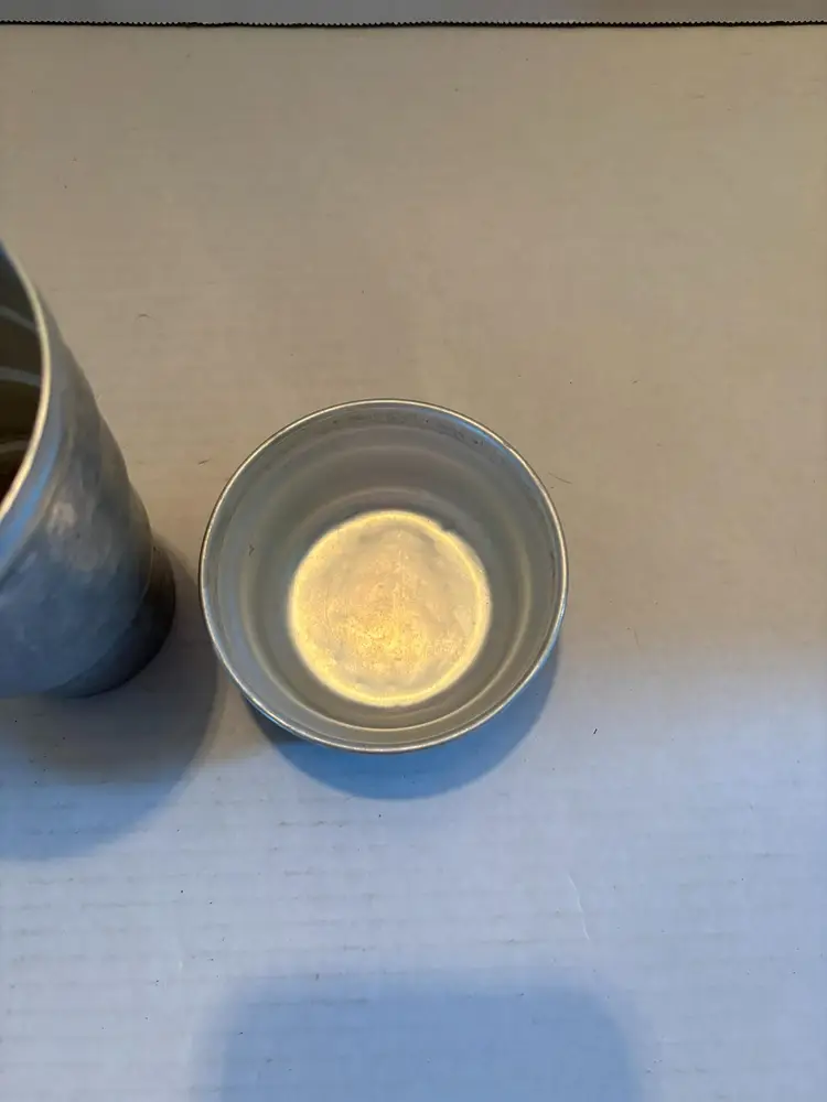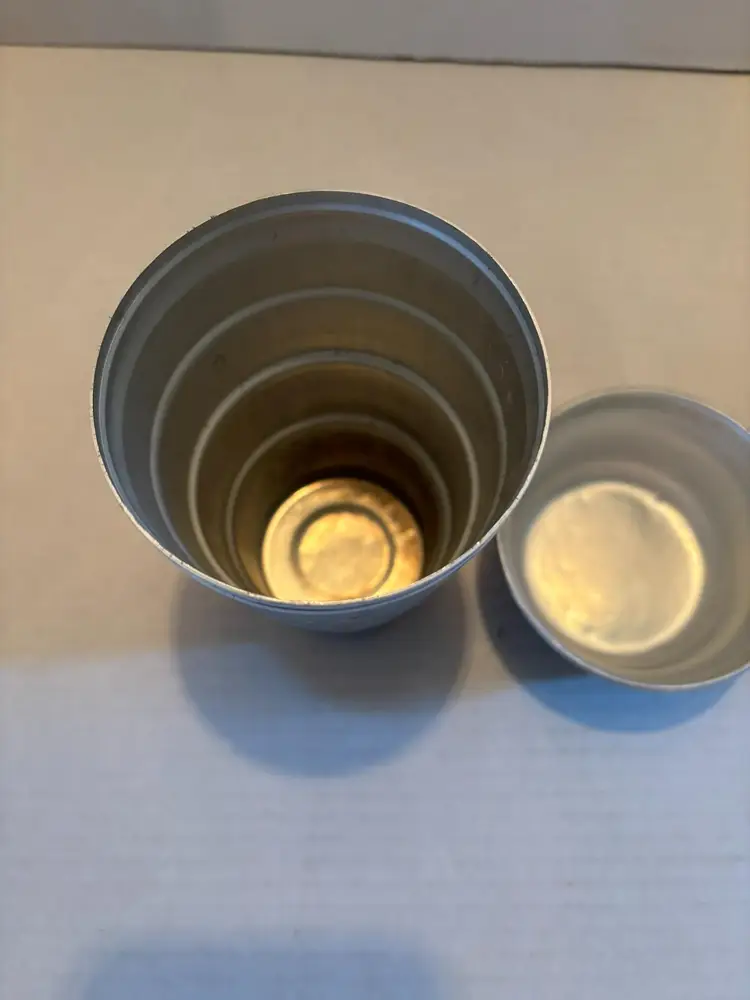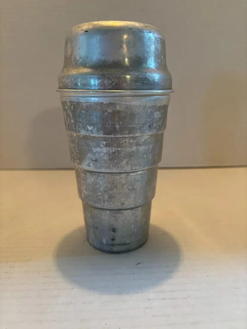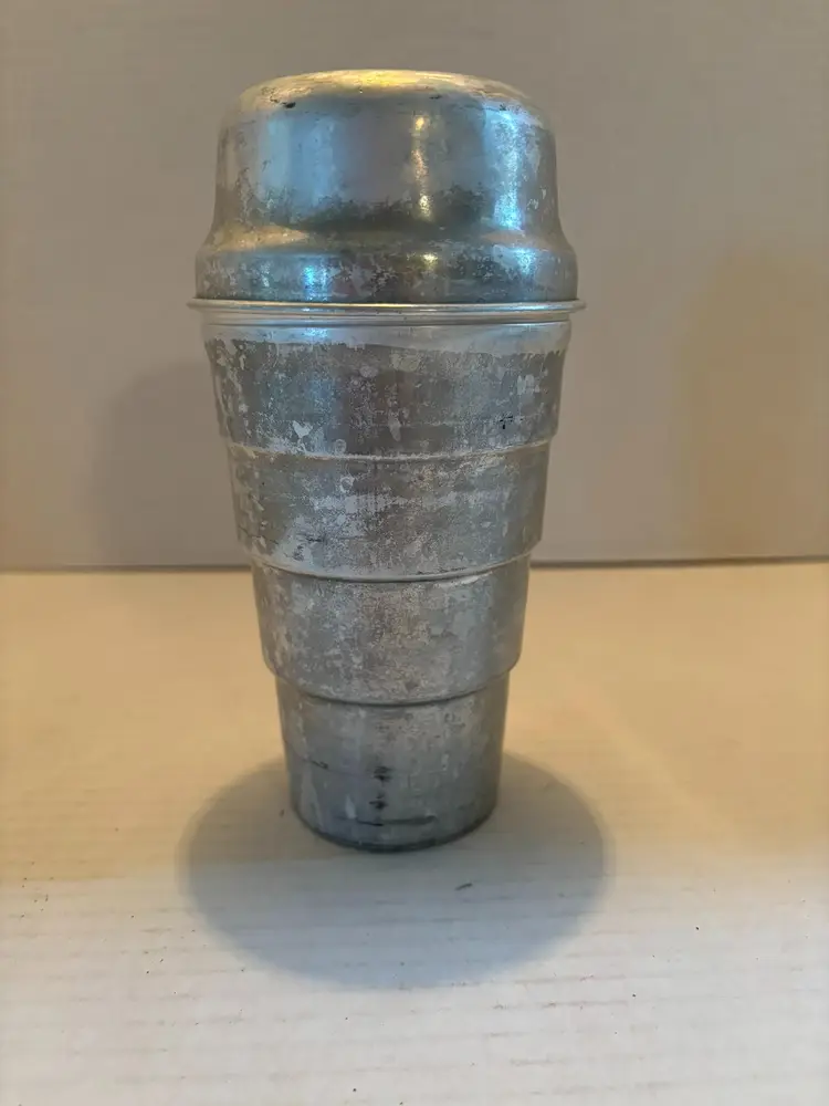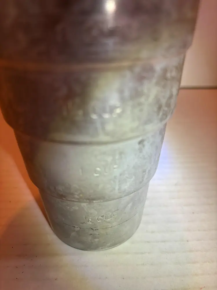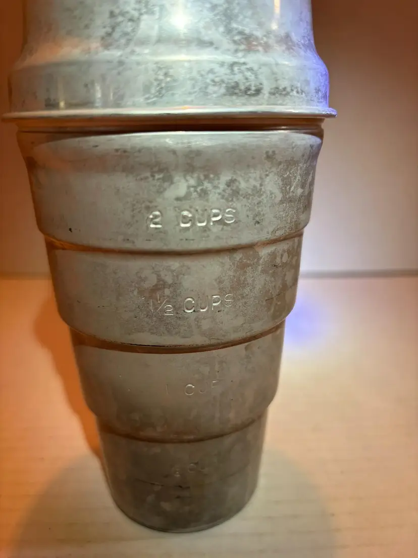 This vintage aluminum measuring/mixing shaker with lid is a must-have addition to your kitchen tools and gadgets. With a capacity of 2 cups and a height of 7 inches, it is the perfect size for mixing and measuring ingredients. The round shape and silver color give it a classic look, while the aluminum material ensures durability and longevity. This original, unbranded shaker comes with a lid and is perfect for collectors or anyone in need of a reliable mixing and measuring tool. Its style is timeless and will fit seamlessly into any kitchen. Add this piece to your collection or use it to mix and measure your ingredients with ease.