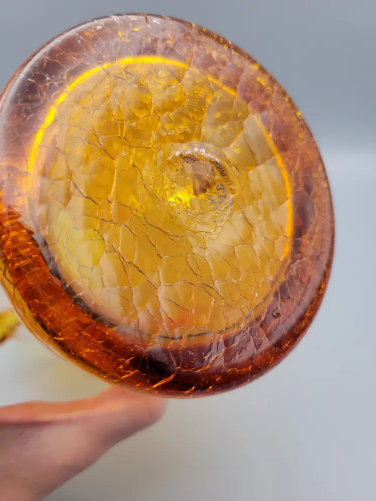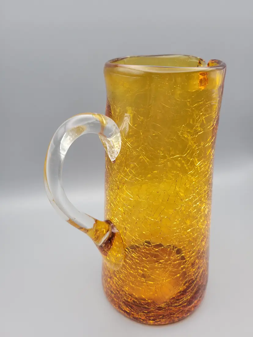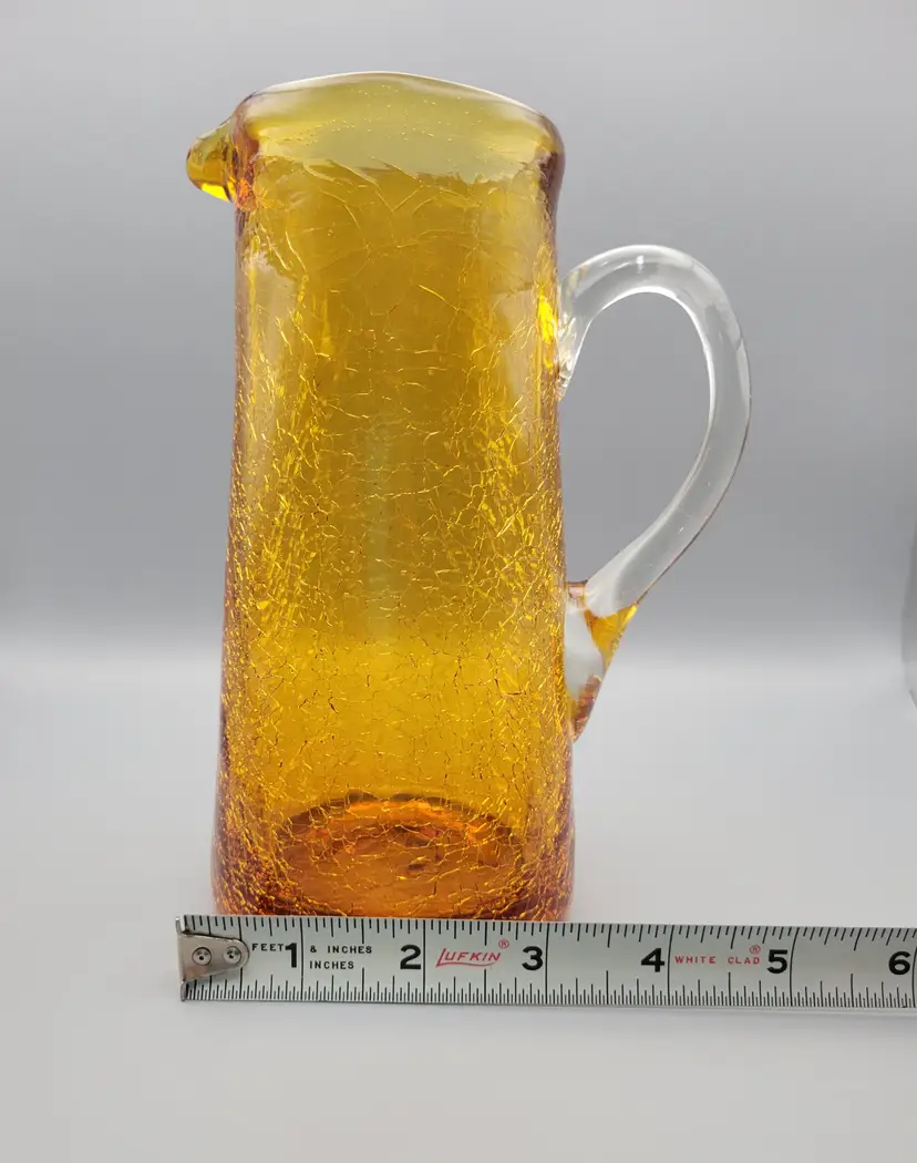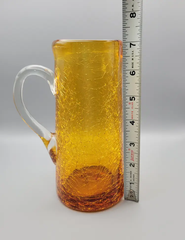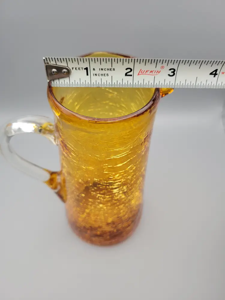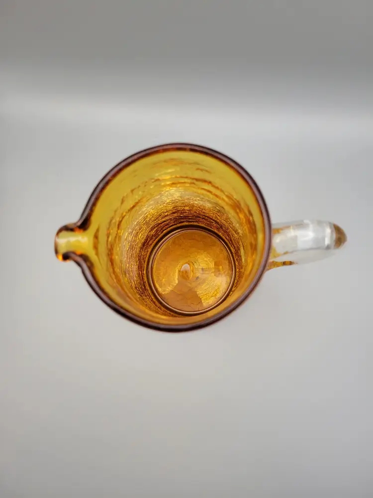 This cute little amber crackle glass pitcher would make a great vase with fall wild flower bouquet. Measurements just over 7 inches tall, 2.5 inch opening, 3 inches at base and 4.5 inches wide including handle. Great condition, no chips or cracks. Rough pontil. Thank you for looking and have a fantastic day!