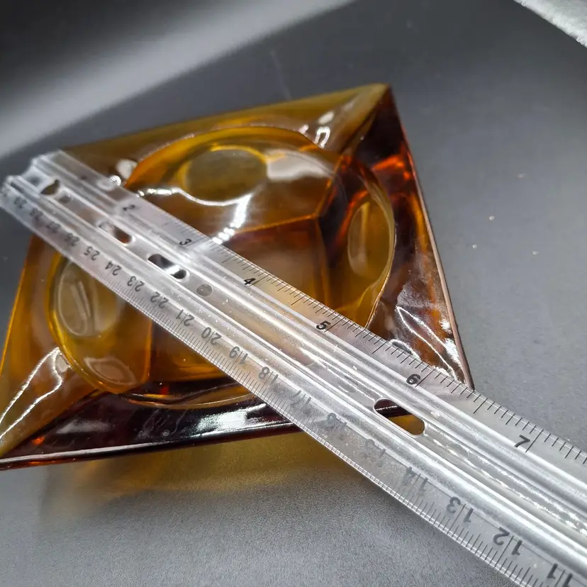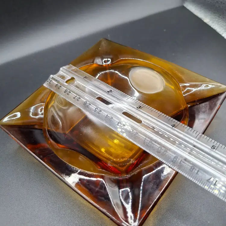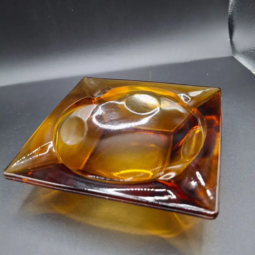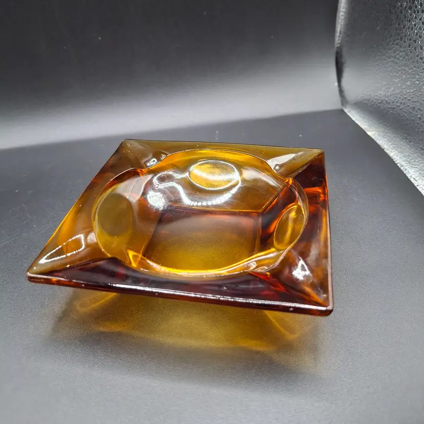 In the golden glow of a bygone era, this vintage amber glass ashtray serves as a nostalgic reminder of mid-century modern elegance. Its warm amber hue and striking square design create a captivating centerpiece that invites stories of camaraderie and relaxation. This timeless piece harmonizes form and function, capturing the spirit of shared moments.