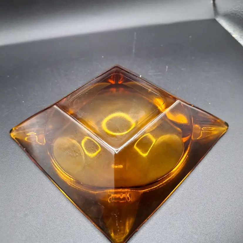 • Square shape with bowl center • Mid-century modern style • Warm amber glass • Smooth, polished edges • 6 inches on each side