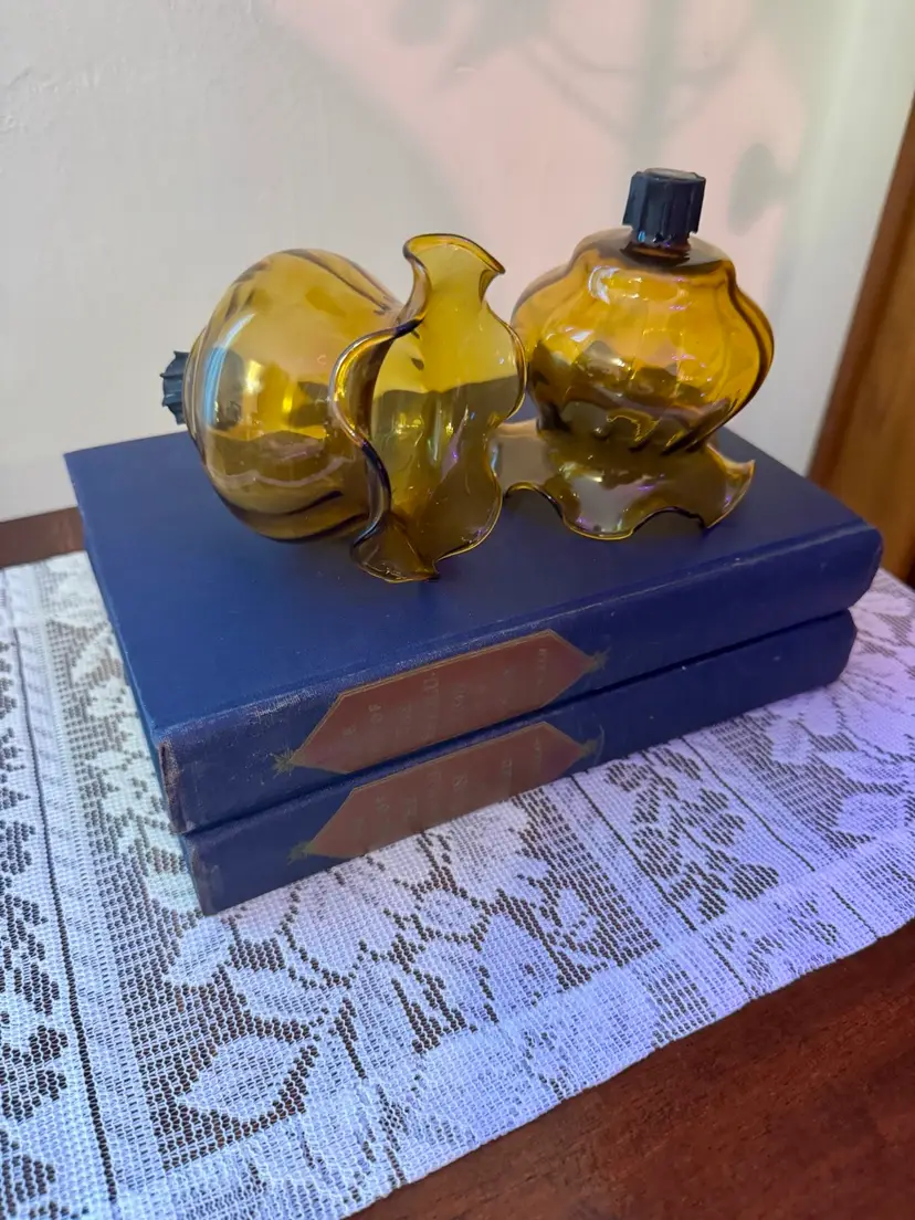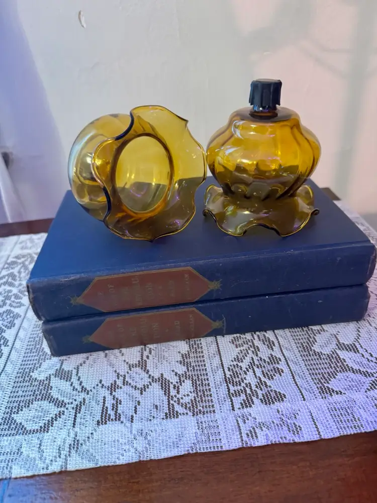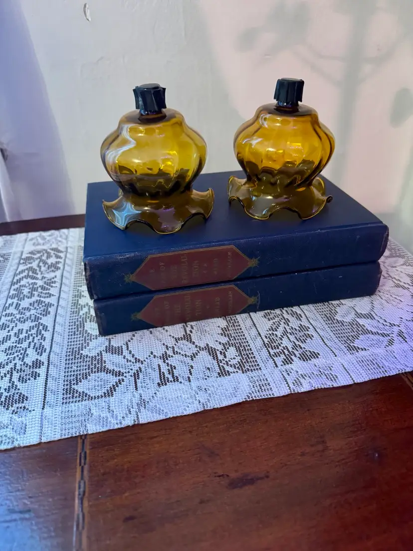 Add warm, nostalgic charm to your space with this pair of vintage amber glass candle holders. Designed to mimic miniature oil lamps, these pieces feature scalloped edges, curvy silhouettes, and black screw-top wick caps. Whether styled on a lace runner or nestled among antique books, they bring a cozy glow and timeless elegance to any vignette. Excellent vintage condition; no chips or cracks.