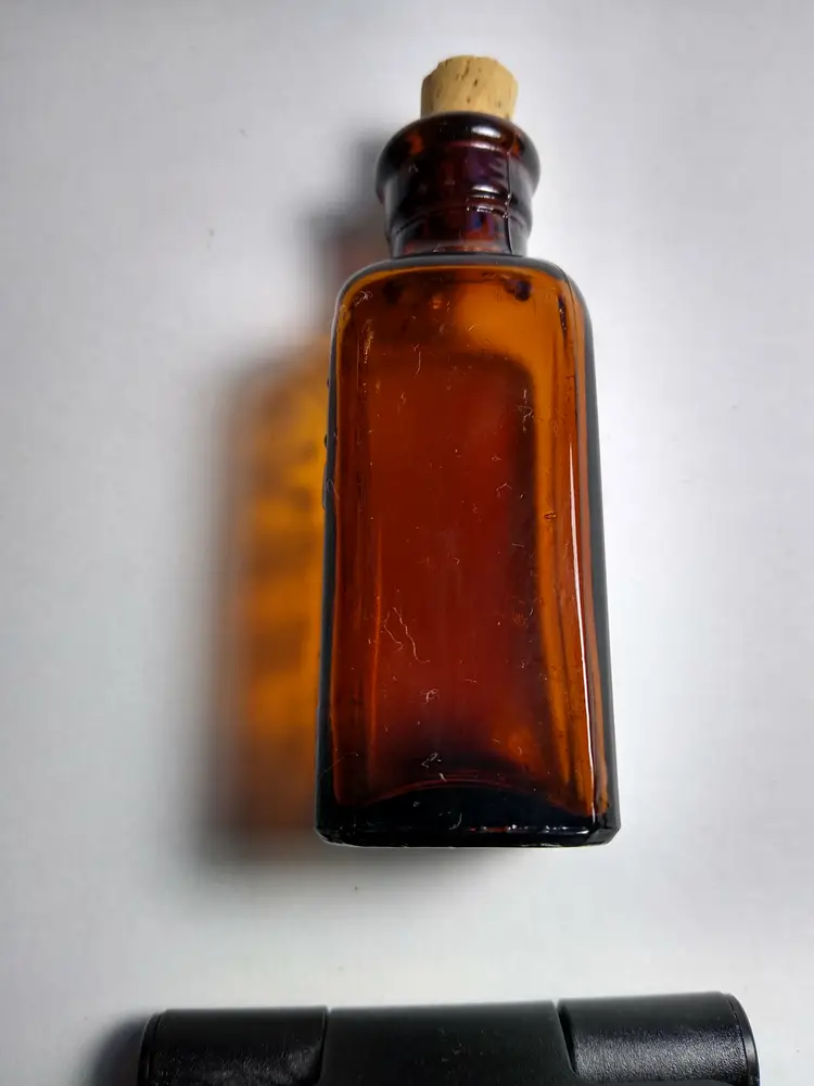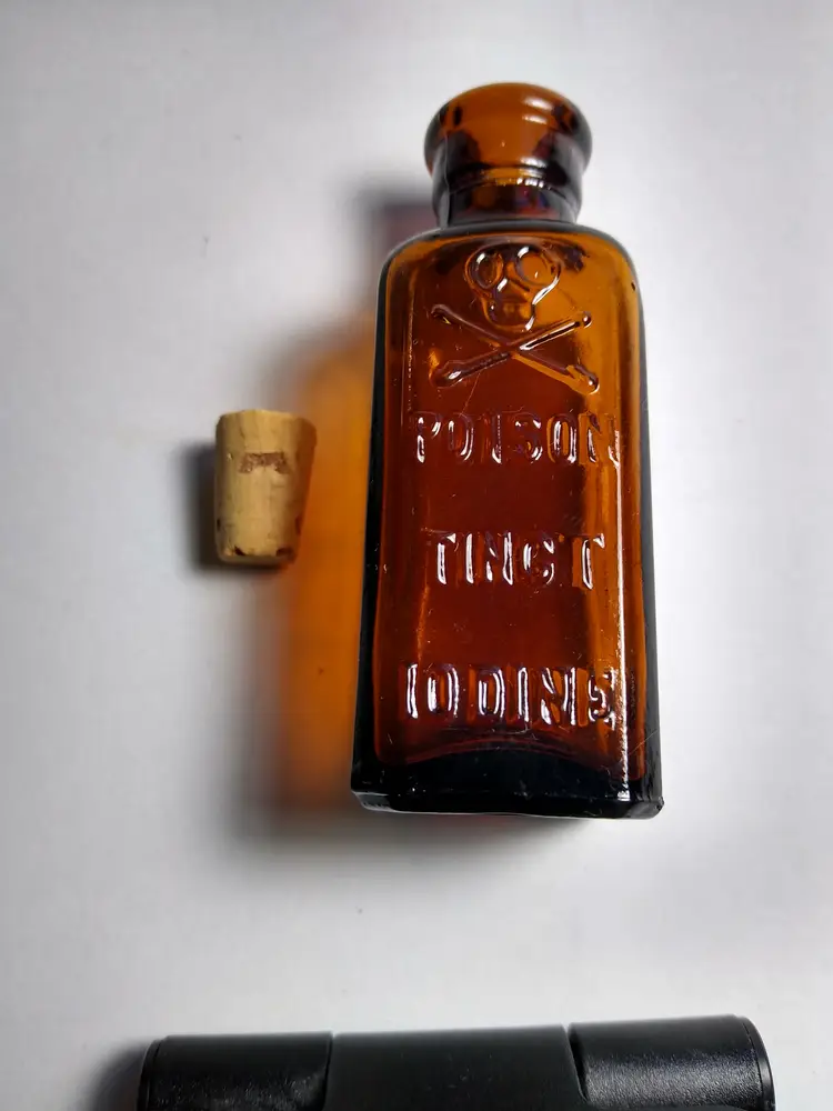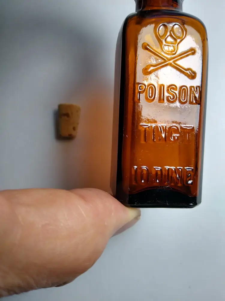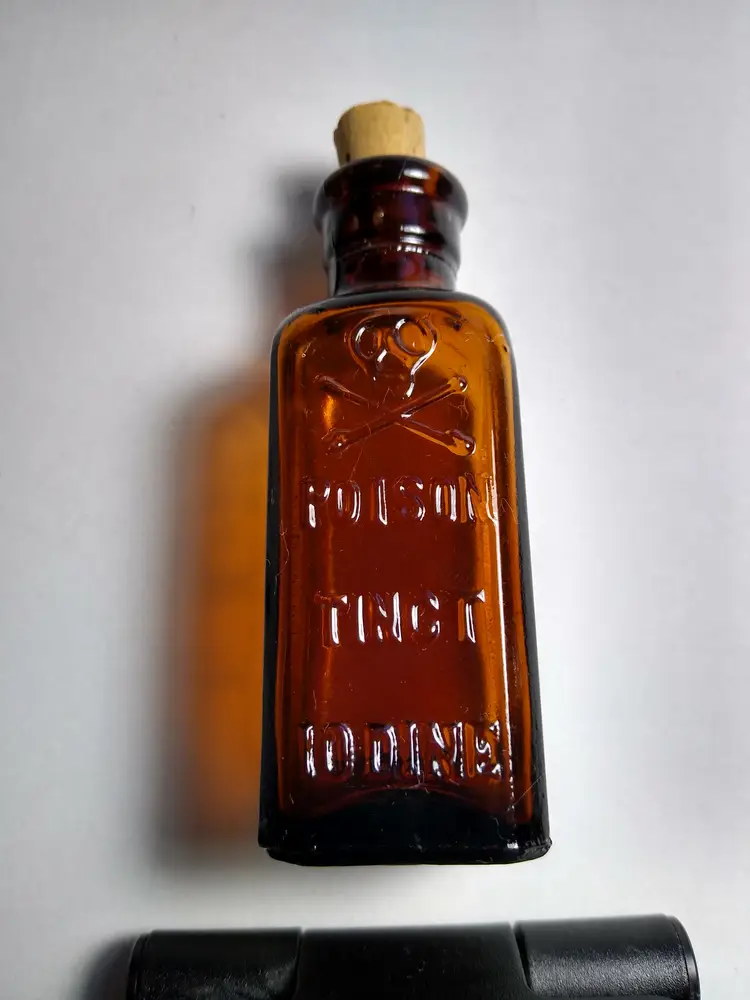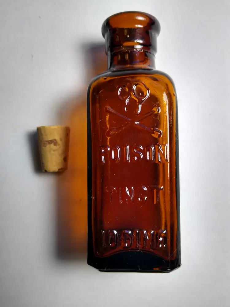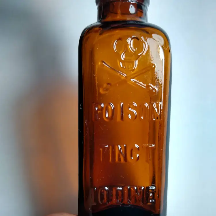 This vintage amber glass bottle features an embossed skull and crossbones with the words "POISON TINCT IODINE," making it a perfect spooky Halloween decoration. Crafted from amber glass, the bottle has a classic rectangular shape with a cork stopper, reminiscent of old apothecary or medicinal bottles. Its rich amber color adds an authentic antique charm, ideal for collectors or seasonal displays.