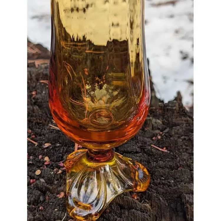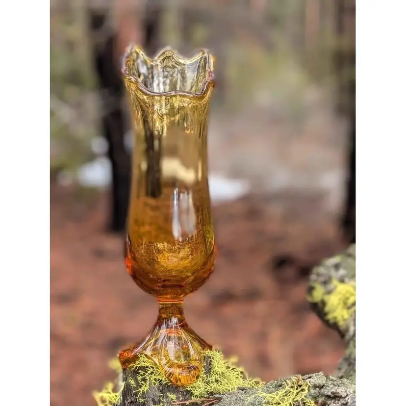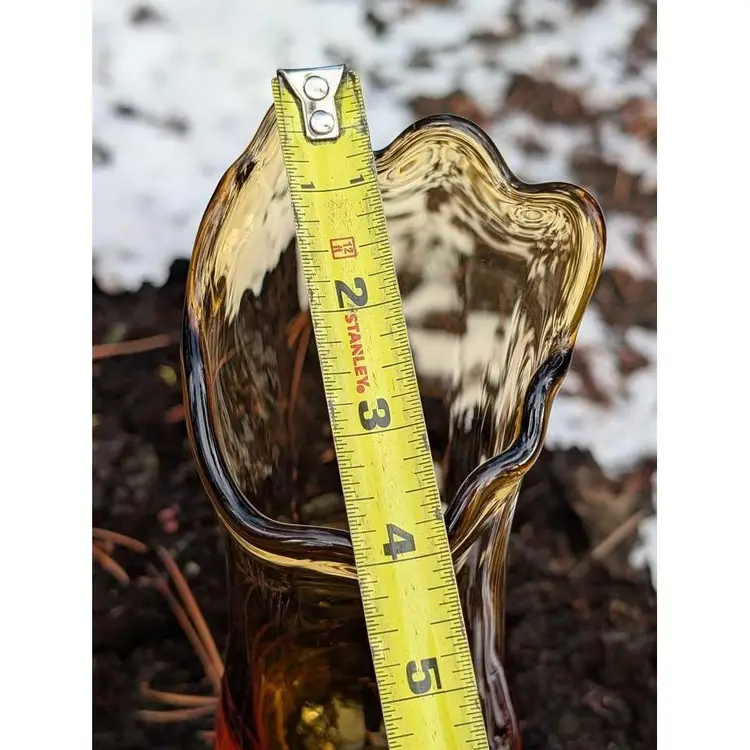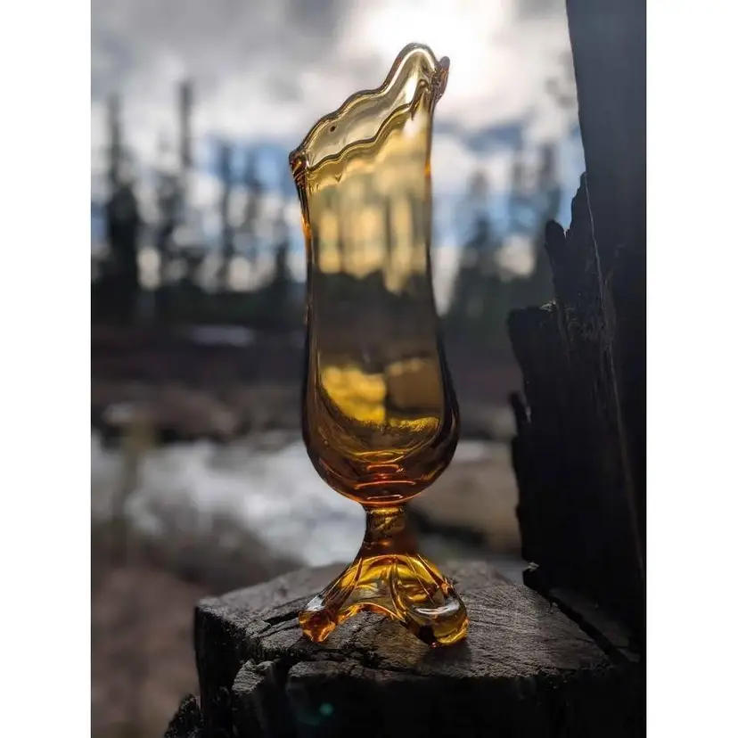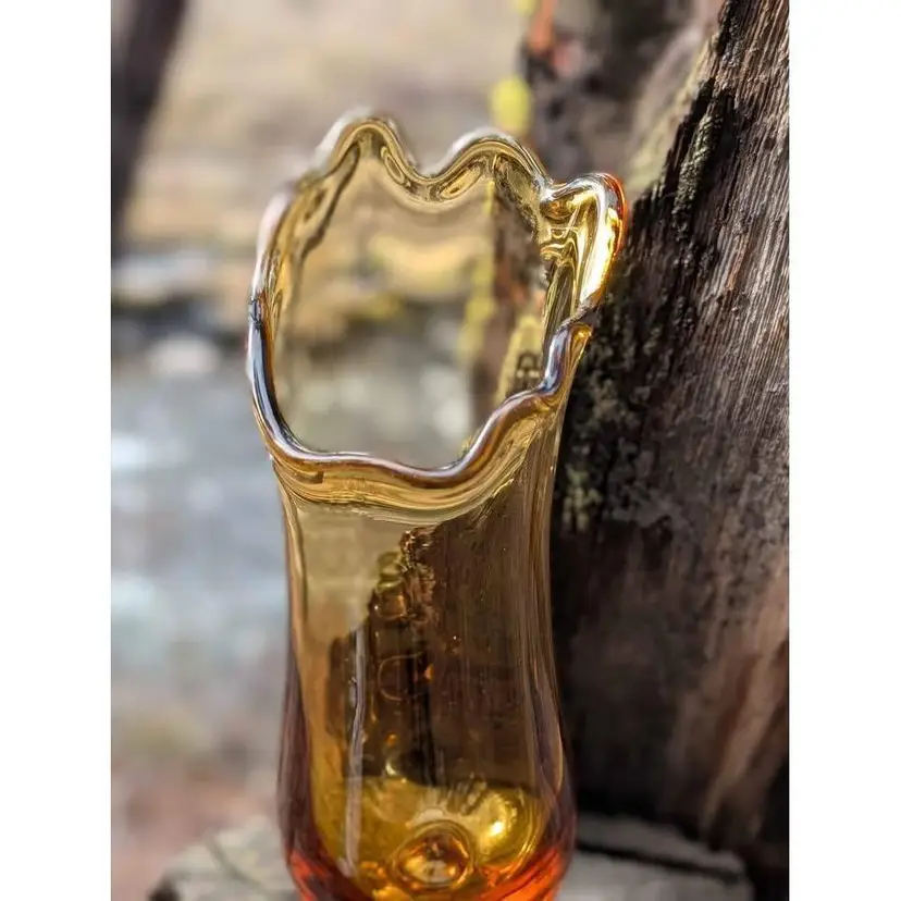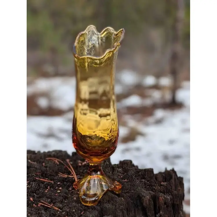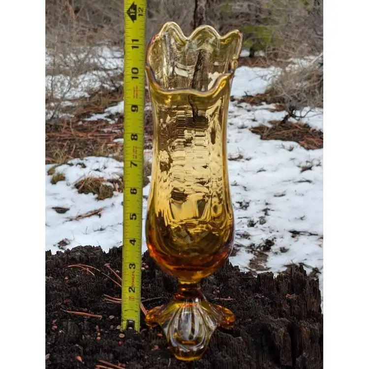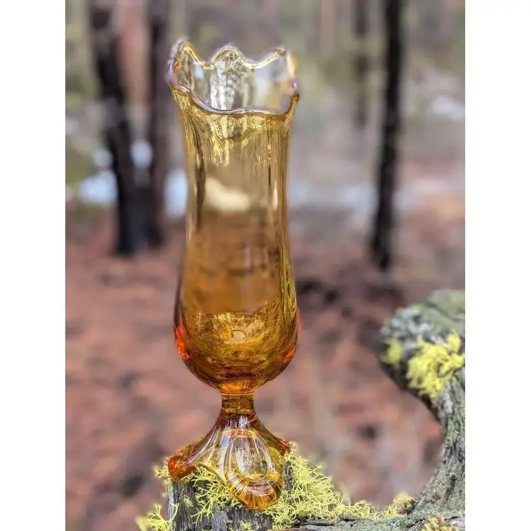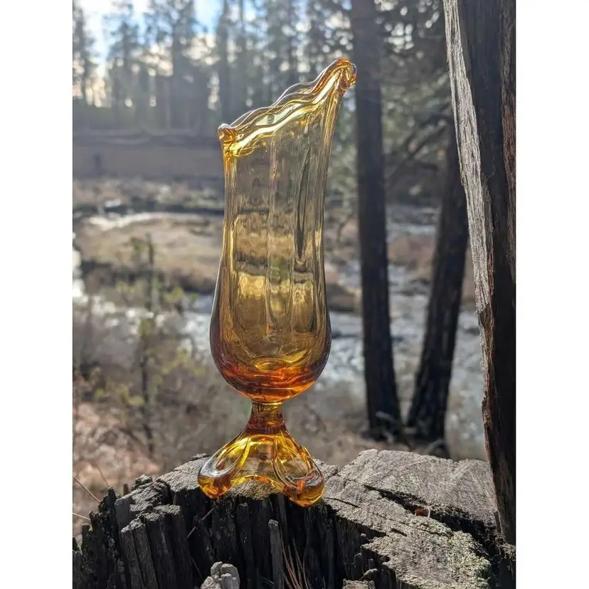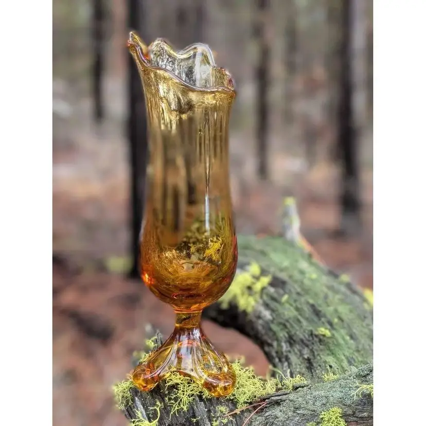 Vintage Amber glass swung draped vase with footed bottom. This is a stunning amber glass vase that is in pristine condition - no chips or cracks or water stains. This has a tri-footed sturdy bottom and a beautiful swing top. This is just about 11.5" tall at the tallest swung point and the widest part of the mouth is about 4". Excellent addition to any collection!