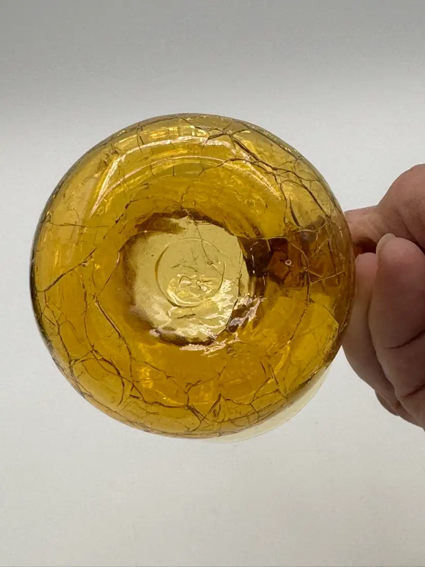 Type: Mid-Century Modern collectible art glass. Technique: Hand blown glass with a distinct crackle finish and a pontil mark on the bottom.