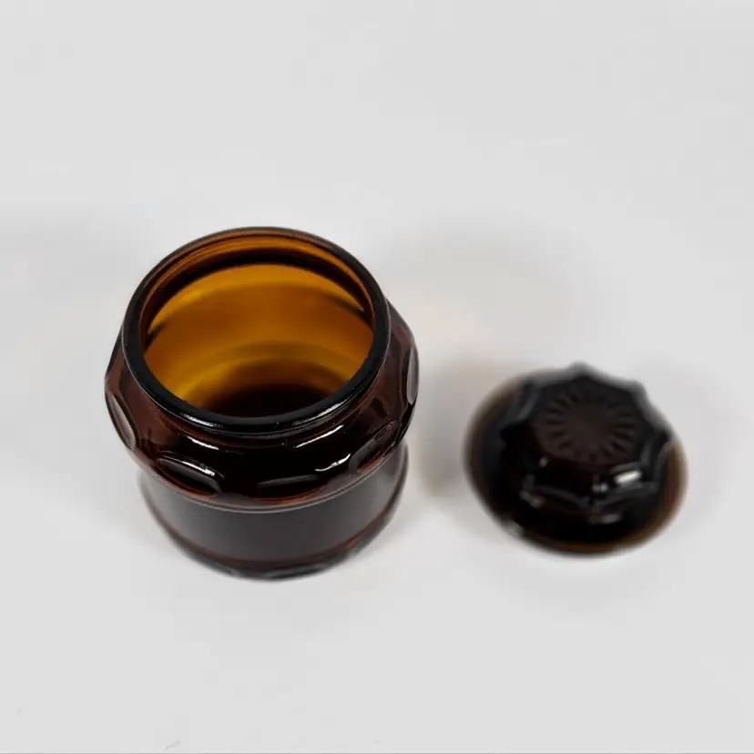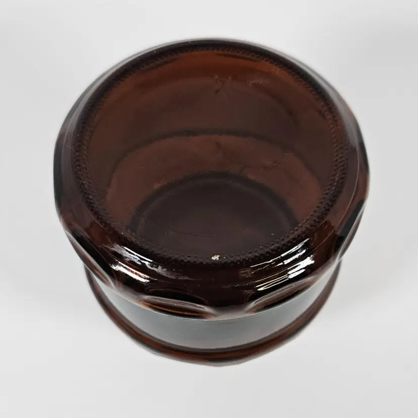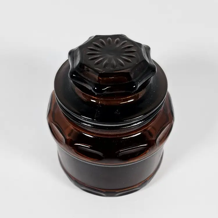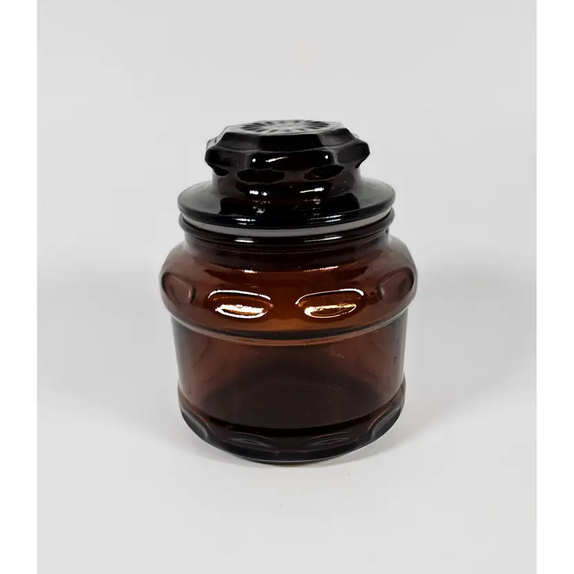 Adorable, dar amber jar with lid. No chips or cracks, very nice condition. Measures 4.25" tall x 3.5" in diameter. (Shelf 1)