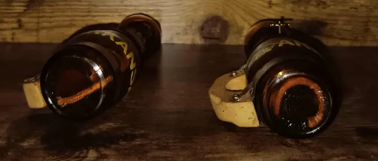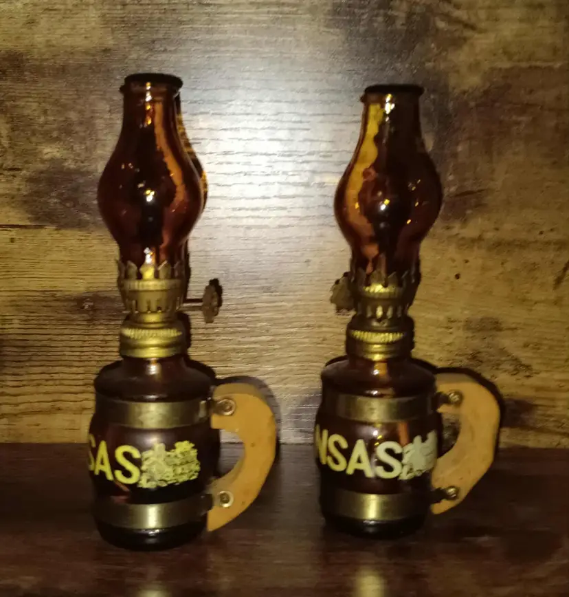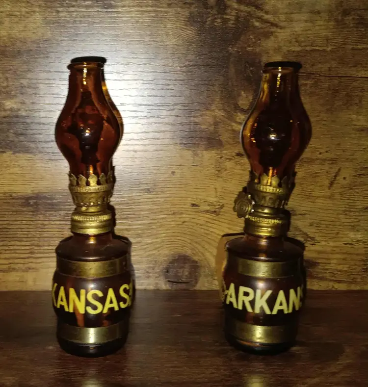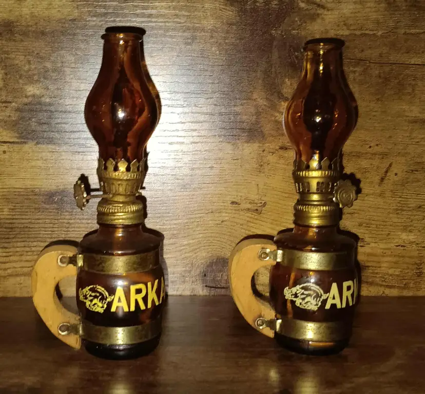 Vintage amber mini finger oil lamps set of 2 Arkansas themed. There is a cabin on one side and a Razorback on the other side with a wood handle. They are in good condition with no damages. They measure 6 inches tall.