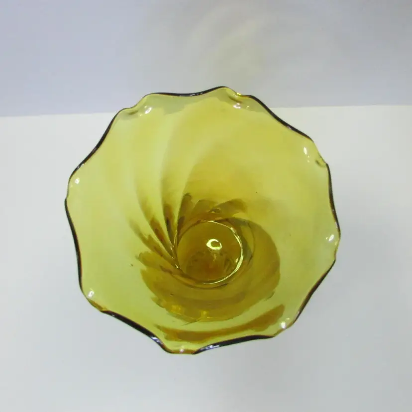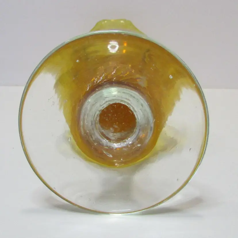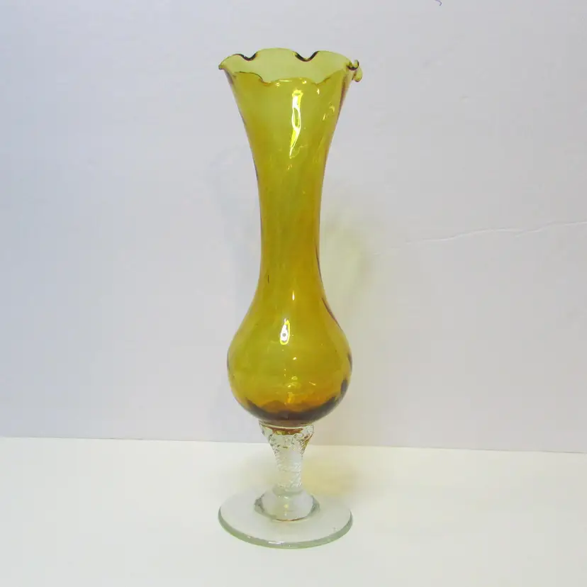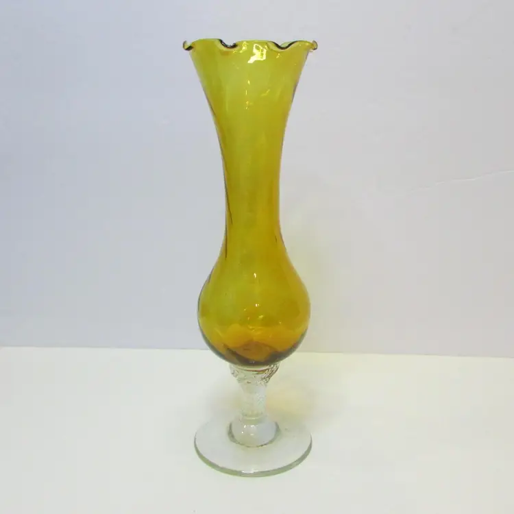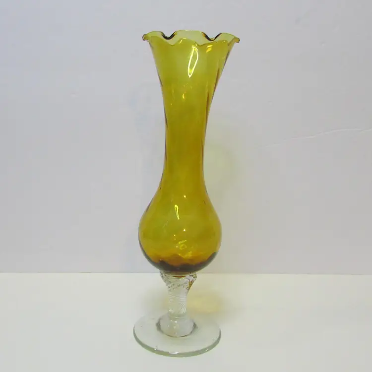 This lovely vase has some light wear from use (the top has a lean/tilt), but is still a nice piece to use and display. It is about 8" x 2 1/2" round.