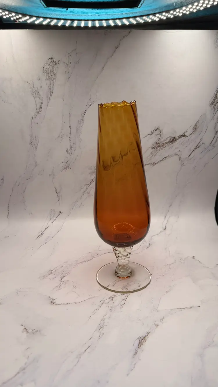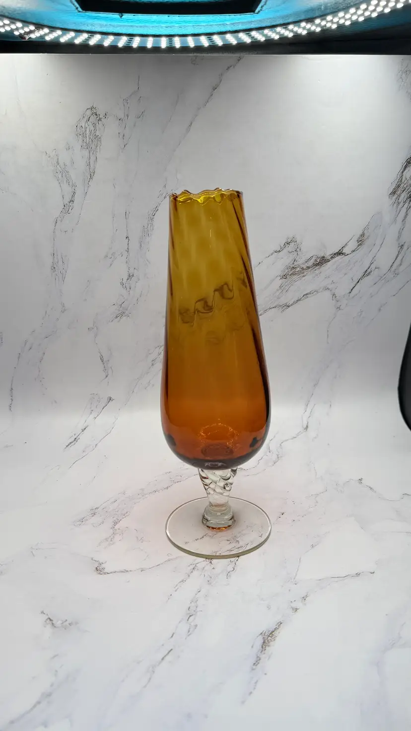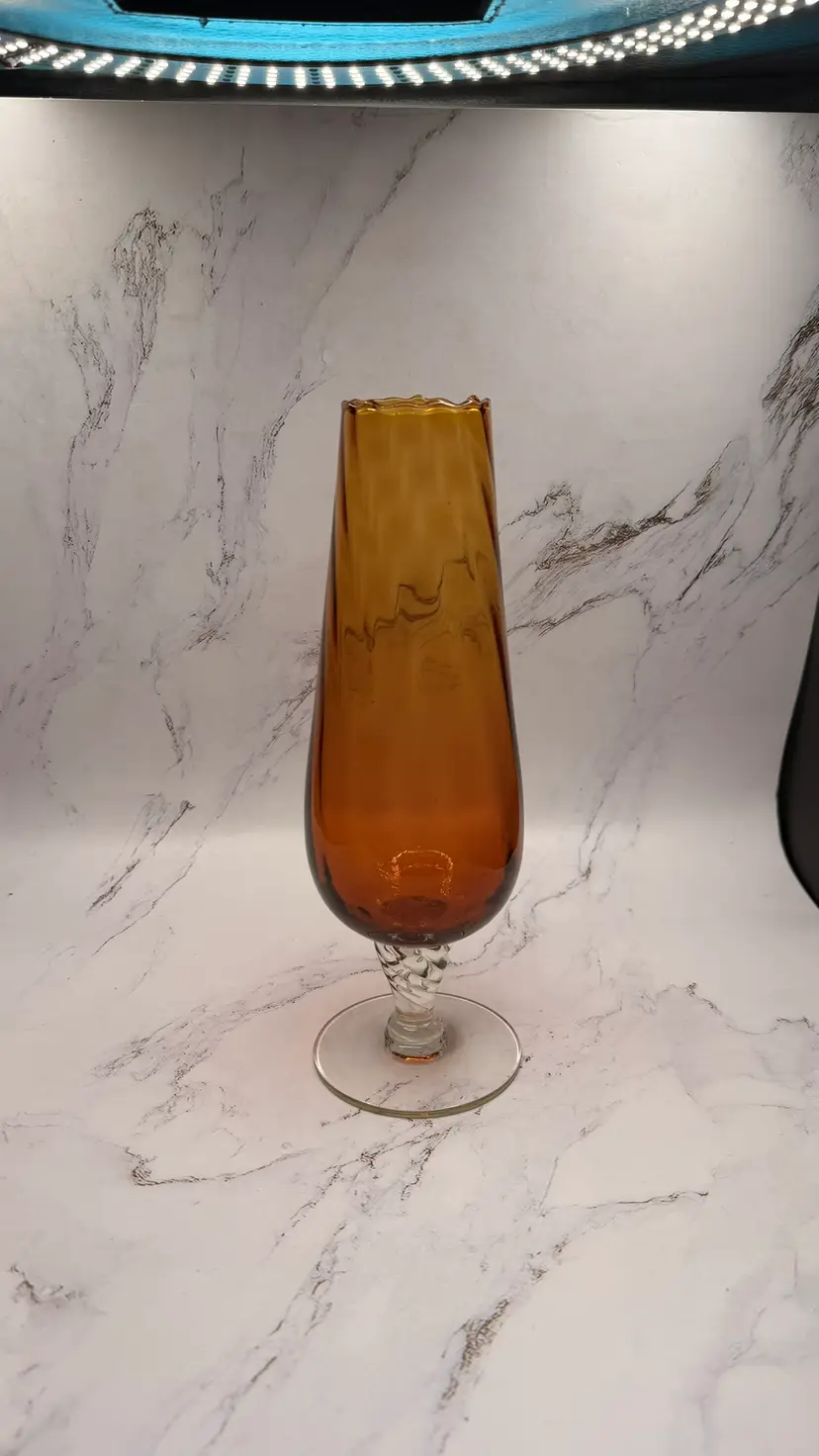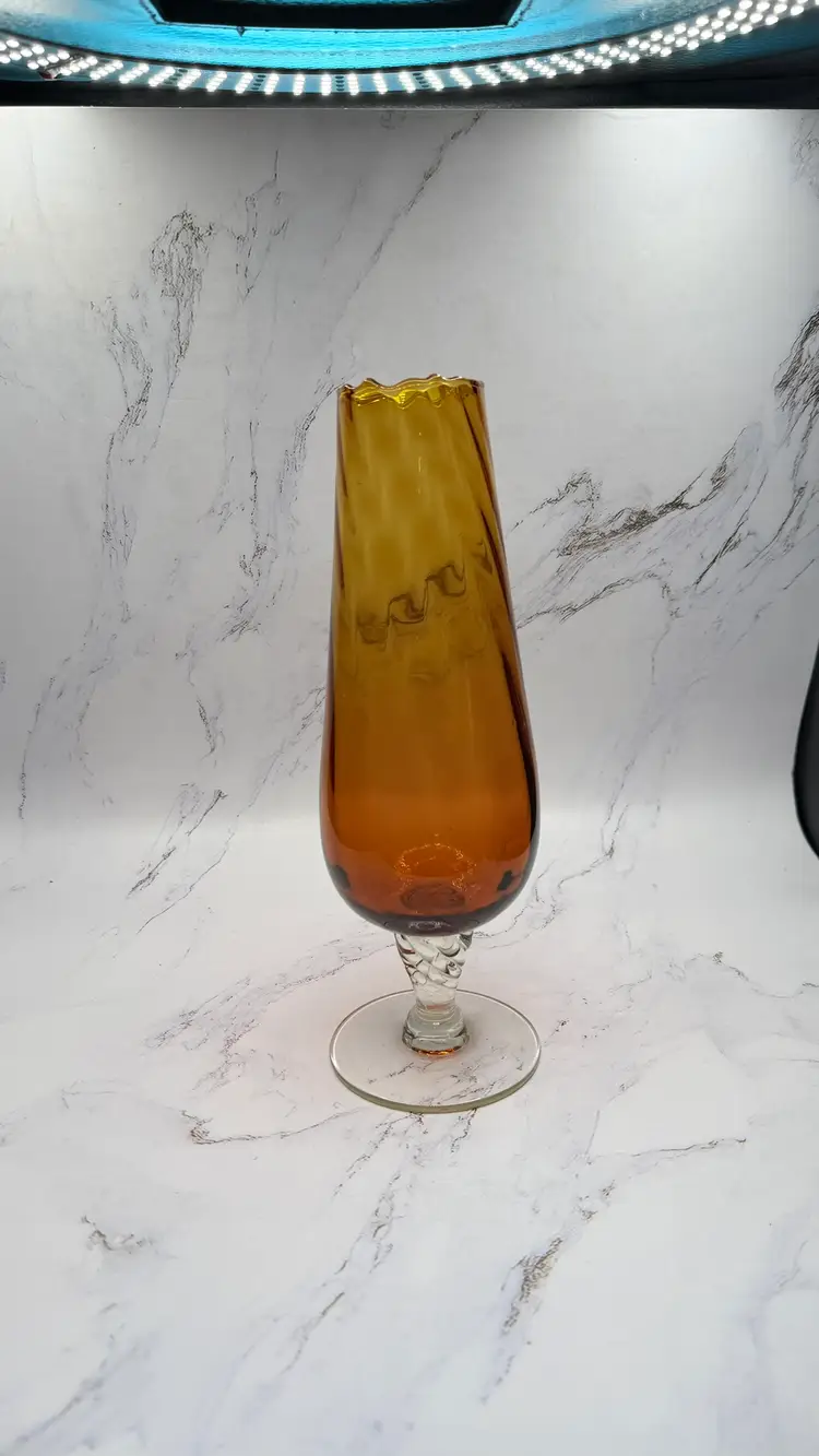 Vintage Amber Swung Glass Vase Clear Foot Twisted Stem MCM Mid Century. Light scratches from age/use. No cracks or chips. Measures approx.10" tall and base is approx. 3.25". Comes from a smoke free home. If you have any questions please feel free to contact me.