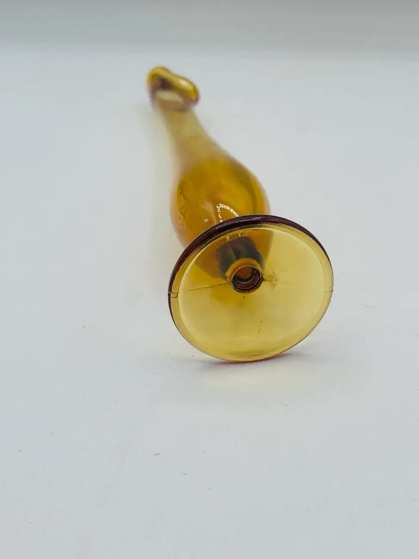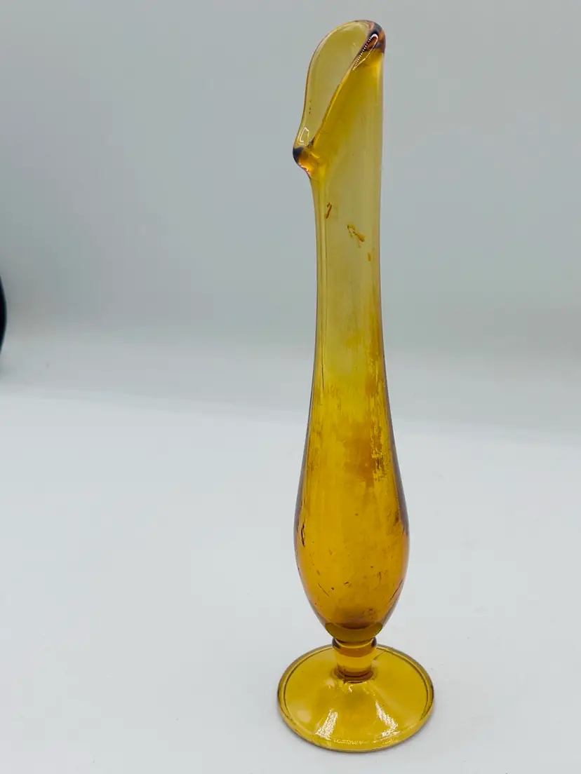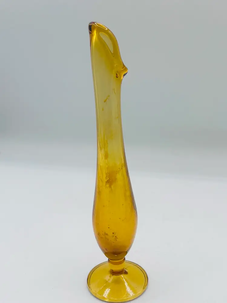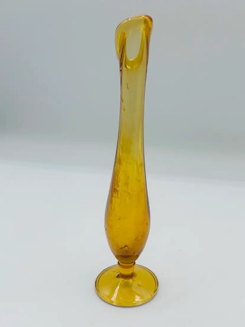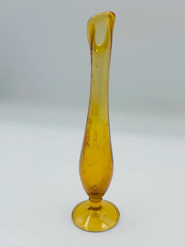 The Vintage Amber Swung Stretch Glass Bud Vase is a stunning piece of Mid-Century Modern decor, originating from America in the 1970s. Standing at 9 inches tall with a round base, this high-gloss vase features a glossy finish and a hand-blown production style. The abstract art design in a vibrant amber color makes it a unique and stylish addition to any collection, showcasing the artistry and craftsmanship of the era. This unmarked vase embodies the retro charm of the 1960s and 1970s, perfect for lovers of vintage decor and abstract art.
