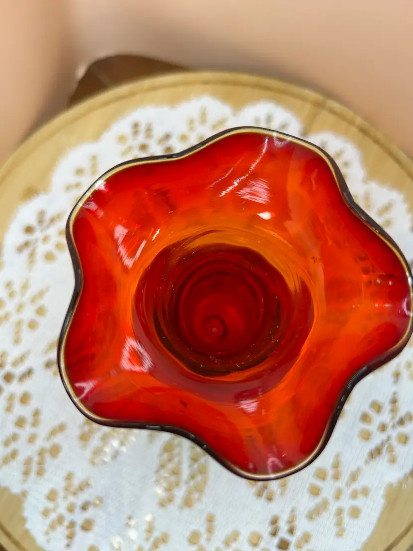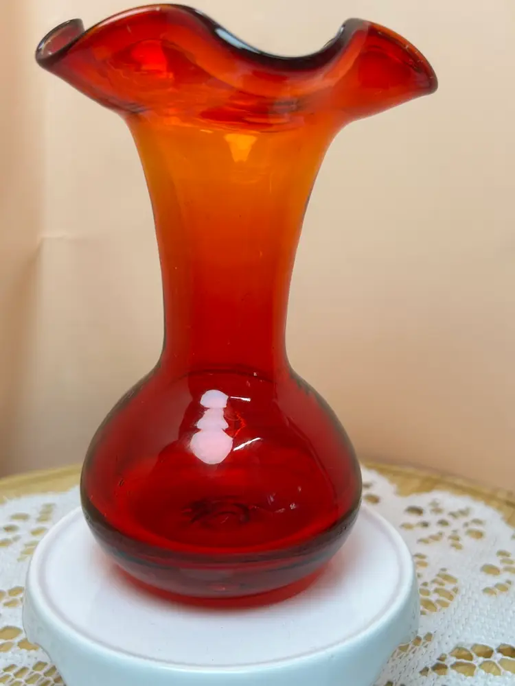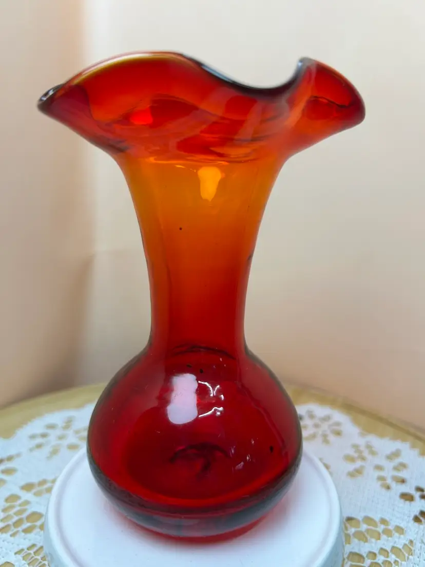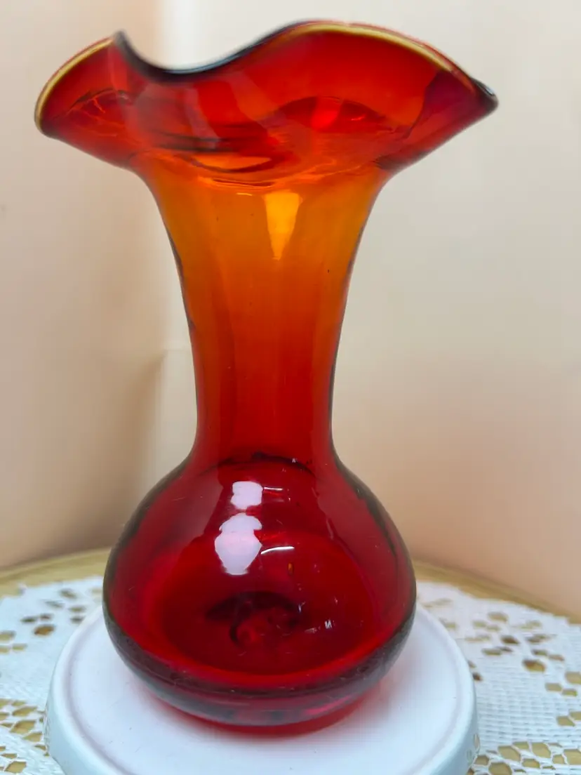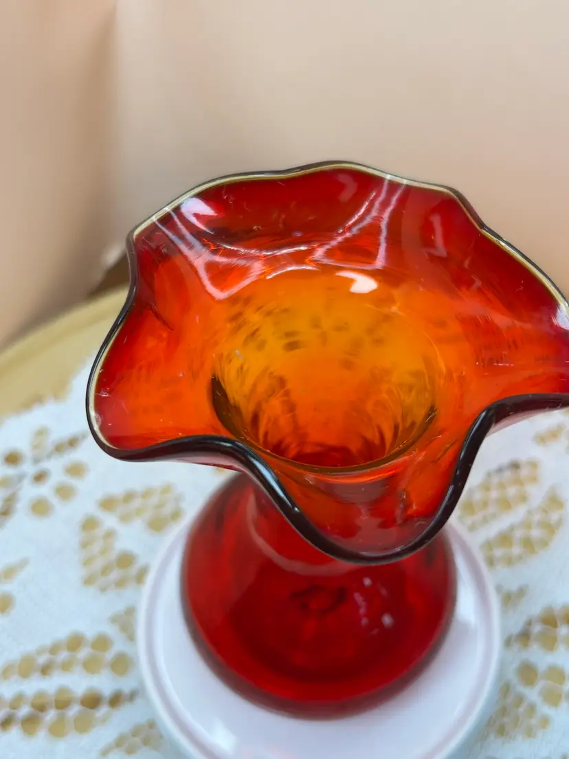 Vase is 5.25” tall, 3” diameter across widest part of ruffle, base 2.5” in diameter. Slightly rough pontil. Does not glow. Excellent condition.