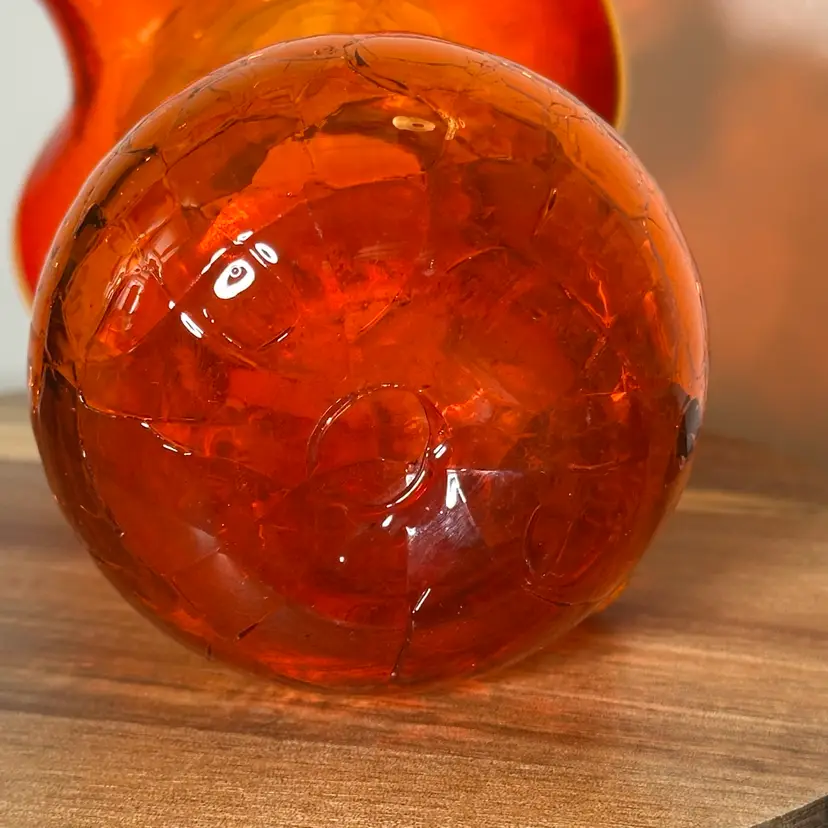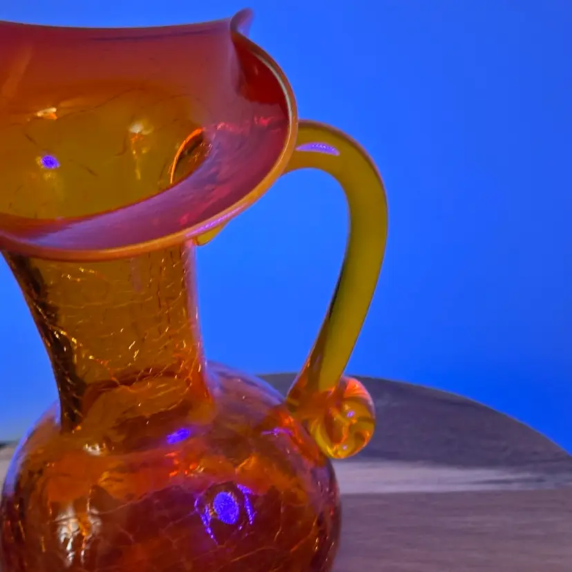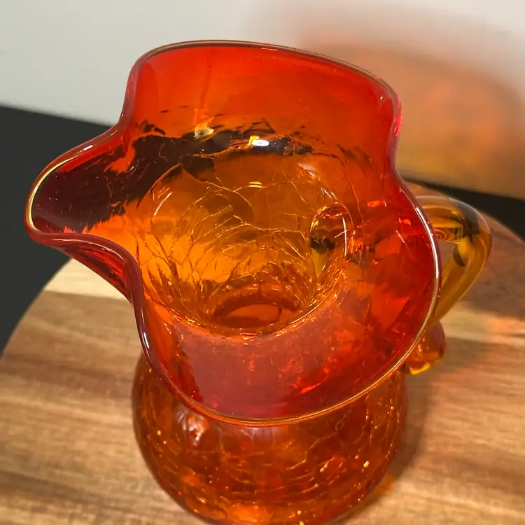 This item is a vintage art glass pitcher. Features a "crackle" finish achieved by dipping hot glass into cold water before reheating. Known as "Amberina," which graduates from red/orange to yellow. Typically hand-blown with a ruffled rim and an applied handle. Popular as a decorative collectible or small creamer pitcher.
