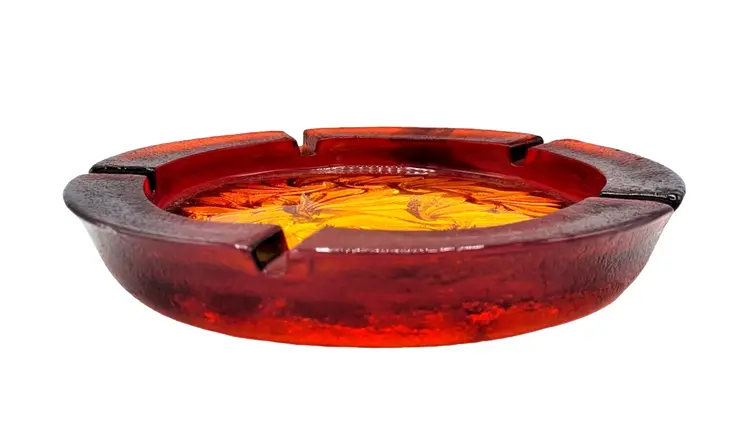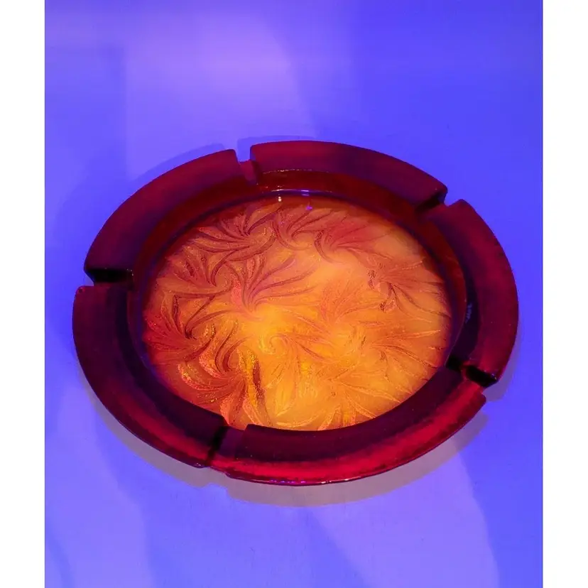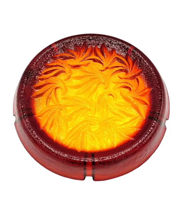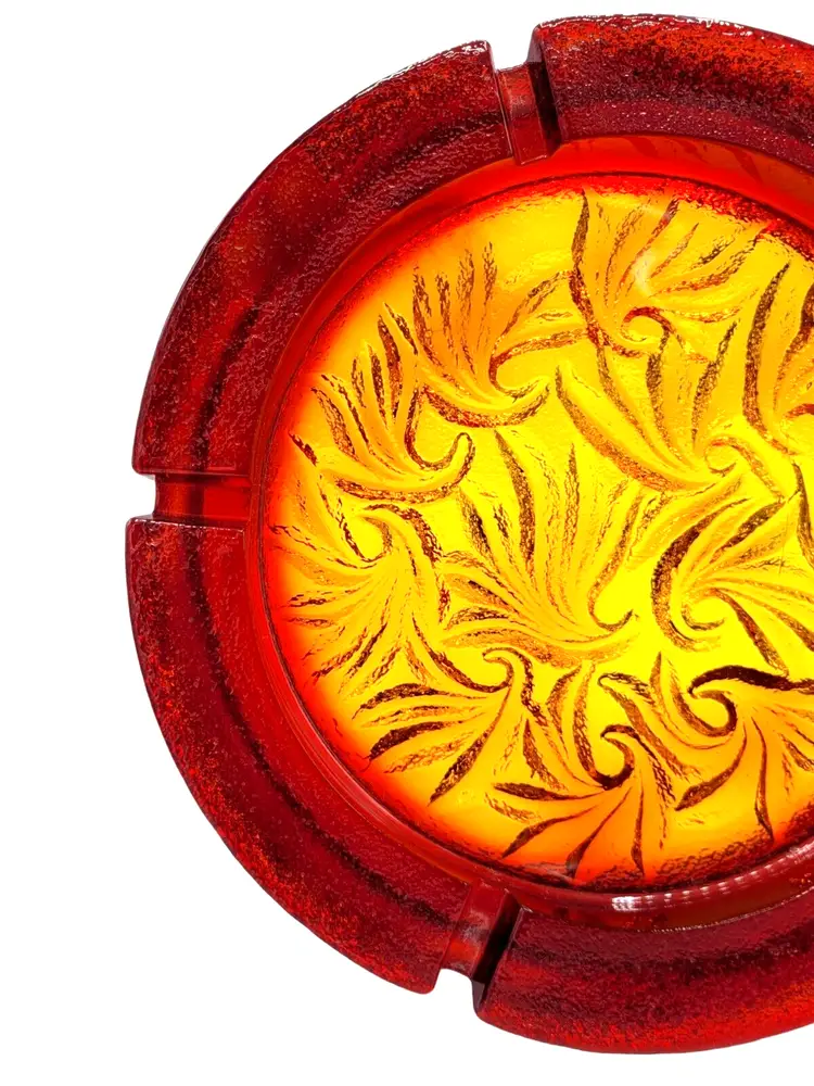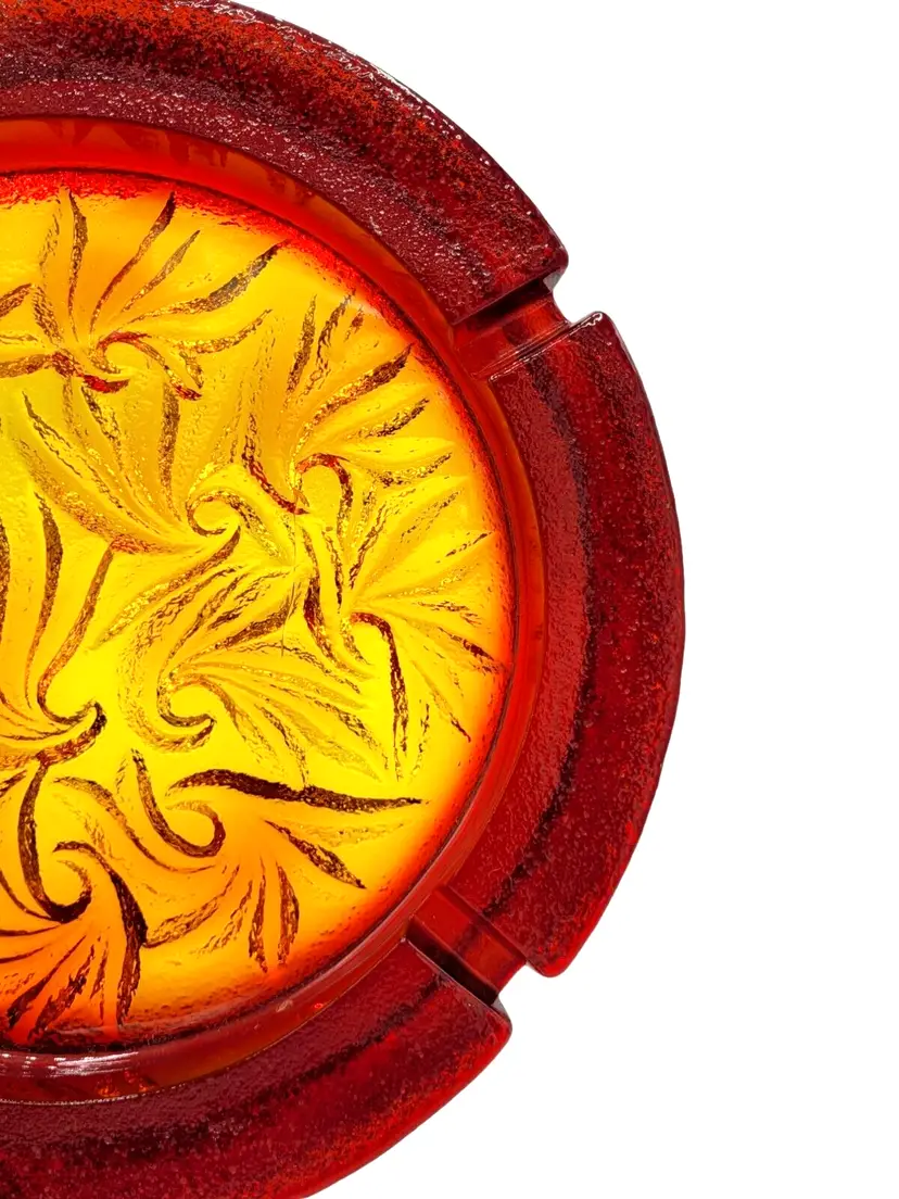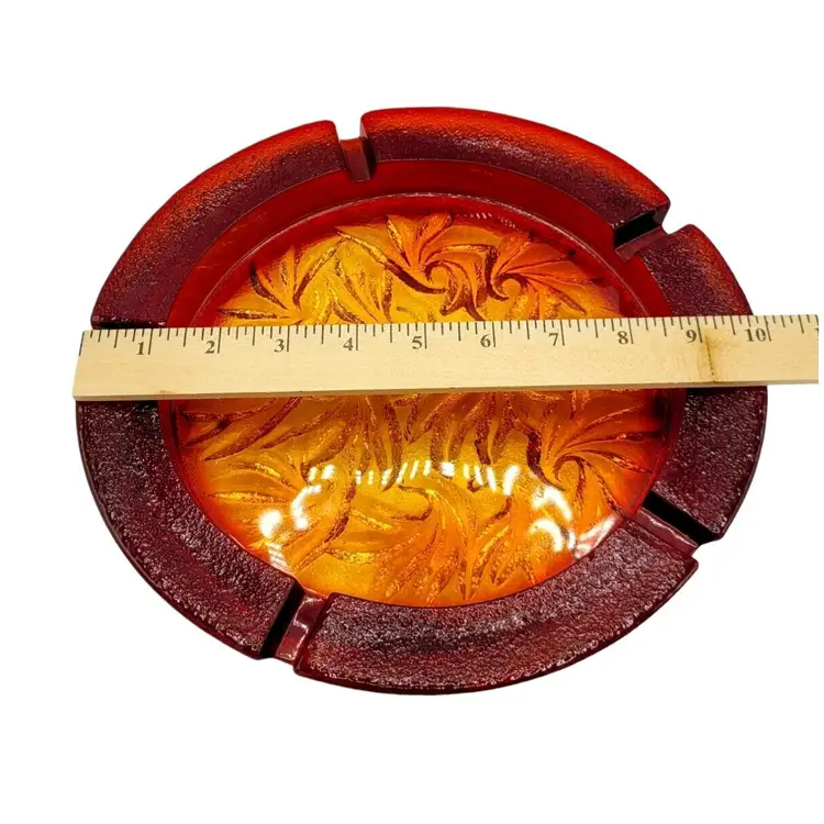 Deep leafy pattern impressed on the base. Amberina coloring, yellow fading to deep orange/red. Measures 10" in diameter, 1.5" tall. Stunning hippie relic and great conversation starter!