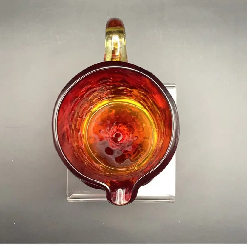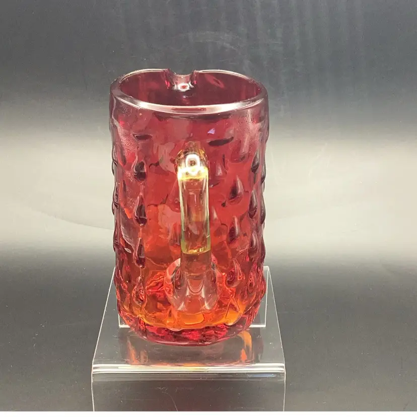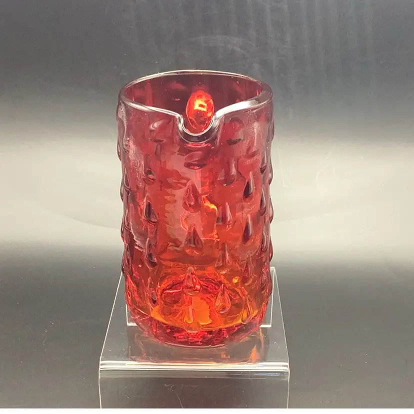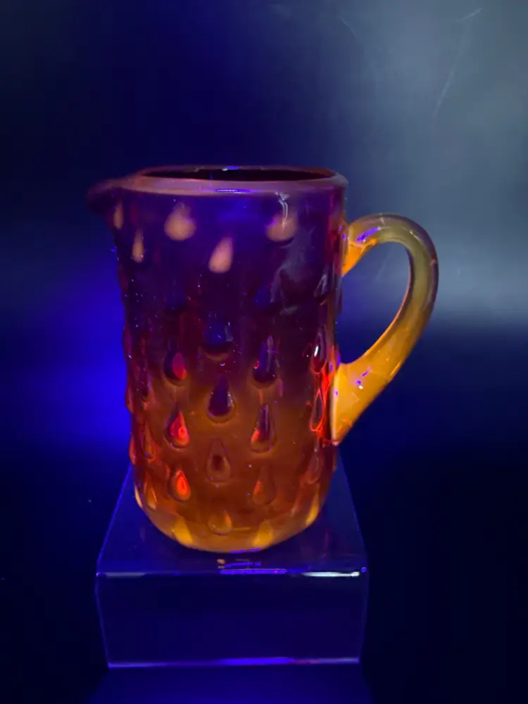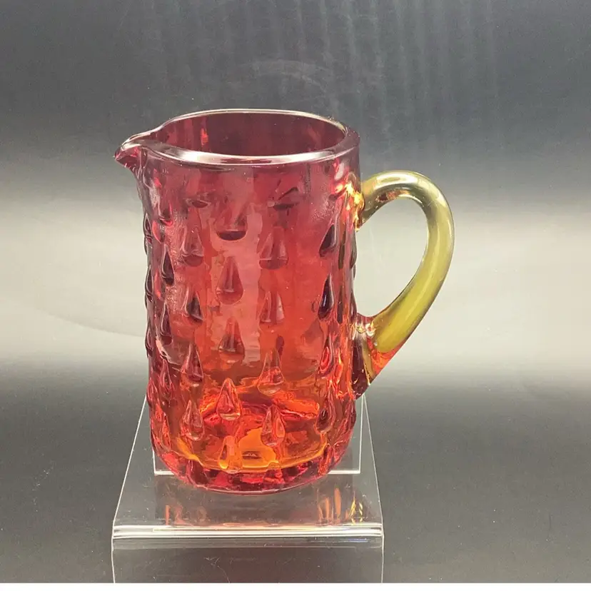 Vintage Amberina hobnail "teardrop" art glass pitcher. Hand-blown art glass produced in the mid-20th century. It has a glow orange or yellow under UV (black) light. Pre-owned condition - no chips, cracks or repairs.