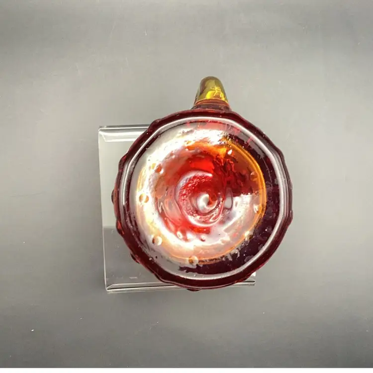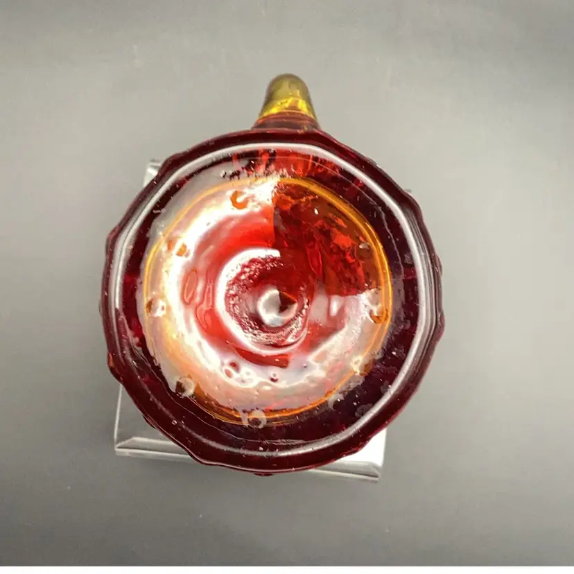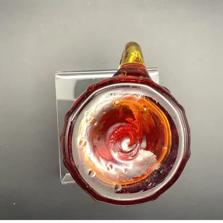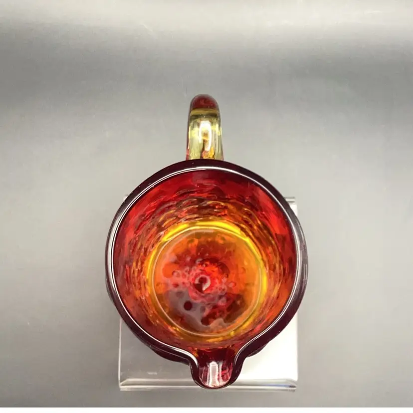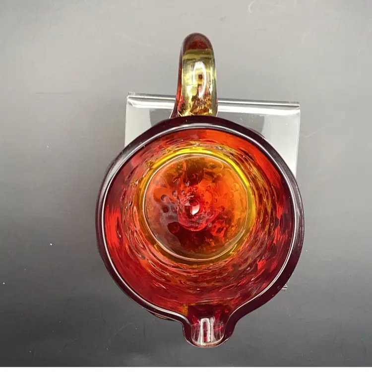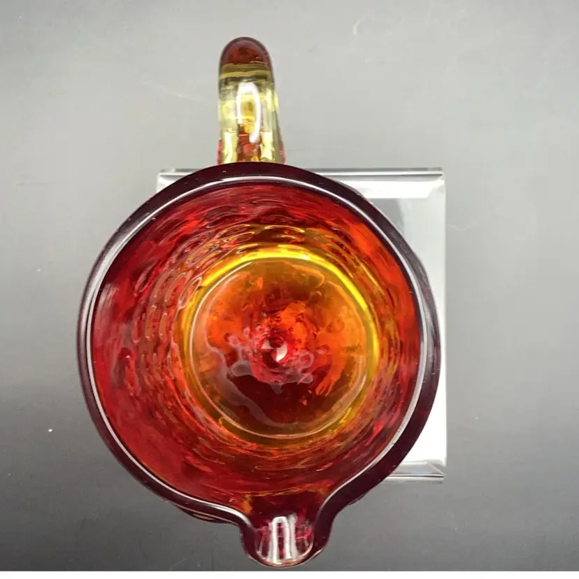 Vintage Amberina hobnail "teardrop" art glass pitcher. Hand-blown art glass produced in the mid-20th century. It has a glow orange or yellow under UV (black) light. Pre-owned condition - no chips, cracks or repairs.