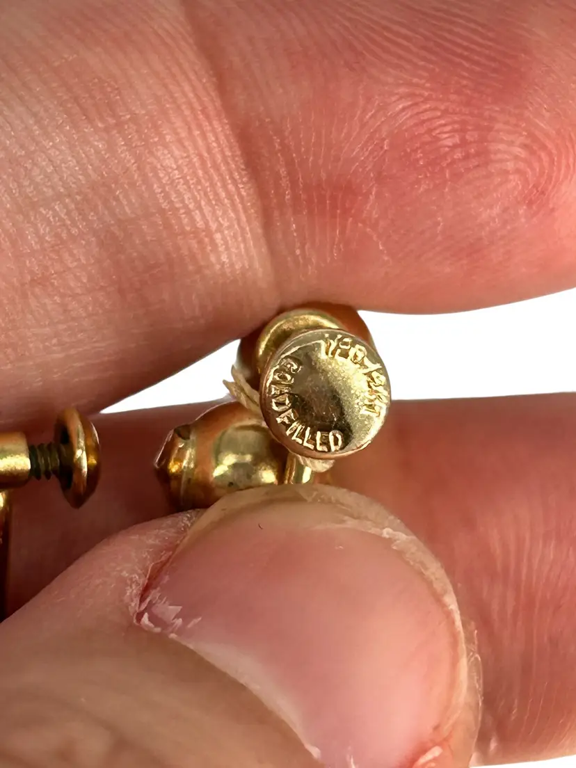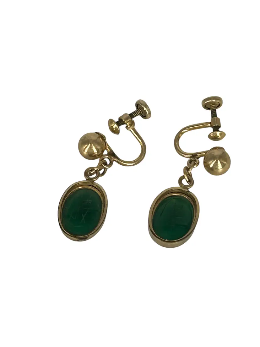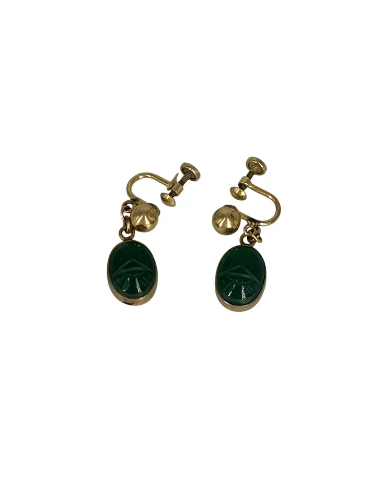Vintage Amco Gold Filled Chrysoprase Carved Scarab Screw Back Earrings. These beautiful earrings feature detailed carved scarabs made from chrysoprase, set in a classic gold-filled screw-back design. Good pre-owned condition. Perfect for collectors of vintage jewelry or those who appreciate unique, timeless pieces.