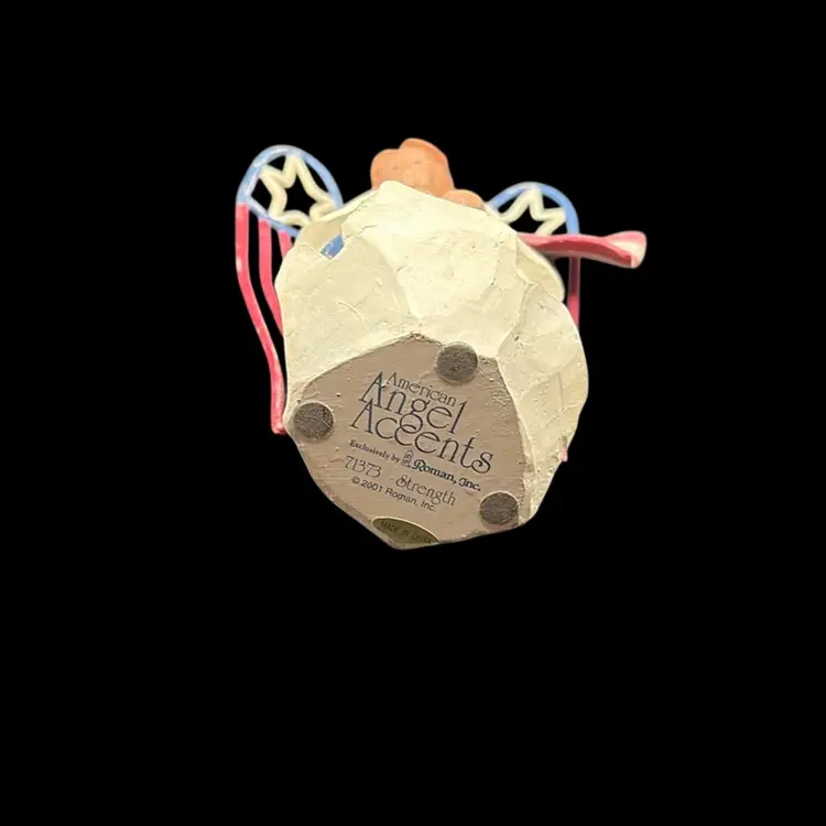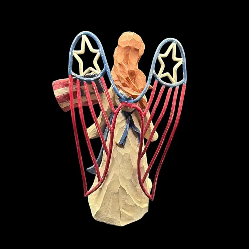 Angel figurine made of resin and features a carved, folk-art style look. 7.25” tall